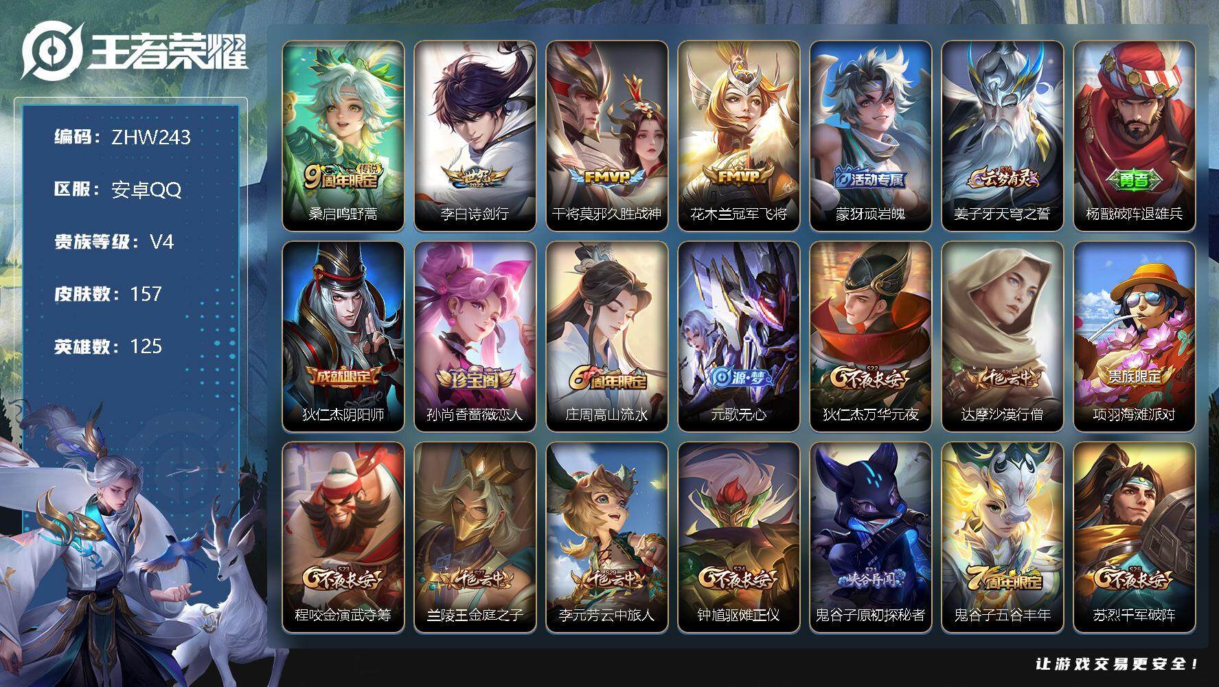 [12159443]【特价急出/详情看图】:安卓Q-V4-永恒钻石III段位-125英雄-157皮肤-4传说-40史诗 【传说皮肤】:桑启鸣野蒿,李白诗剑行,干将莫邪久胜战神,花木兰冠军飞将 【限定皮肤】:蒙犽顽岩魄,姜子牙天穹之誓,杨戬破阵退雄兵,狄仁杰阴阳师,孙尚香蔷薇恋人,庄周高山流水,元歌无心,狄仁杰万华元夜,达摩沙漠行僧,项羽海滩派对,程咬金演武夺筹,兰陵王金庭之子,李元芳云中旅人,钟馗驱傩正仪,鬼谷子原初探秘者,鬼谷子五谷丰年,苏烈千军破阵,百里玄策原初追逐者,梦奇顽趣,沈梦溪大漠名商,裴擒虎擒涛扼浪,猪八戒猪悟能,上官婉儿梁祝,鲁班大师探海日志,桑启海盐诗旅,艾琳女武神,阿古朵江河有灵,张良古海寻踪,蒙恬荣光圣徽,鬼谷子天穹祈灯,沈梦溪龙舞盛年,刘邦剑破天穹,程咬金群星魔术团,海诺心动手记,周瑜熔金海岸 【赛季限定】:狄仁杰万华元夜,达摩沙漠行僧,程咬金演武夺筹,兰陵王金庭之子,张良古海寻踪,李元芳云中旅人,钟馗驱傩正仪,鬼谷子原初探秘者,苏烈千军破阵,百里玄策原初追逐者,梦奇顽趣,沈梦溪大漠名商,裴擒虎擒涛扼浪,鲁班大师探海日志,桑启海盐诗旅,鬼谷子天穹祈灯,蒙恬荣光圣徽,刘邦剑破天穹,姜子牙天穹之誓 【史诗皮肤】:鲁班七号电玩小子,露娜紫霞仙子,阿轲暗夜猫娘,赵云未来纪元,甄姬冰雪圆舞曲,廉颇地狱岩魂,宫本武藏鬼剑武藏,孙尚香蔷薇恋人,孙尚香水果甜心,妲己女仆咖啡,墨子金属风暴,刘禅绅士熊喵,张飞乱世虎臣,花木兰水晶猎龙者,小乔缤纷独角兽,兰陵王暗隐猎兽者,亚瑟心灵战警,雅典娜冰冠公主,安琪拉心灵骇客,百里守约特工魅影,李元芳逐浪之夏,程咬金功夫厨神,阿轲节奏热浪,伽罗箭羽风息,狄仁杰鹰眼统帅,公孙离无限星赏官,上官婉儿梁祝,百里玄策原初追逐者,猪八戒猪悟能,庄周高山流水,鬼谷子五谷丰年,元歌无心,梦奇顽趣,刘禅电玩爆裂旋风,阿古朵江河有灵,蒙恬荣光圣徽,海诺心动手记,蒙犽顽岩魄,大司命东方月初,牛魔星界战将 【其他皮肤】:项羽海滩派对,韩信教廷特使,达摩大发明家,赵云白执事,赵云忍炎影,芈月红桃皇后,艾琳女武神,白起白色死神,扁鹊化身博士,扁鹊救世之瞳,宫本武藏未来纪元,妲己少女阿狸,典韦黄金武士,张飞五福同心,宫本武藏万象初新,狄仁杰阴阳师,钟无艳海滩丽影,老夫子功夫老勺,孙尚香沉稳之力,诸葛亮掌控之力,李白敏锐之力,鬼谷子幻乐之宴,大乔守护之力,明世隐虹云星官