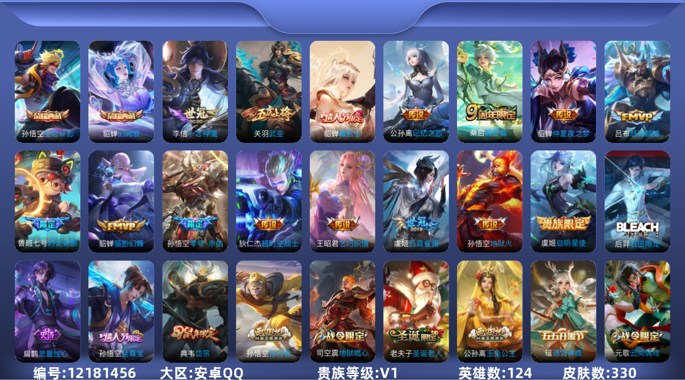 - [12062831]V8 1典藏 12传说 120英雄 227皮肤 可修改实名 优质装备:杀手不太冷,黄金狮子座,黄金射手座,绛天战甲(鸡嘴战神),黄金白羊座,零号·赤焰,胖达荣荣,李逍遥,无双飞将 珍宝阁皮:优雅恋人,玩趣恶龙 限定皮:白晶晶,神威(电光马子),遇见飞天,高山流水,五谷丰年,武圣,天狼运算者,梁祝,御风骁将(吕布年限),岱宗(典韦年限),奔雷神使(牛魔年限),祈雪灵祝(雪兔子),李小龙,霸王别姬-项羽,霸王别姬-虞姬,默契交锋-兰陵王,默契交锋-花木兰,大圣娶亲,冰霜恋舞曲,神奇女侠,匿光追影者 史诗皮:白龙吟,特工魅影,江河有灵,鹤归松栖(赵怀真),魅语,百解令(蒙犽),蒙恬荣光圣徽,冰冠公主,偶像歌手,晚萤,电玩·爆裂旋风,龙骑士(小龙虾),末日机甲-吕布,猫狗日记-孙策,猫狗日记-大乔,乱世虎臣,节奏热浪,修罗,摇滚巨星,水果甜心,天才门将,星夜王子,功夫厨神,德古拉伯爵,暗隐猎兽者,幽灵船长,鬼剑武藏,心灵战警,舞动绿茵,地狱岩魂,纤云弄巧,繁星吟游(呼啦呼啦),拒霜思,缤纷独角兽,乘风破浪,逐浪之夏,水晶猎龙者,箭羽风息,金属风暴,原初追逐者,圣诞狂欢,圣诞恋歌,鹰眼统帅,暗夜贵公子,黎明之约,未来纪元-赵云
