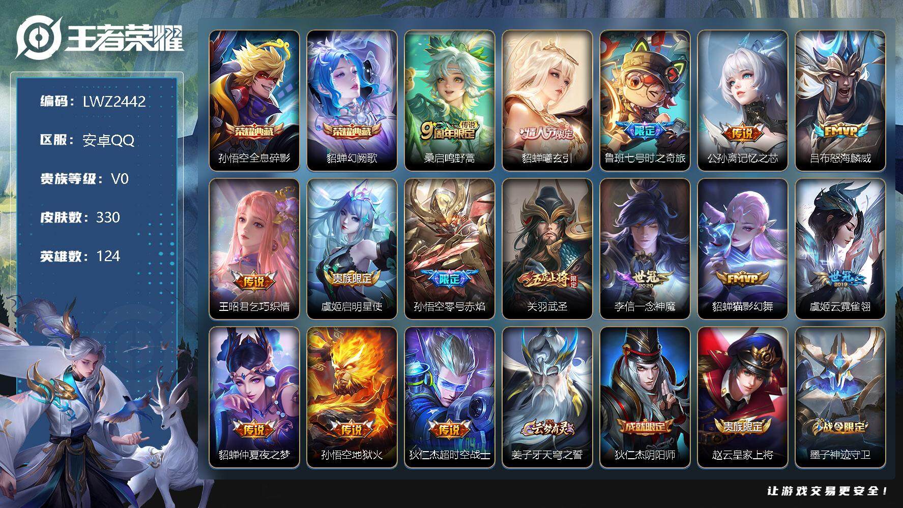 [12181456]【特价急出/详情看图】:安卓Q-V0-至尊星耀IV段位-124英雄-330皮肤-2典藏-15传说-92史诗 【荣耀典藏】:孙悟空全息碎影,貂蝉幻阙歌 【传说皮肤】:桑启鸣野蒿,貂蝉曦玄引,鲁班七号时之奇旅,公孙离记忆之芯,吕布怒海麟威,王昭君乞巧织情,虞姬启明星使,孙悟空零号赤焰,关羽武圣,李信一念神魔,貂蝉猫影幻舞,虞姬云霓雀翎,貂蝉仲夏夜之梦,孙悟空地狱火,狄仁杰超时空战士 【限定皮肤】:姜子牙天穹之誓,狄仁杰阴阳师,赵云皇家上将,墨子神迹守卫,鲁班七号时之奇旅,庄周高山流水,高渐离玩趣恶龙,阿轲迷踪丽影,钟无艳超时空战士,扁鹊奇幻香踪,白起夜都怪侠,芈月幻夜卜梦,元歌云间偶戏,元歌无心,夏侯惇朔风刀,甄姬落雪兰心,典韦岱宗,狄仁杰魔术师,狄仁杰万华元夜,达摩星际陆战队,达摩沙漠行僧,项羽海滩派对,老夫子圣诞老人,老夫子醍醐杖,老夫子航海奇遇记,关羽武圣,程咬金演武夺筹,王昭君凤凰于飞,王昭君午后时光,兰陵王金庭之子,亚瑟潮玩骑士王,孙悟空至尊宝,孙悟空零号赤焰,孙悟空孙行者,后羿圣弓游侠,李元芳匿光侦查者,李元芳云中旅人,虞姬启明星使,钟馗驱傩正仪,杨戬潮玩骑兵,干将莫邪真爱魔法,雅典娜单词大作战,雅典娜黎明之约,太乙真人华丽摇滚,鬼谷子原初探秘者,鬼谷子五谷丰年,黄忠火炮绅士,苏烈千军破阵,弈星混沌棋,梦奇顽趣,公孙离玉兔公主,沈梦溪大漠名商,明世隐疑决卦,明世隐吟游魔法,裴擒虎李小龙,裴擒虎擒涛扼浪,狂铁电玩高手,米莱狄胡桃异想国,云中君纤云弄巧,云中君时之祈愿,猪八戒猪悟能,嫦娥拒霜思,嫦娥暖冬兔眠,西施玲珑珍味,蒙犽狂想玩偶喵,鲁班大师匿光启智者,鲁班大师探海日志,桑启海盐诗旅,金蝉唐三藏,暃星界游侠,戈娅驭风魔法,艾琳女武神,艾琳流音漫舞,司空震地狱燃心,阿古朵江河有灵,张良古海寻踪,蒙犽百解令,高渐离燃音魔法,妲己灵卜魔法,鬼谷子天穹祈灯,伽罗琥珀纪元,貂蝉曦玄引,沈梦溪龙舞盛年,李元芳蔬乡物语,刘邦剑破天穹 【年限皮肤】:王昭君凤凰于飞,典韦岱宗,关羽武圣 【赛季限定】:夏侯惇朔风刀,狄仁杰万华元夜,达摩沙漠行僧,老夫子醍醐杖,程咬金演武夺筹,兰陵王金庭之子,张良古海寻踪,李元芳云中旅人,钟馗驱傩正仪,雅典娜黎明之约,鬼谷子原初探秘者,苏烈千军破阵,弈星混沌棋,梦奇顽趣,沈梦溪大漠名商,明世隐疑决卦,裴擒虎擒涛扼浪,鲁班大师探海日志,桑启海盐诗