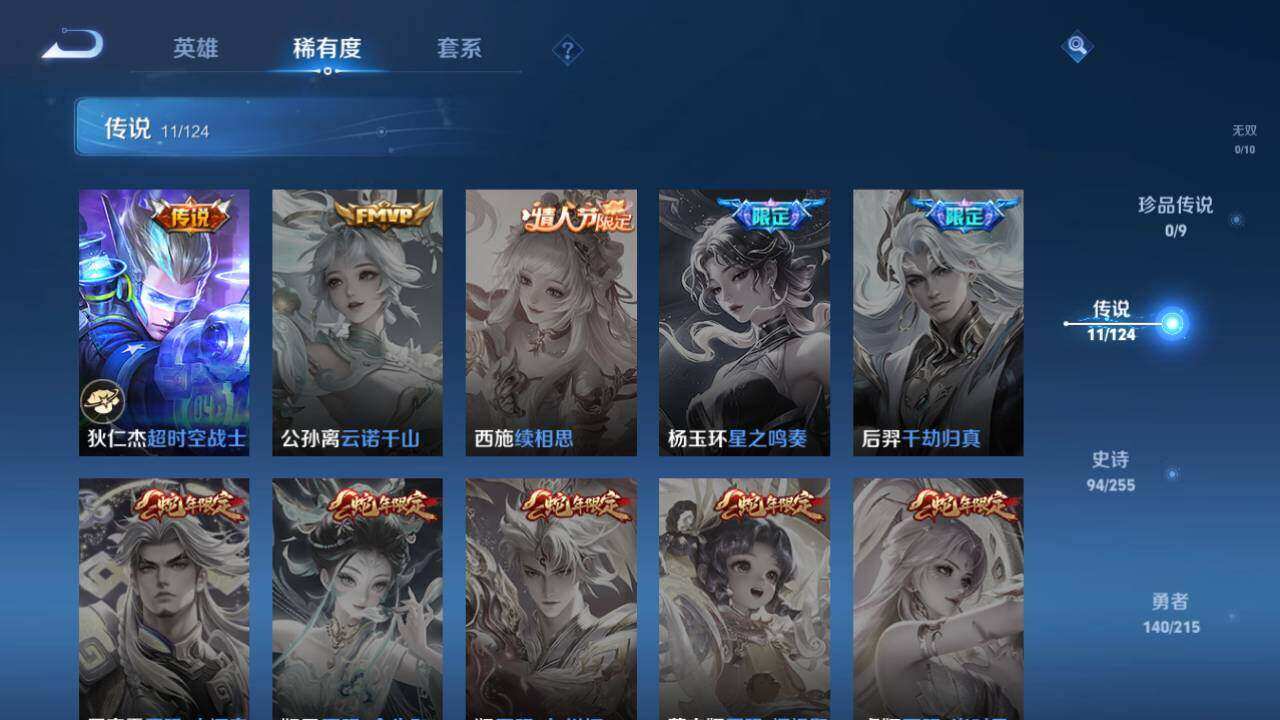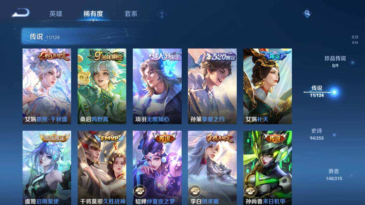 【传说皮肤】:女娲愿照千秋盛,桑启鸣野蒿,项羽无限倾心,孙策挚爱之约,女娲补天,虞姬启明星使,干将莫邪久胜战神,貂蝉仲夏夜之梦,李白凤求凰,孙尚香末日机甲,狄仁杰超时空战士