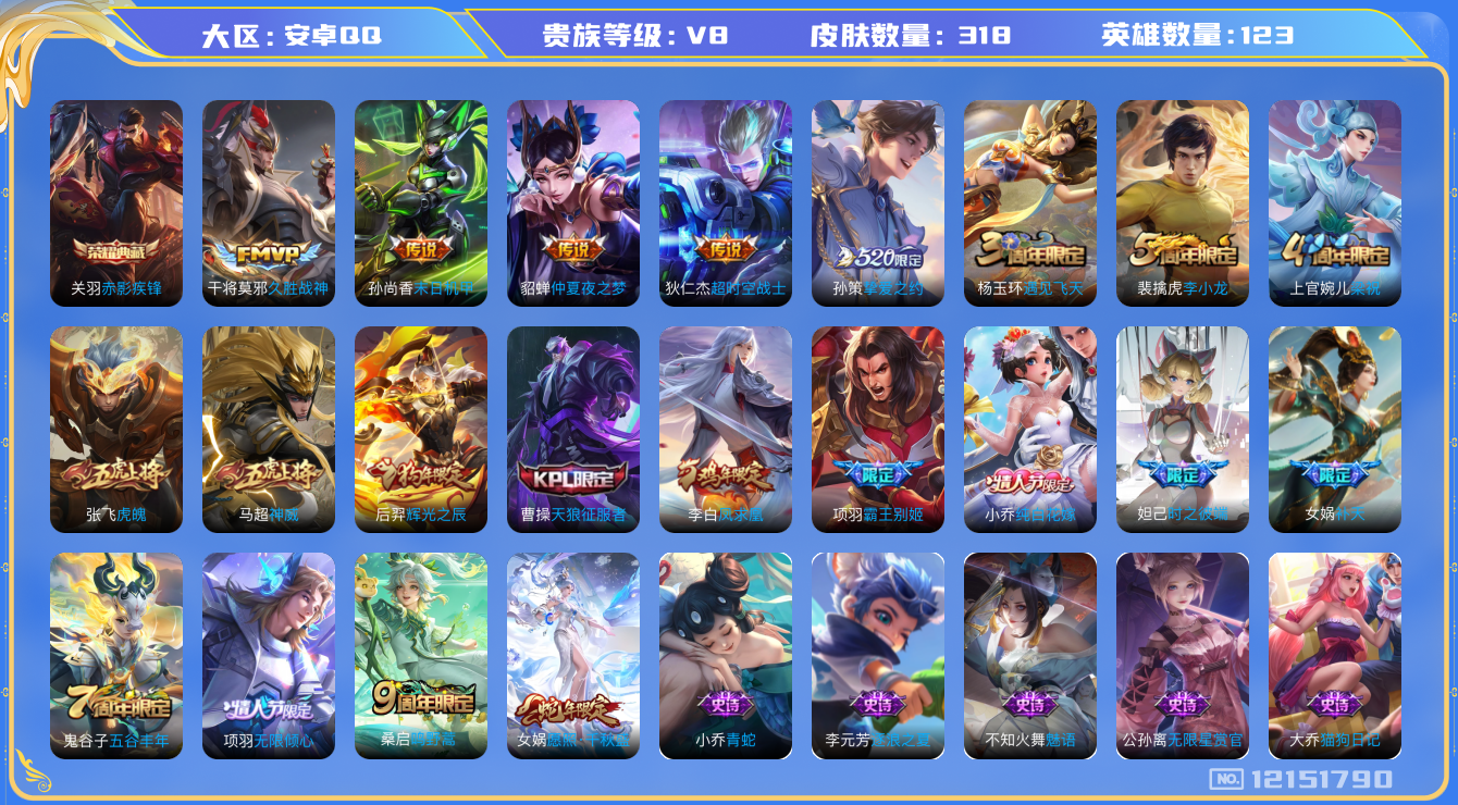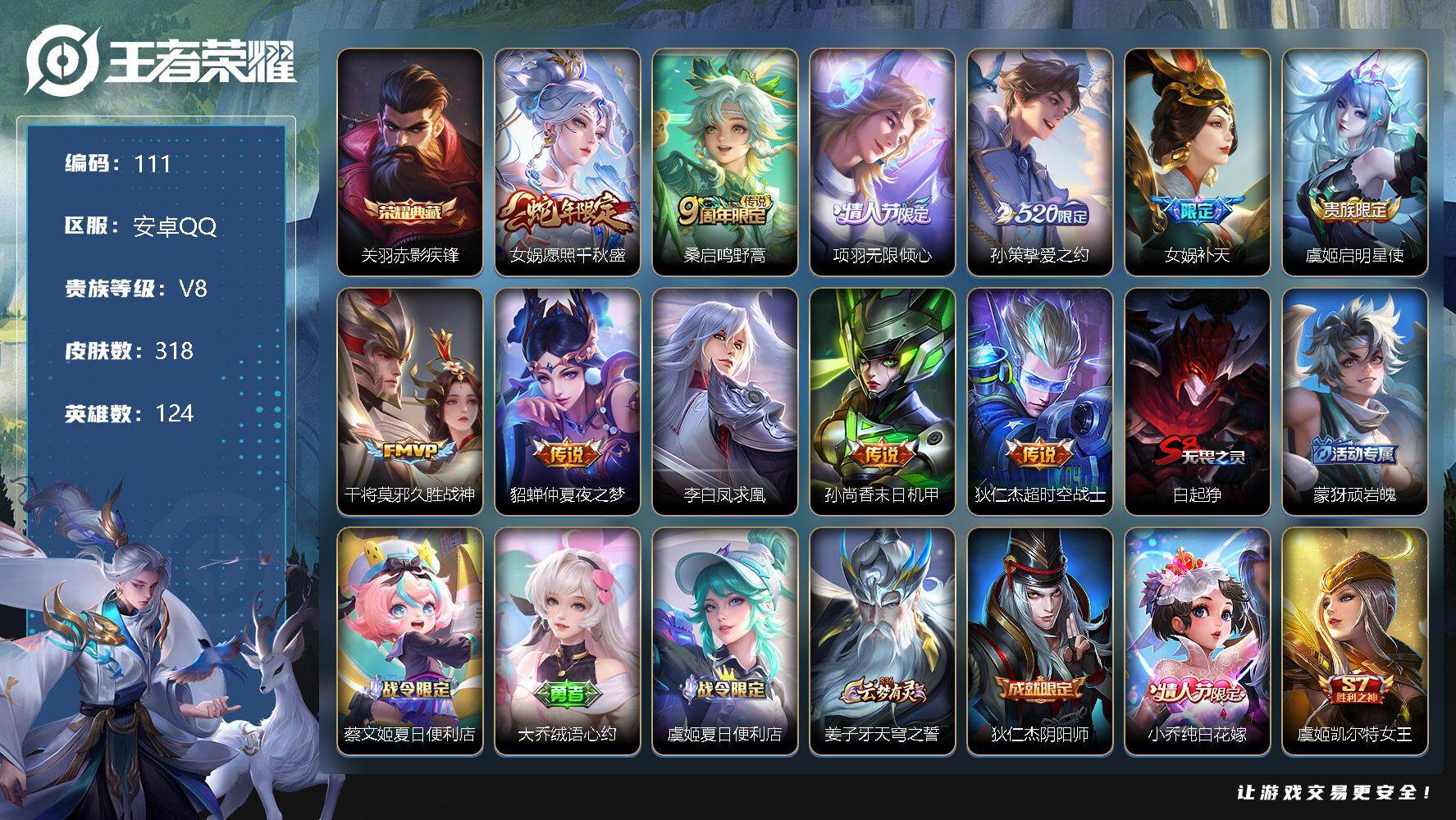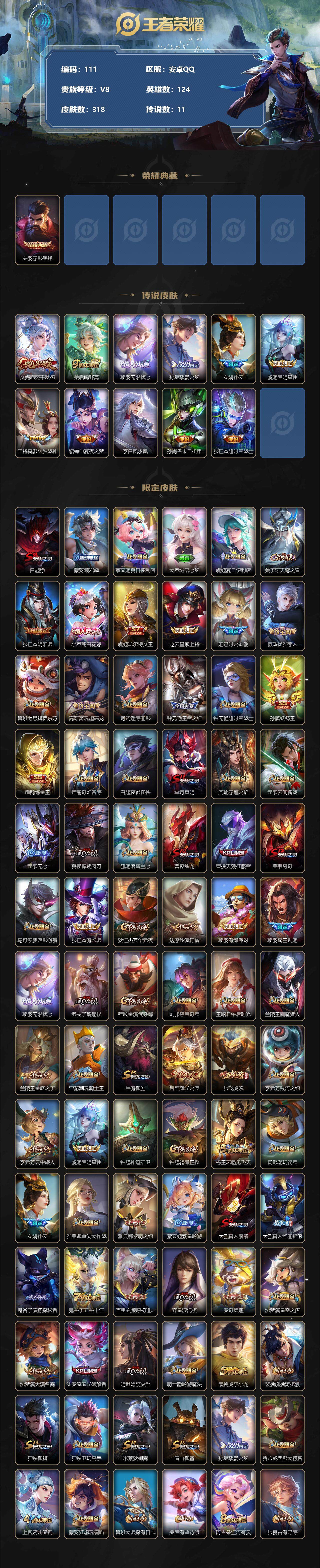 [12151790]【商品标题】:安卓Q-V8-永恒钻石I段位-124英雄-318皮肤-1典藏-0珍品无双-0无双-0珍品传说-11传说-94史诗
