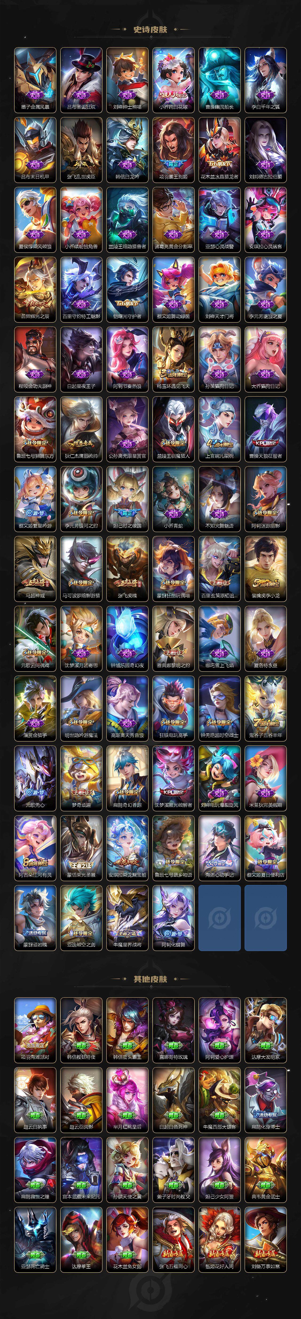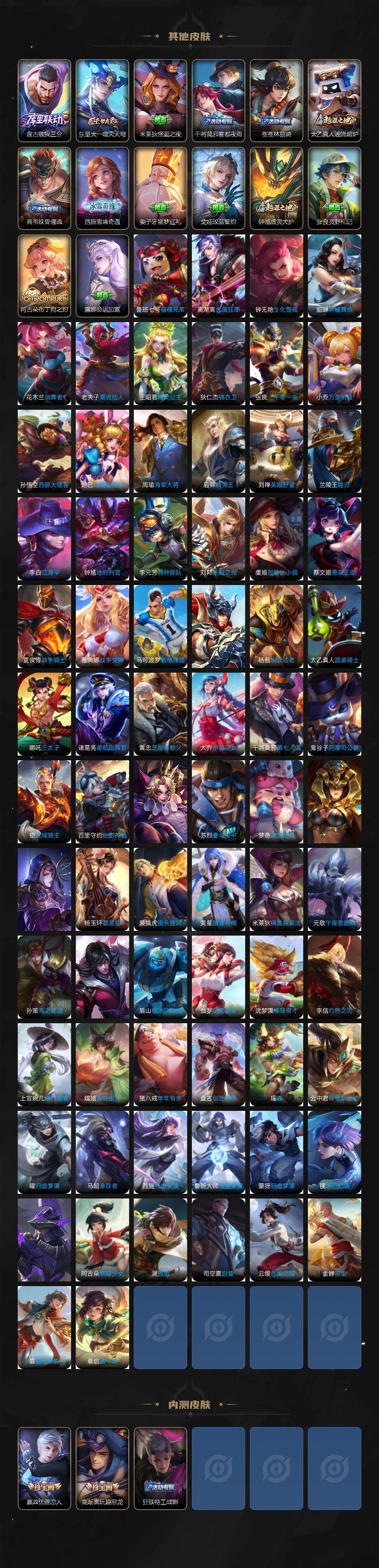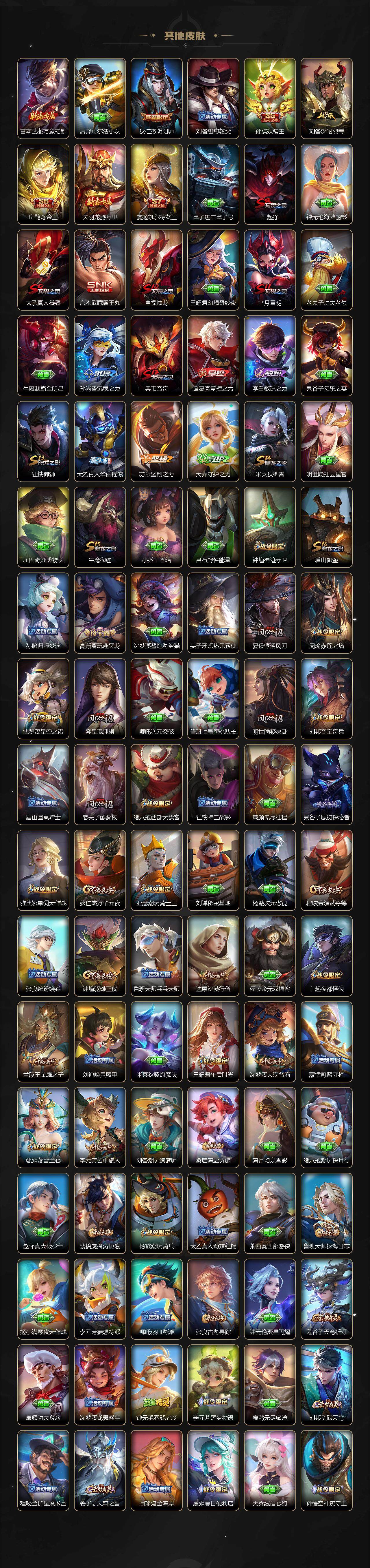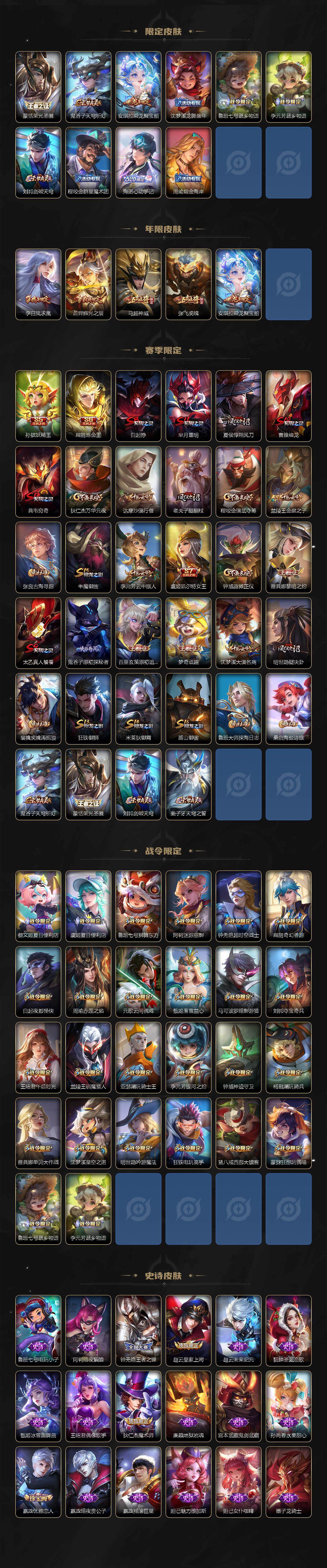【限定皮肤】:白起狰,蒙犽顽岩魄,蔡文姬夏日便利店,大乔绒语心约,虞姬夏日便利店,姜子牙天穹之誓,狄仁杰阴阳师,小乔纯白花嫁,虞姬凯尔特女王,赵云皇家上将,妲己时之彼端,嬴政优雅恋人,鲁班七号狮舞东方,高渐离玩趣恶龙,阿轲迷踪丽影,钟无艳王者之锤,钟无艳超时空战士,孙膑妖精王,扁鹊炼金王,扁鹊奇幻香踪,白起夜都怪侠,芈月重明,周瑜赤莲之焰,元歌云间偶戏,元歌无心,夏侯惇朔风刀,甄姬落雪兰心,曹操烛龙,曹操天狼征服者,典韦穷奇,马可波罗暗影游猎,狄仁杰魔术师,狄仁杰万华元夜,达摩沙漠行僧,项羽海滩派对,项羽霸王别姬,项羽无限倾心,老夫子醍醐杖,程咬金演武夺筹,刘邦夺宝奇兵,王昭君午后时光,兰陵王驯魔猎人,兰陵王金庭之子,亚瑟潮玩骑士王,牛魔御旌,后羿辉光之辰,张飞虎魄,李元芳银河之约,李元芳云中旅人,虞姬启明星使,钟馗神迹守卫,钟馗驱傩正仪,杨玉环遇见飞天,杨戬潮玩骑兵,女娲补天,雅典娜单词大作战,雅典娜黎明之约,蔡文姬繁星吟游,太乙真人饕餮,太乙真人华丽摇滚,鬼谷子原初探秘者,鬼谷子五谷丰年,百里玄策原初追逐者,弈星混沌棋,梦奇顽趣,沈梦溪星空之诺,沈梦溪大漠名商,沈梦溪匿光破解者,明世隐疑决卦,明世隐吟游魔法,裴擒虎李小龙,裴擒虎擒涛扼浪,狂铁御狮,狂铁电玩高手,米莱狄御霄,盾山御銮,孙策挚爱之约,猪八戒西部大镖客,上官婉儿梁祝,蒙犽狂想玩偶喵,鲁班大师探海日志,桑启海盐诗旅,阿古朵江河有灵,张良古海寻踪,蒙恬荣光圣徽,鬼谷子天穹祈灯,安琪拉乘龙聚宝船,沈梦溪龙舞盛年,鲁班七号蔬乡物语,李元芳蔬乡物语,刘邦剑破天穹,程咬金群星魔术团,海诺心动手记,周瑜熔金海岸