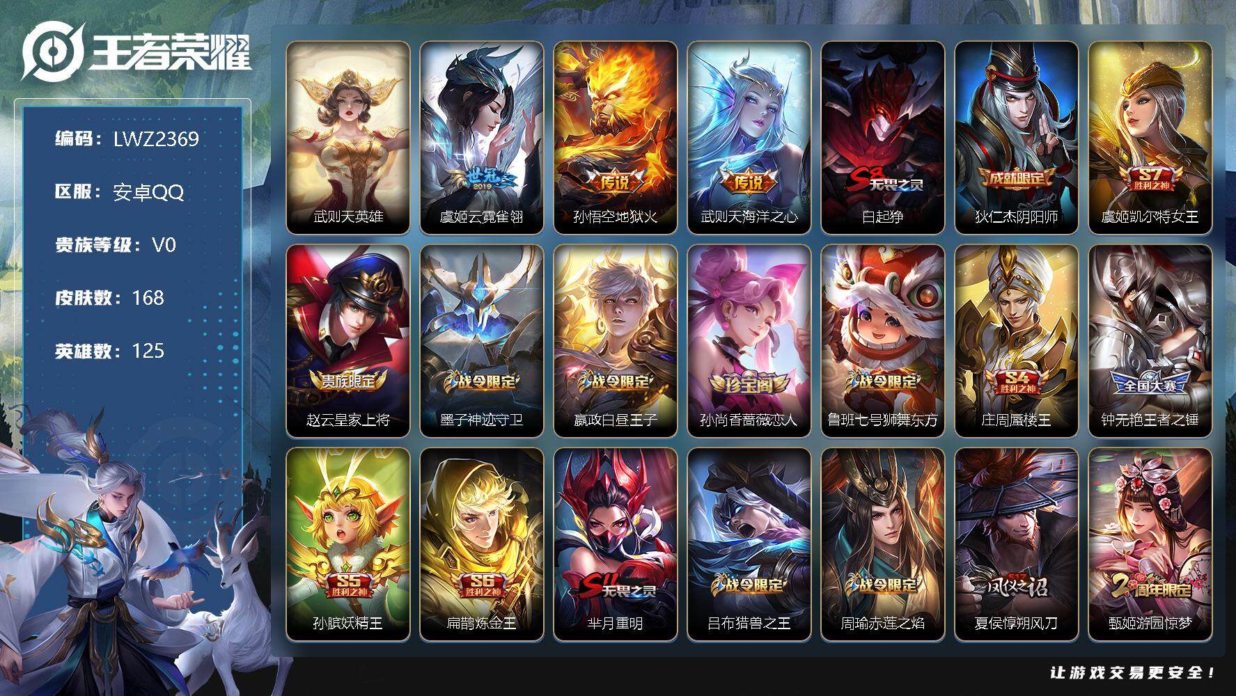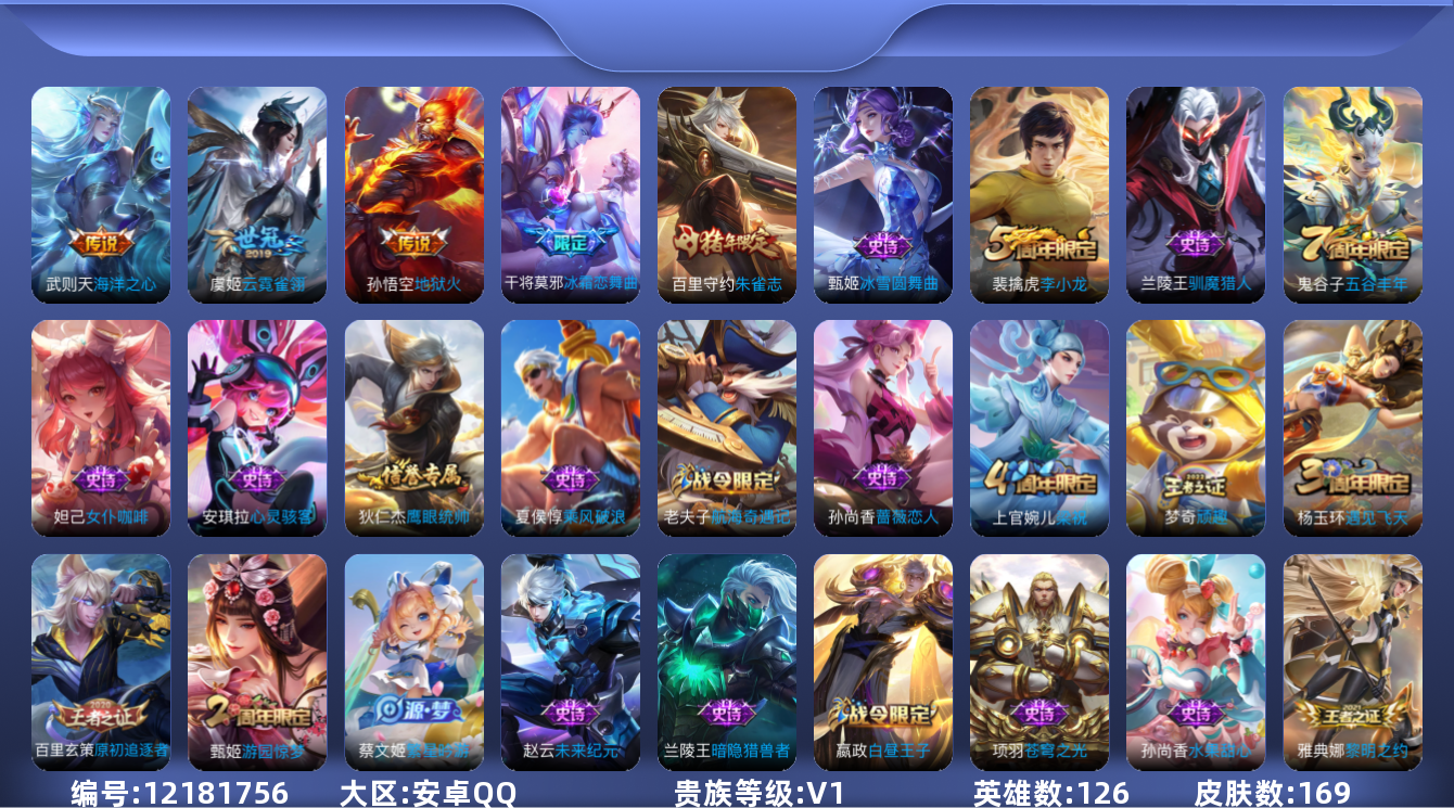 [12181756]【特价急出/详情看图】:安卓Q-V0-最强王者段位-125英雄-168皮肤-3传说-43史诗