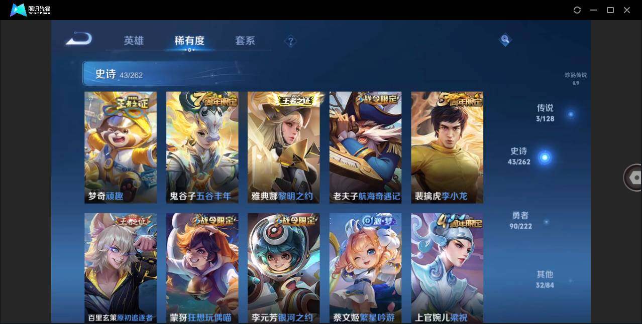 - [11678848]V7 1典藏 8传说 123英雄 250皮肤 可修改实名 优质装备:全息碎影(猴子典藏),黄金狮子座,久胜战神,地狱火,仲夏夜之梦(大飞蛾),胖达荣荣 传说皮:幻光神枪 珍宝阁皮:妄想食味,玩趣恶龙 限定皮:逐霄战戟,鸣野蒿,至尊宝,飞衡(韩信年限),遇见飞天,梁祝,天狼狩猎者,龙胆,烈魂,天狼绘梦者,李小龙,逐梦之影,辉光之辰,霸王别姬-虞姬,默契交锋-花木兰,大圣娶亲,天魔缭乱,乒乒小将 史诗皮:龙之律动,破空之剑,百相守梦-百里守约,紫霞仙子,黄金分割率,特工魅影,千年之狐,白蛇,冰冠公主,末日机甲-吕布,猫狗日记-孙策,节奏热浪,摇滚巨星,水果甜心,绅士熊喵,天才门将,星夜王子,心灵骇客,功夫厨神,幽灵船长,鬼剑武藏,心灵战警,纤云弄巧,乘风破浪,逐浪之夏,龙鼓争鸣,水晶猎龙者,曙光守护者,金属风暴,原初追逐者,圣诞狂欢,鹰眼统帅,暗夜贵公子,魅力维加斯,黎明之约
