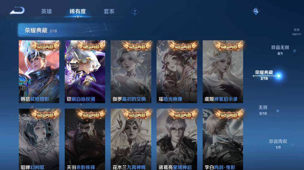 - PX_2084945-贵族等级: V8 英雄数: 125 皮肤数: 284 荣耀水晶: 鸣剑·曳影,九霄神辉 星传说: 幽冥之眼,星际治安官 传说皮: 黄金射手座,云鹰飞将,炽阳神光,一念神魔,末日机甲-孙尚香,地狱火,仲夏夜之梦,地狱之眼,李逍遥,超时空战士-狄仁杰,无双飞将,记忆之芯,霜月吟,琥珀纪元马超,幻光神枪,祥瑞亨通 限定皮: 冰锋战神,遇见飞天,李小龙,神威,飞衡,白虎志,至尊宝,大