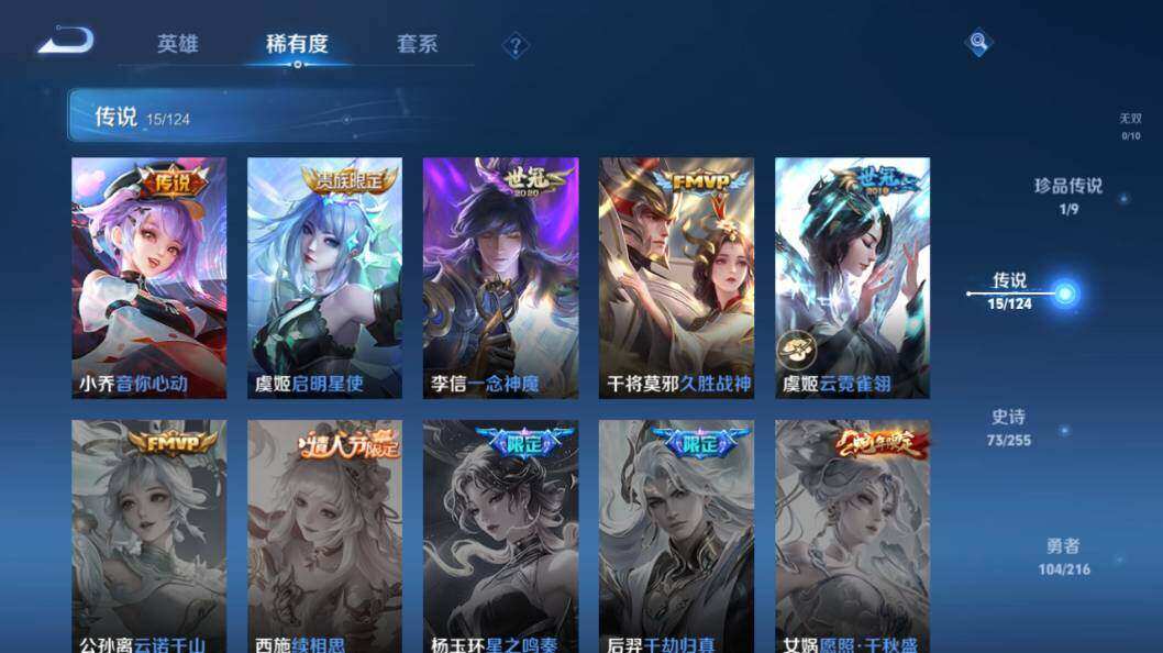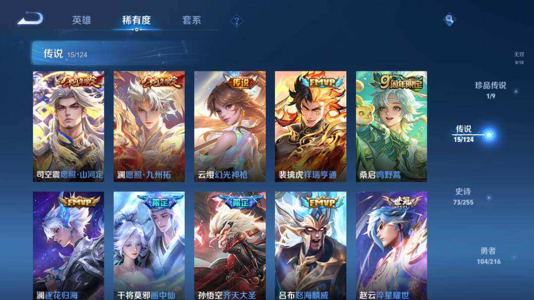 【传说皮肤】:司空震愿照山河定,澜愿照九州拓,云缨幻光神枪,裴擒虎祥瑞亨通,桑启鸣野蒿,澜逐花归海,干将莫邪画中仙,孙悟空齐天大圣,吕布怒海麟威,赵云淬星耀世,小乔音你心动,虞姬启明星使,李信一念神魔,干将莫邪久胜战神,虞姬云霓雀翎