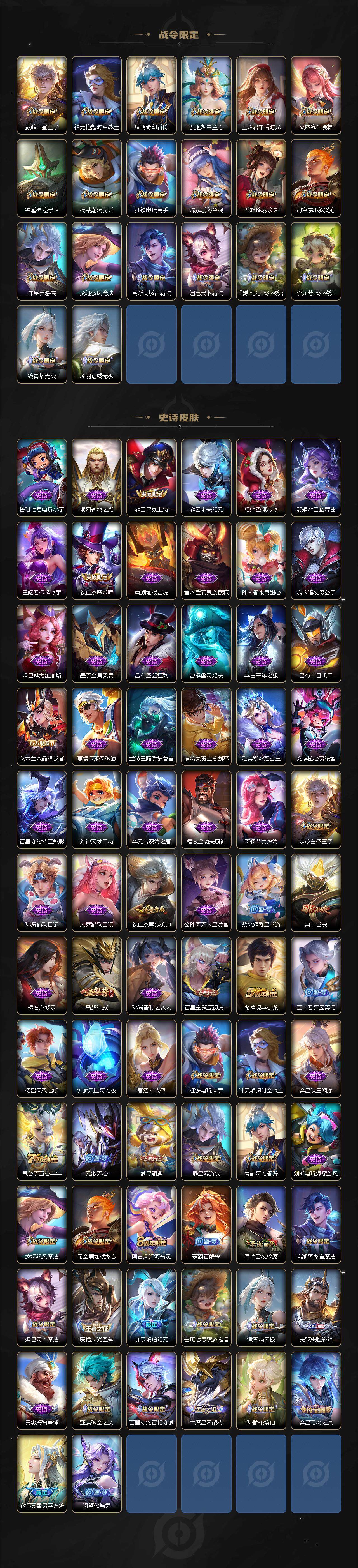 【战令限定】:嬴政白昼王子,钟无艳超时空战士,扁鹊奇幻香踪,甄姬落雪兰心,王昭君午后时光,艾琳流音漫舞,钟馗神迹守卫,杨戬潮玩骑兵,狂铁电玩高手,嫦娥暖冬兔眠,西施玲珑珍味,司空震地狱燃心,暃星界游侠,戈娅驭风魔法,高渐离燃音魔法,妲己灵卜魔法,鲁班七号蔬乡物语,李元芳蔬乡物语,镜青焰无极,项羽苍威无极