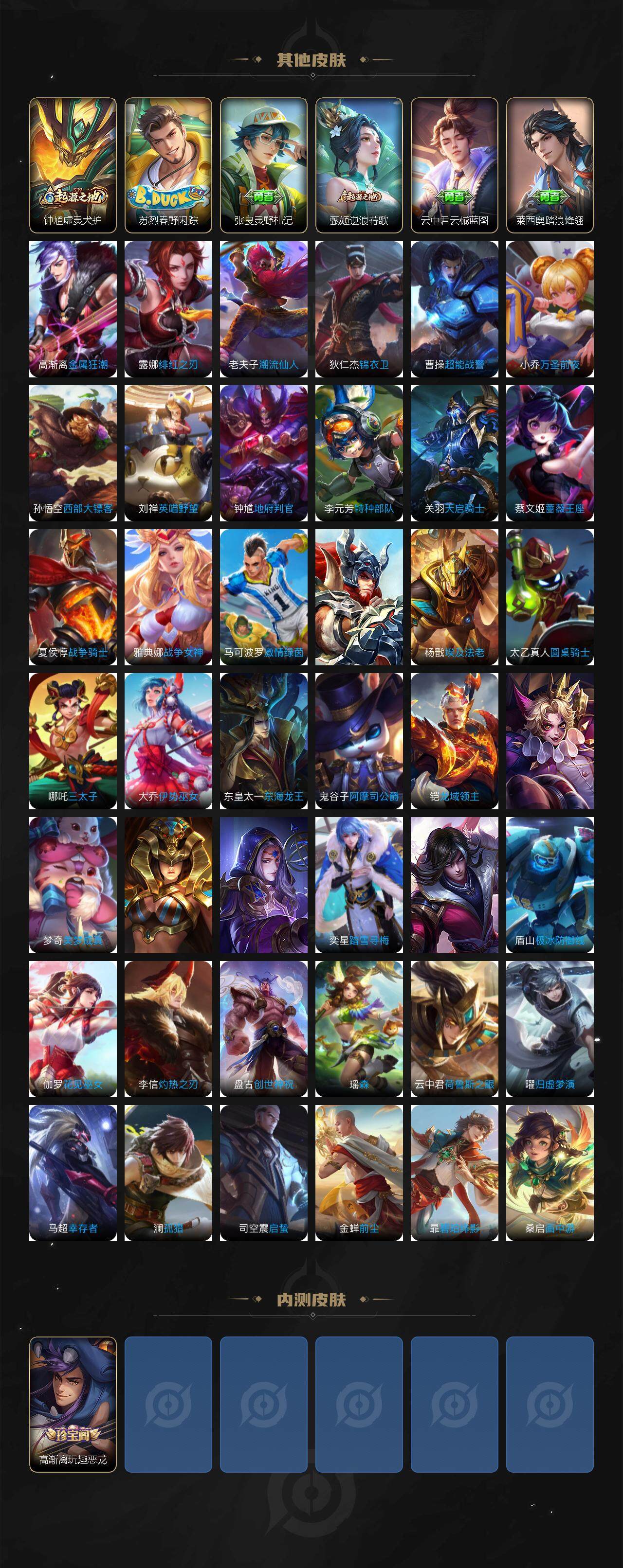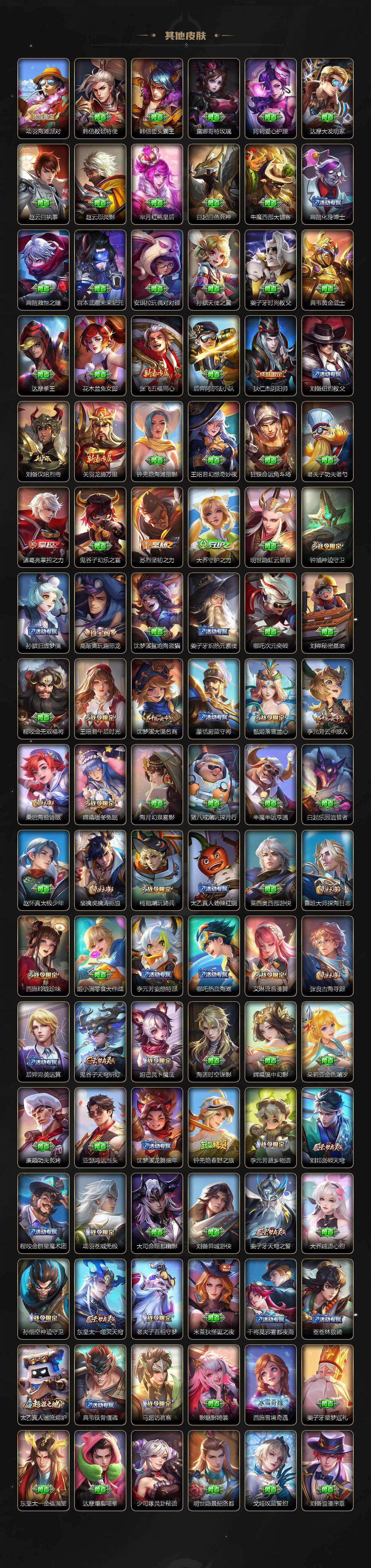 【限定皮肤】:大乔绒语心约,姜子牙天穹之誓,狄仁杰阴阳师,赵云皇家上将,嬴政白昼王子,高渐离玩趣恶龙,钟无艳超时空战士,扁鹊奇幻香踪,元歌无心,甄姬落雪兰心,典韦岱宗,狄仁杰魔术师,项羽海滩派对,王昭君午后时光,孙悟空齐天大圣,李元芳云中旅人,虞姬启明星使,钟馗神迹守卫,杨戬潮玩骑兵,干将莫邪画中仙,蔡文姬繁星吟游,鬼谷子五谷丰年,百里玄策原初追逐者,梦奇顽趣,沈梦溪大漠名商,裴擒虎李小龙,裴擒虎擒涛扼浪,狂铁电玩高手,云中君纤云弄巧,嫦娥暖冬兔眠,西施玲珑珍味,鲁班大师探海日志,桑启海盐诗旅,暃星界游侠,戈娅驭风魔法,艾琳流音漫舞,司空震地狱燃心,阿古朵江河有灵,张良古海寻踪,蒙犽百解令,蒙恬荣光圣徽,高渐离燃音魔法,妲己灵卜魔法,鬼谷子天穹祈灯,伽罗琥珀纪元,沈梦溪龙舞盛年,鲁班七号蔬乡物语,李元芳蔬乡物语,刘邦剑破天穹,程咬金群星魔术团,关羽决胜骁骑,镜青焰无极,项羽苍威无极,刘备异域游侠
