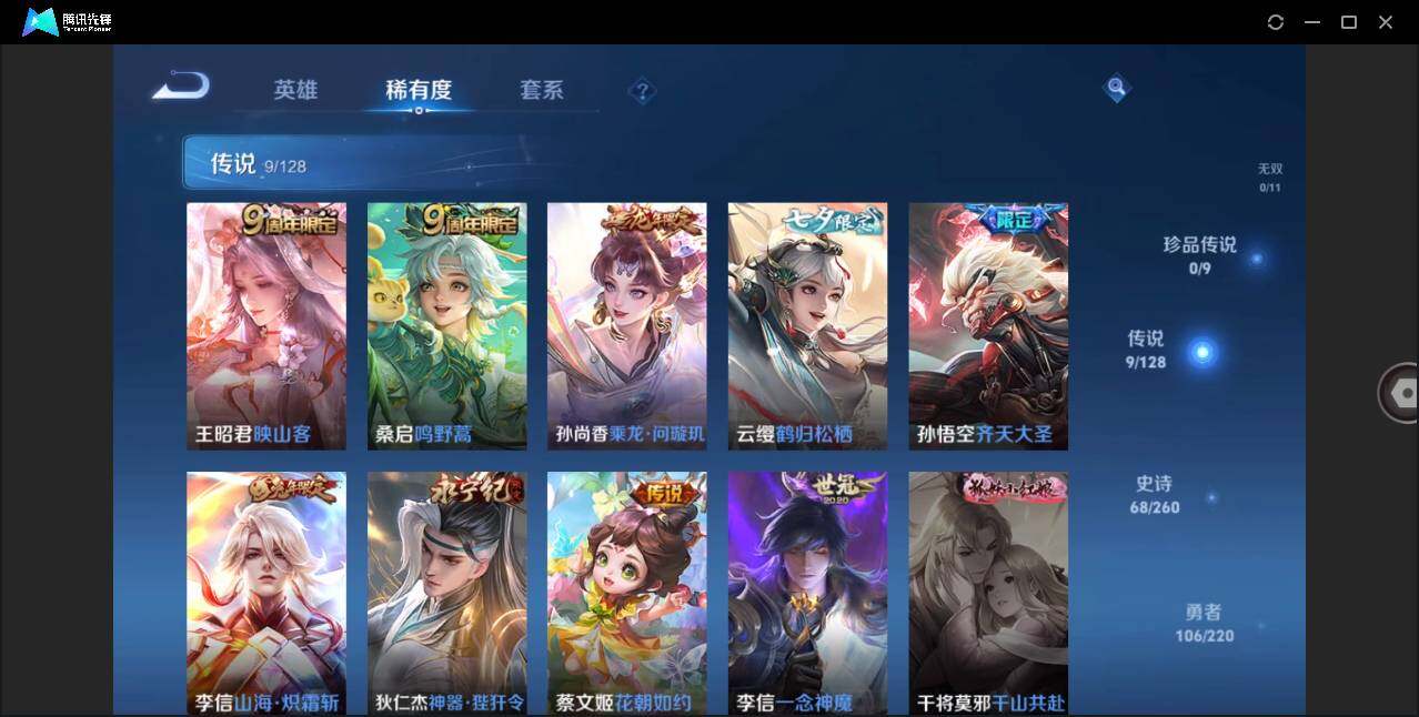 【传说皮肤】:王昭君映山客,桑启鸣野蒿,孙尚香乘龙问璇玑,云缨鹤归松栖,孙悟空齐天大圣,李信山海炽霜斩,狄仁杰神器狴犴令,蔡文姬花朝如约,李信一念神魔