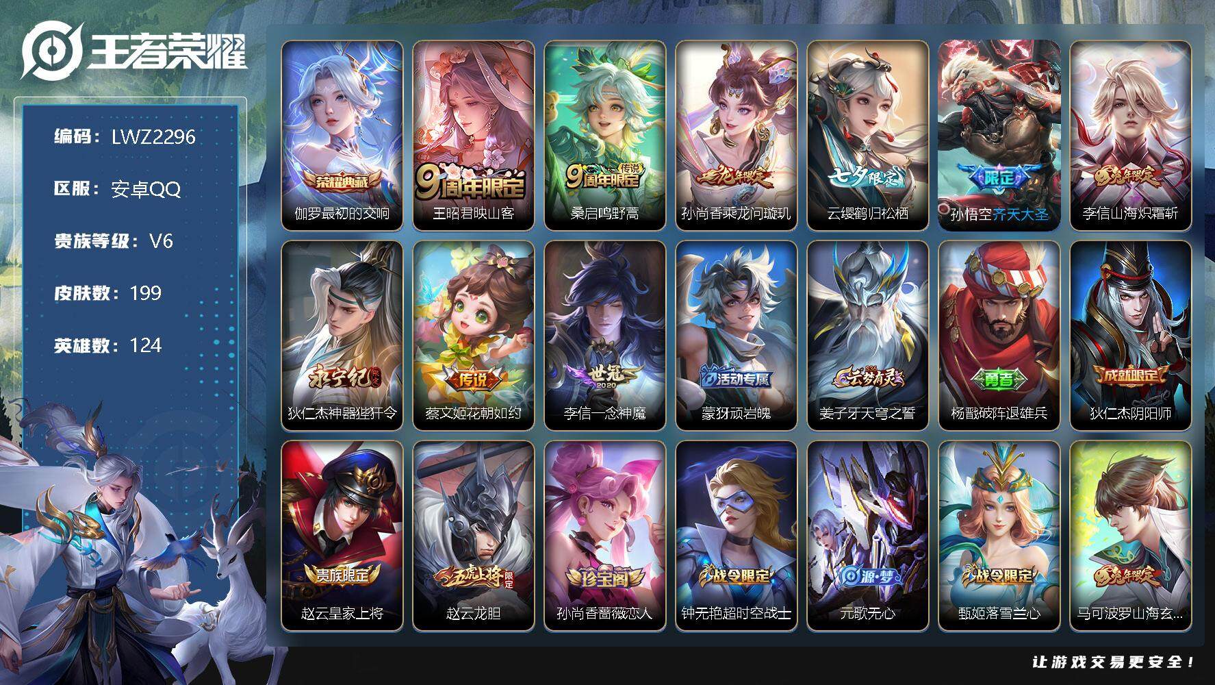 [12152470]【特价急出/详情看图】:安卓Q-V6-永恒钻石II段位-124英雄-199皮肤-1典藏-9传说-68史诗 【荣耀典藏】:伽罗最初的交响 【传说皮肤】:王昭君映山客,桑启鸣野蒿,孙尚香乘龙问璇玑,云缨鹤归松栖,孙悟空齐天大圣,李信山海炽霜斩,狄仁杰神器狴犴令,蔡文姬花朝如约,李信一念神魔 【限定皮肤】:蒙犽顽岩魄,姜子牙天穹之誓,杨戬破阵退雄兵,狄仁杰阴阳师,赵云皇家上将,赵云龙胆,孙尚香蔷薇恋人,钟无艳超时空战士,元歌无心,甄姬落雪兰心,马可波罗山海玄木吟,狄仁杰魔术师,狄仁杰神器狴犴令,达摩沙漠行僧,项羽海滩派对,王昭君午后时光,兰陵王金庭之子,孙悟空齐天大圣,李元芳云中旅人,鬼谷子五谷丰年,沈梦溪大漠名商,裴擒虎李小龙,裴擒虎擒涛扼浪,狂铁电玩高手,瑶山海碧波行,云中君纤云弄巧,李信山海炽霜斩,嫦娥拒霜思,嫦娥暖冬兔眠,西施至美乘鲤谣,鲁班大师探海日志,桑启海盐诗旅,暃星界游侠,云缨鹤归松栖,阿古朵江河有灵,张良古海寻踪,蒙犽百解令,鬼谷子天穹祈灯,大乔乘龙忆丹青,孙尚香乘龙问璇玑,沈梦溪龙舞盛年,刘邦剑破天穹,程咬金群星魔术团,刘备异域游侠,周瑜熔金海岸 【年限皮肤】:赵云龙胆,瑶山海碧波行,马可波罗山海玄木吟,李信山海炽霜斩,大乔乘龙忆丹青,孙尚香乘龙问璇玑 【赛季限定】:达摩沙漠行僧,兰陵王金庭之子,张良古海寻踪,李元芳云中旅人,沈梦溪大漠名商,裴擒虎擒涛扼浪,鲁班大师探海日志,桑启海盐诗旅,鬼谷子天穹祈灯,刘邦剑破天穹,姜子牙天穹之誓 【战令限定】:钟无艳超时空战士,甄姬落雪兰心,王昭君午后时光,狂铁电玩高手,嫦娥暖冬兔眠,暃星界游侠 【史诗皮肤】:赵云皇家上将,赵云未来纪元,貂蝉圣诞恋歌,甄姬冰雪圆舞曲,狄仁杰魔术师,宫本武藏鬼剑武藏,孙尚香蔷薇恋人,孙尚香水果甜心,嬴政暗夜贵公子,妲己魅力维加斯,妲己女仆咖啡,墨子金属风暴,吕布圣诞狂欢,刘禅绅士熊喵,张飞乱世虎臣,花木兰水晶猎龙者,刘邦德古拉伯爵,夏侯惇乘风破浪,小乔缤纷独角兽,兰陵王暗隐猎兽者,亚瑟心灵战警,雅典娜冰冠公主,安琪拉心灵骇客,百里守约特工魅影,铠曙光守护者,蔡文姬舞动绿茵,李元芳逐浪之夏,程咬金功夫厨神,白起星夜王子,阿轲节奏热浪,孙策猫狗日记,大乔猫狗日记,伽罗箭羽风息,狄仁杰鹰眼统帅,小乔青蛇,瑶遇见神鹿,赵云龙胆,孙尚香时之恋人,裴擒虎李小龙,云中君纤云弄巧,西施诗语江南,沈