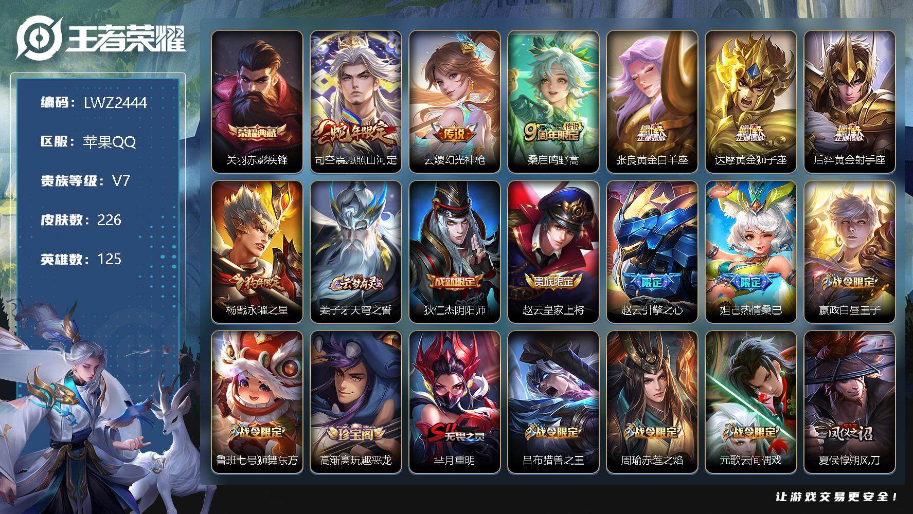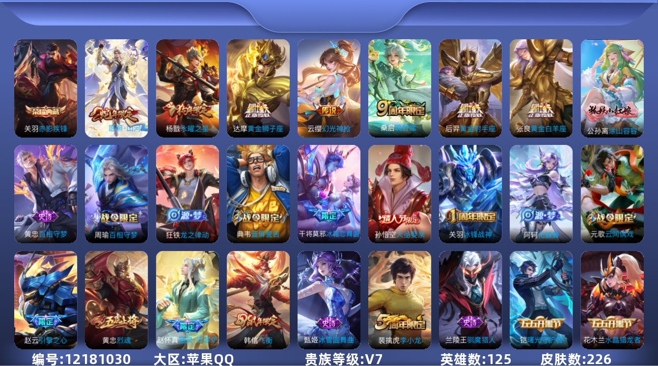 [12181030]【特价急出/详情看图】:苹果Q-V7-永恒钻石I段位-125英雄-226皮肤-1典藏-7传说-63史诗 【荣耀典藏】:关羽赤影疾锋 【传说皮肤】:司空震愿照山河定,云缨幻光神枪,桑启鸣野蒿,张良黄金白羊座,达摩黄金狮子座,后羿黄金射手座,杨戬永曜之星 【限定皮肤】:姜子牙天穹之誓,狄仁杰阴阳师,赵云皇家上将,赵云引擎之心,妲己热情桑巴,嬴政白昼王子,鲁班七号狮舞东方,高渐离玩趣恶龙,芈月重明,吕布猎兽之王,周瑜赤莲之焰,元歌云间偶戏,夏侯惇朔风刀,曹操烛龙,典韦穷奇,典韦蓝屏警告,狄仁杰魔术师,狄仁杰万华元夜,项羽海滩派对,老夫子醍醐杖,关羽冰锋战神,关羽百相守梦,貂蝉逐梦之音,程咬金演武夺筹,韩信逐梦之影,韩信飞衡,兰陵王驯魔猎人,孙悟空大圣娶亲,牛魔御旌,钟馗神迹守卫,钟馗驱傩正仪,杨戬永曜之星,女娲朔望之晖,干将莫邪冰霜恋舞曲,雅典娜黎明之约,鬼谷子原初探秘者,黄忠烈魂,弈星混沌棋,明世隐疑决卦,裴擒虎李小龙,裴擒虎擒涛扼浪,狂铁御狮,米莱狄御霄,盾山御銮,上官婉儿梁祝,鲁班大师探海日志,桑启海盐诗旅,张良古海寻踪,蒙犽百解令,蒙恬荣光圣徽,鬼谷子天穹祈灯,沈梦溪龙舞盛年,刘邦剑破天穹 【年限皮肤】:杨戬永曜之星,韩信飞衡,黄忠烈魂 【赛季限定】:芈月重明,夏侯惇朔风刀,曹操烛龙,典韦穷奇,狄仁杰万华元夜,老夫子醍醐杖,程咬金演武夺筹,张良古海寻踪,牛魔御旌,钟馗驱傩正仪,雅典娜黎明之约,鬼谷子原初探秘者,弈星混沌棋,明世隐疑决卦,裴擒虎擒涛扼浪,狂铁御狮,米莱狄御霄,盾山御銮,鲁班大师探海日志,桑启海盐诗旅,鬼谷子天穹祈灯,蒙恬荣光圣徽,刘邦剑破天穹,姜子牙天穹之誓 【战令限定】:嬴政白昼王子,鲁班七号狮舞东方,吕布猎兽之王,周瑜赤莲之焰,元歌云间偶戏,典韦蓝屏警告,兰陵王驯魔猎人,钟馗神迹守卫,女娲朔望之晖 【史诗皮肤】:赵云皇家上将,貂蝉圣诞恋歌,甄姬冰雪圆舞曲,王昭君偶像歌手,狄仁杰魔术师,廉颇地狱岩魂,宫本武藏鬼剑武藏,孙尚香水果甜心,嬴政暗夜贵公子,嬴政摇滚巨星,妲己魅力维加斯,墨子金属风暴,吕布圣诞狂欢,刘禅绅士熊喵,曹操幽灵船长,李白千年之狐,妲己热情桑巴,张飞乱世虎臣,关羽冰锋战神,貂蝉逐梦之音,赵云引擎之心,花木兰水晶猎龙者,刘邦德古拉伯爵,韩信逐梦之影,夏侯惇乘风破浪,小乔缤纷独角兽,兰陵王暗隐猎兽者,诸葛亮黄金分割率,亚瑟心灵战警,雅