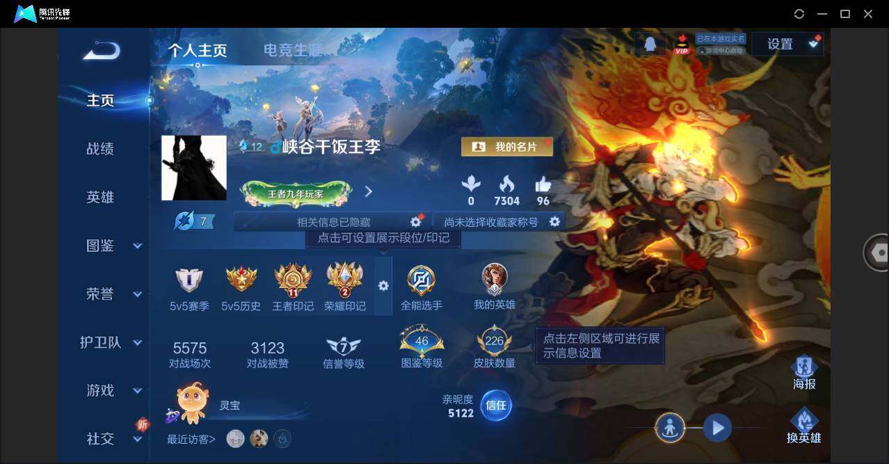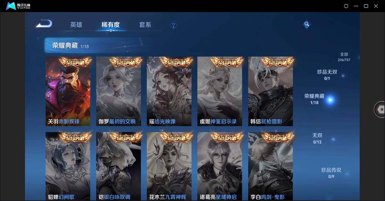 - [12204317]实名: 可修改 贵族等级: V6 英雄数: 123 皮肤数: 178 荣耀水晶: 最初的交响 传说皮: 冠军飞将,一念神魔,无双飞将,山海·炽霜斩,鹤归松栖(云缨) 限定皮: 李小龙,祈雪灵祝,蜜橘之夏,高山流水,猪悟能,五谷丰年,鸣野蒿,愿照·九州拓