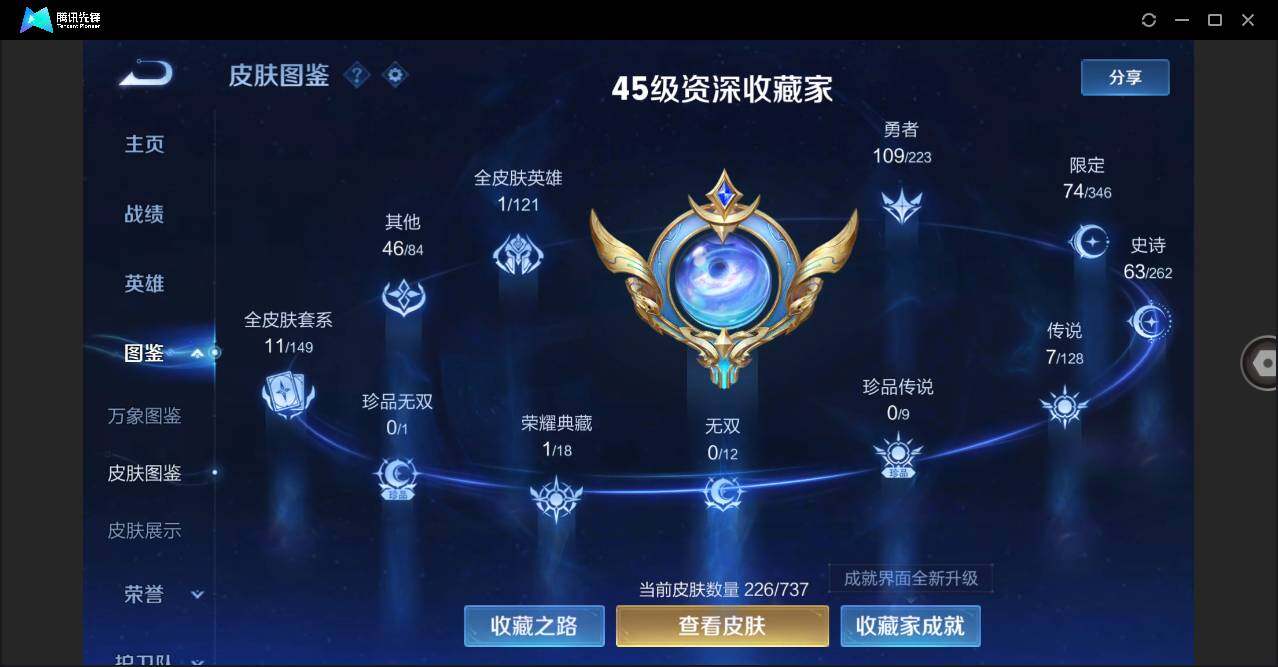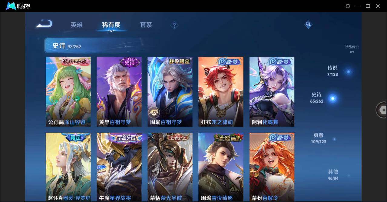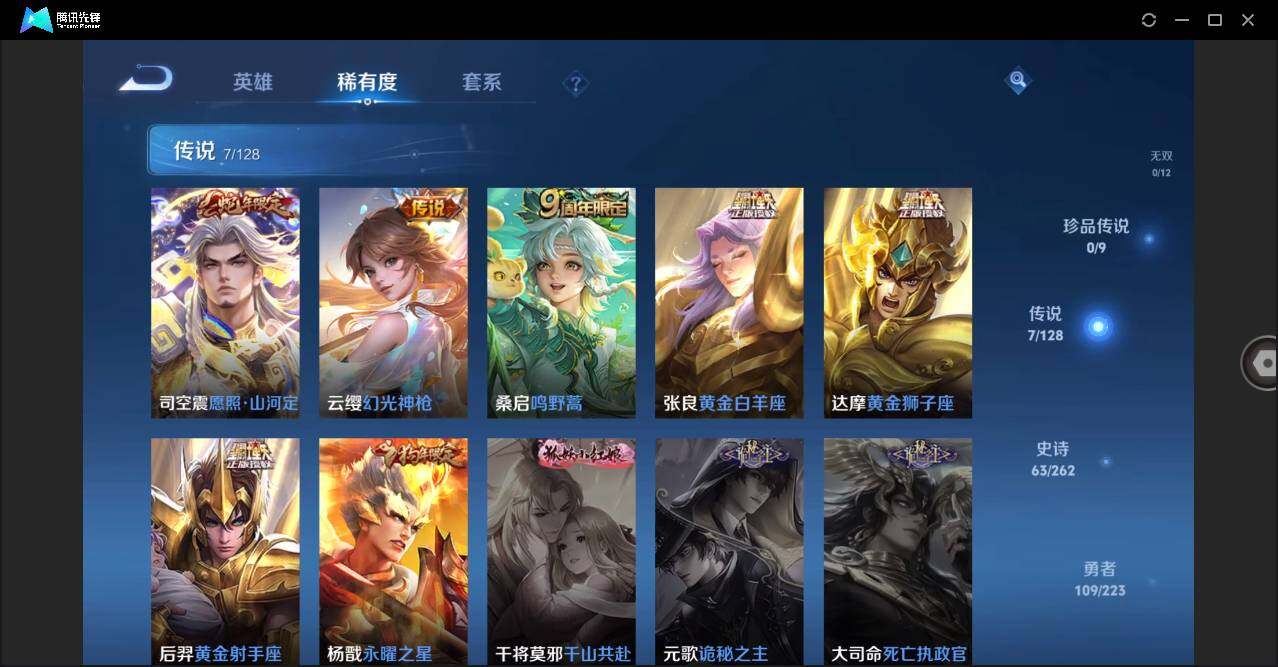 - [12084002]V7 8传说 125英雄 259皮肤 可修改实名 优质装备:猫影幻舞,久胜战神,云霓雀翎,末日机甲-孙尚香(绿蚂蚱) 传说皮:幻光神枪 珍宝阁皮:蔷薇恋人,玩趣恶龙 限定皮:愿照·岁时盈(虞姬年限),太华(伽罗年限),梅西,武陵仙君(小桃花),飞衡(韩信年限),瑞麟志(木兰年限),遇见飞天,五谷丰年,梁祝,天狼狩猎者,岱宗(典韦年限),天狼征服者,李小龙,逐梦之光,朱雀志(守约年限) 史诗皮:化蝶舞,百相守梦-黄忠,白龙吟,黄金分割率,特工魅影,高渐离燃音魔法,猫狗日记-孙策,乱世虎臣,节奏热浪,女仆咖啡,摇滚巨星,水果甜心,星夜王子,暗隐猎兽者,鬼剑武藏,地狱岩魂,纤云弄巧,乘风破浪,逐浪之夏,月团寄思,水晶猎龙者,曙光守护者,金属风暴,圣诞狂欢,圣诞恋歌,鹰眼统帅,无心