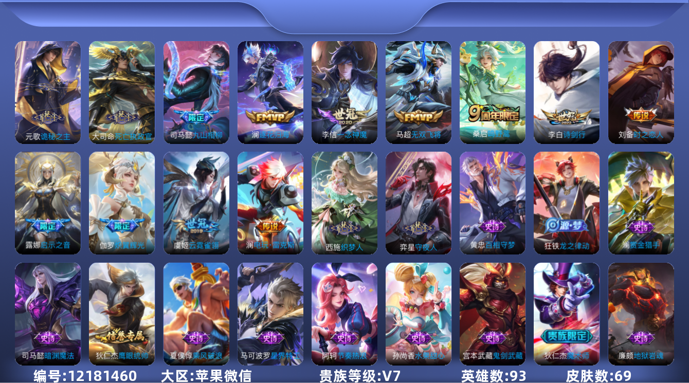 [12181460]【特价急出/详情看图】:苹果WX-V7-永恒钻石I段位-93英雄-69皮肤-13传说-18史诗 【传说皮肤】:元歌诡秘之主,大司命死亡执政官,司马懿九山相柳,桑启鸣野蒿,澜逐花归海,澜电玩雷克斯,伽罗炽翼辉光,李白诗剑行,马超无双飞将,露娜启示之音,李信一念神魔,刘备时之恋人,虞姬云霓雀翎 【限定皮肤】:姜子牙天穹之誓,狄仁杰阴阳师,赵云皇家上将,狄仁杰魔术师,项羽海滩派对,露娜启示之音,伽罗炽翼辉光,沈梦溪龙舞盛年 【年限皮肤】:伽罗炽翼辉光 【赛季限定】:姜子牙天穹之誓 【史诗皮肤】:赵云皇家上将,狄仁杰魔术师,廉颇地狱岩魂,宫本武藏鬼剑武藏,孙尚香水果甜心,妲己魅力维加斯,夏侯惇乘风破浪,李元芳逐浪之夏,程咬金功夫厨神,阿轲节奏热浪,狄仁杰鹰眼统帅,司马懿暗渊魔法,澜赏金猎手,马可波罗星界特工,狂铁龙之律动,黄忠百相守梦,西施织梦人,弈星守夜人 【其他皮肤】:项羽海滩派对,赵云忍炎影,白起白色死神,牛魔西部大镖客,典韦黄金武士,亚瑟死亡骑士,甄姬花好人间,后羿阿尔法小队,狄仁杰阴阳师,诸葛亮掌控之力,典韦铁甲之心,妲己紫罗兰之誓,沈梦溪龙舞盛年,姜子牙天穹之誓,盘古敬我三分,东皇太一噬灭天穹,干将莫邪雾都夜雨,典韦铁骨偃魂,钟馗虚灵犬护,露娜命运加冕,姬小满小满鸭,白起死霸装,甄姬逆浪荇歌,莱西奥踏浪烽翎,鬼谷子克喵,哪吒罗小黑战记,亚瑟荣光之誓,小乔万圣前夜,后羿精灵王,虞姬加勒比小姐,百里玄策威尼斯狂欢,元歌午夜歌剧院,伽罗花见巫女,上官婉儿修竹墨客,云中君荷鲁斯之眼,澜孤猎,司空震启蛰,云缨赤焰之缨 【营地ID】:1825249575