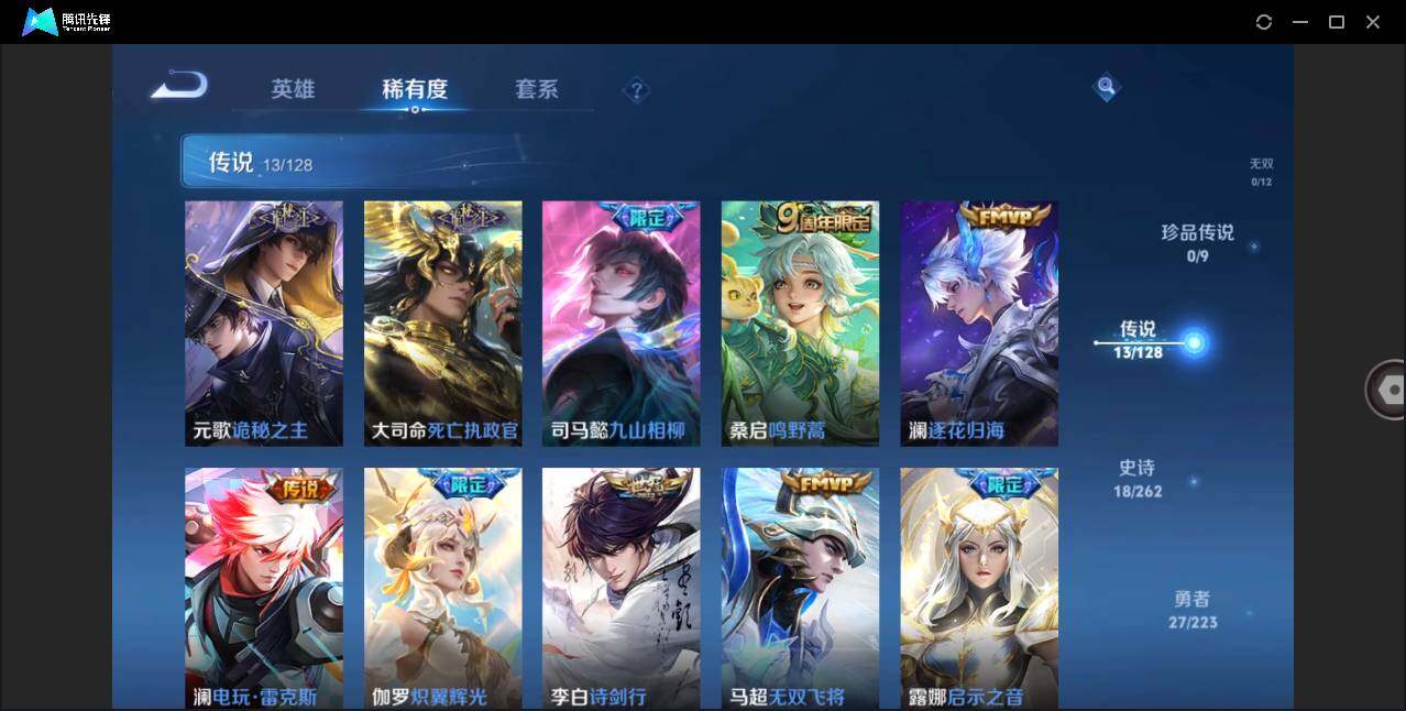 【传说皮肤】:元歌诡秘之主,大司命死亡执政官,司马懿九山相柳,桑启鸣野蒿,澜逐花归海,澜电玩雷克斯,伽罗炽翼辉光,李白诗剑行,马超无双飞将,露娜启示之音,李信一念神魔,刘备时之恋人,虞姬云霓雀翎