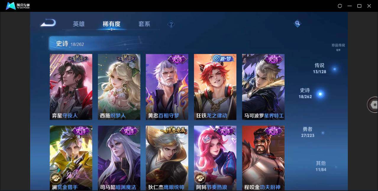 【史诗皮肤】:赵云皇家上将,狄仁杰魔术师,廉颇地狱岩魂,宫本武藏鬼剑武藏,孙尚香水果甜心,妲己魅力维加斯,夏侯惇乘风破浪,李元芳逐浪之夏,程咬金功夫厨神,阿轲节奏热浪,狄仁杰鹰眼统帅,司马懿暗渊魔法,澜赏金猎手,马可波罗星界特工,狂铁龙之律动,黄忠百相守梦,西施织梦人,弈星守夜人