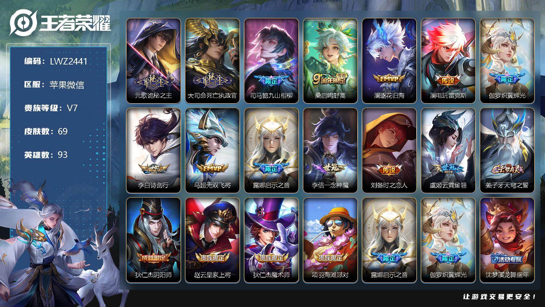 [12181460]【特价急出/详情看图】:苹果WX-V7-永恒钻石I段位-93英雄-69皮肤-13传说-18史诗