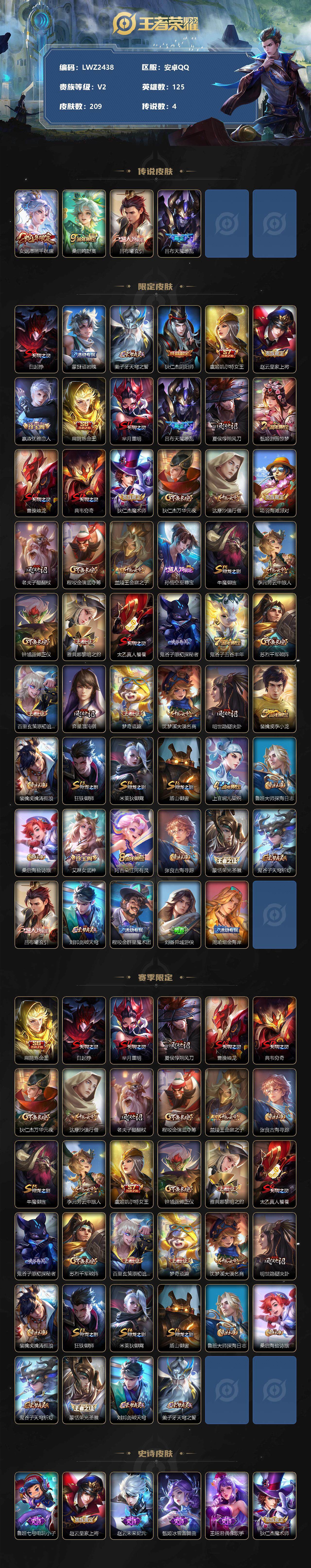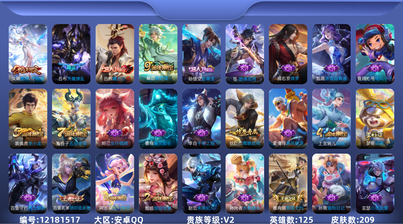 [12181517]云挂上后补图 【特价急出/详情看图】:安卓Q-V2-永恒钻石V段位-125英雄-209皮肤-4传说-39史诗