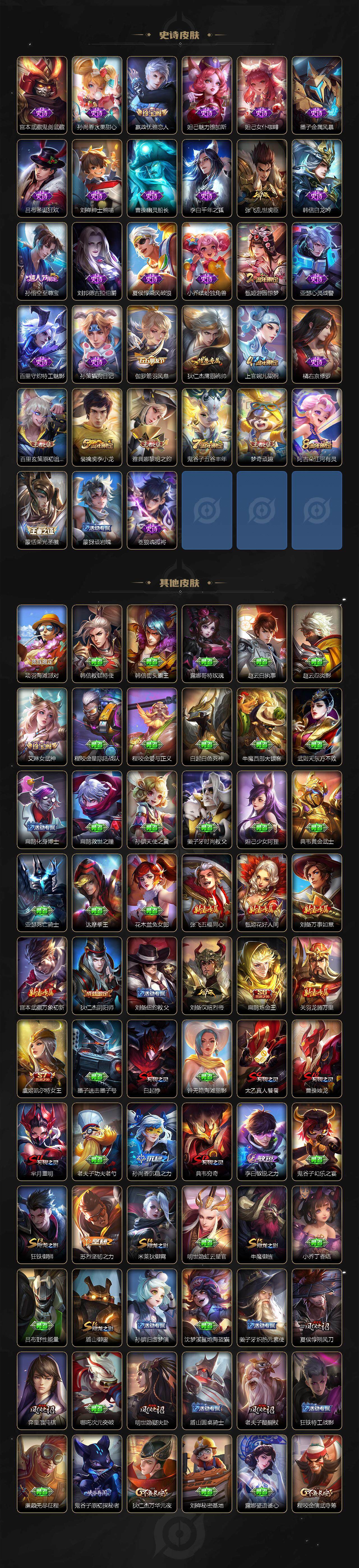 【史诗皮肤】:鲁班七号电玩小子,赵云皇家上将,赵云未来纪元,甄姬冰雪圆舞曲,王昭君偶像歌手,狄仁杰魔术师,宫本武藏鬼剑武藏,孙尚香水果甜心,嬴政优雅恋人,妲己魅力维加斯,妲己女仆咖啡,墨子金属风暴,吕布圣诞狂欢,刘禅绅士熊喵,曹操幽灵船长,李白千年之狐,张飞乱世虎臣,韩信白龙吟,孙悟空至尊宝,刘邦德古拉伯爵,夏侯惇乘风破浪,小乔缤纷独角兽,甄姬游园惊梦,亚瑟心灵战警,百里守约特工魅影,孙策猫狗日记,伽罗箭羽风息,狄仁杰鹰眼统帅,上官婉儿梁祝,橘右京修罗,百里玄策原初追逐者,裴擒虎李小龙,雅典娜黎明之约,鬼谷子五谷丰年,梦奇顽趣,阿古朵江河有灵,蒙恬荣光圣徽,蒙