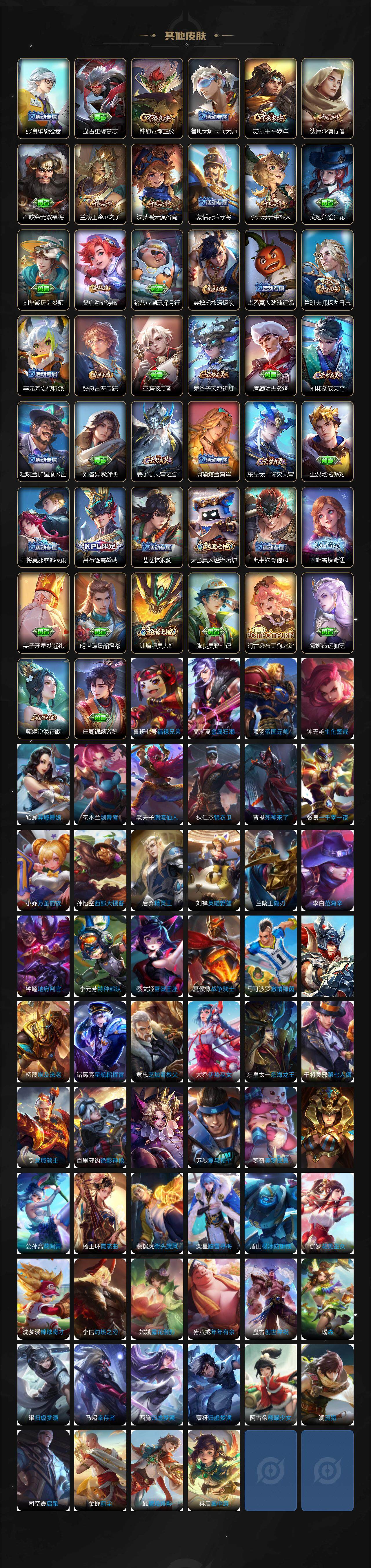 【限定皮肤】:白起狰,蒙犽顽岩魄,姜子牙天穹之誓,狄仁杰阴阳师,虞姬凯尔特女王,赵云皇家上将,嬴政优雅恋人,扁鹊炼金王,芈月重明,吕布天魔缭乱,夏侯惇朔风刀,甄姬游园惊梦,曹操烛龙,典韦穷奇,狄仁杰魔术师,狄仁杰万华元夜,达摩沙漠行僧,项羽海滩派对,老夫子醍醐杖,程咬金演武夺筹,兰陵王金庭之子,孙悟空至尊宝,牛魔御旌,李元芳云中旅人,钟馗驱傩正仪,雅典娜黎明之约,太乙真人饕餮,鬼谷子原初探秘者,鬼谷子五谷丰年,苏烈千军破阵,百里玄策原初追逐者,弈星混沌棋,梦奇顽趣,沈梦溪大漠名商,明世隐疑决卦,裴擒虎李小龙,裴擒虎擒涛扼浪,狂铁御狮,米莱狄御霄,盾山御銮,上官婉儿梁祝,鲁班大师探海日志,桑启海盐诗旅,艾琳女武神,阿古朵江河有灵,张良古海寻踪,蒙恬荣光圣徽,鬼谷子天穹祈灯,吕布曦玄引,刘邦剑破天穹,程咬金群星魔术团,刘备异域游侠,周瑜熔金海岸