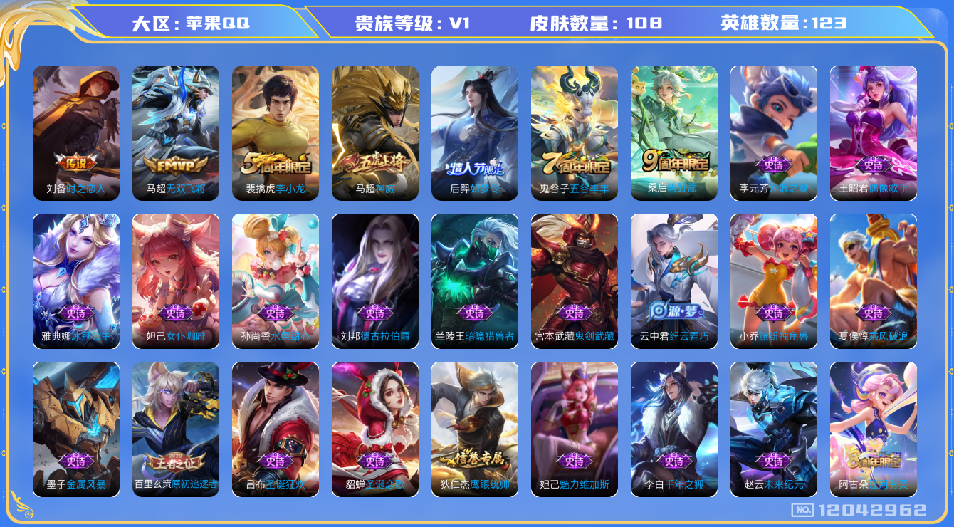 - [12163345]V7 1典藏 10传说 123英雄 231皮肤 可修改实名 优质装备:拾光映像(瑶典藏),仲夏夜之梦(大飞蛾),地狱之眼,挚爱花嫁,涂山容容 传说皮:续相思 珍宝阁皮:蔷薇恋人,女武神 限定皮:愿照·福禄聚(蔡文姬年限),愿照·众生和(妲己年限),鸣野蒿,凤凰于飞,寅虎·展翼(孙膑年限),前尘镜,白鹤梁神女,时雨天司(水龙头),山海·碧波行(瑶年限),遇见飞天,高山流水,五谷丰年,天狼运算者,游园惊梦,梁祝,祈雪灵祝(雪兔子),李小龙,霸王别姬-虞姬,默契交锋-花木兰,云端筑梦师,寅虎·心曲(虎婆),玉兔公主,匿光启智者 史诗皮:器灵·浮梦炉,星界战将,涂山红红,奇遇星旅,遇见神鹿,紫霞仙子,电玩小子(小书包),特工魅影,冰冠公主,白蛇,青蛇,百解令(蒙犽),蒙恬荣光圣徽,魅语,无限星赏官,晚萤,银翎春语,龙骑士(小龙虾),猫狗日记-孙策,猫狗日记-大乔,节奏热浪,女仆咖啡,水果甜心,绅士熊喵,心灵骇客,德古拉伯爵,鬼剑武藏,舞动绿茵,诗语江南,纤云弄巧,繁星吟游(呼啦呼啦),拒霜思,缤纷独角兽,月团寄思,水晶猎龙者,原初追逐者,圣诞恋歌,鹰眼统帅,魅力维加斯,黎明之约,滕王阁序,未来纪元-赵云