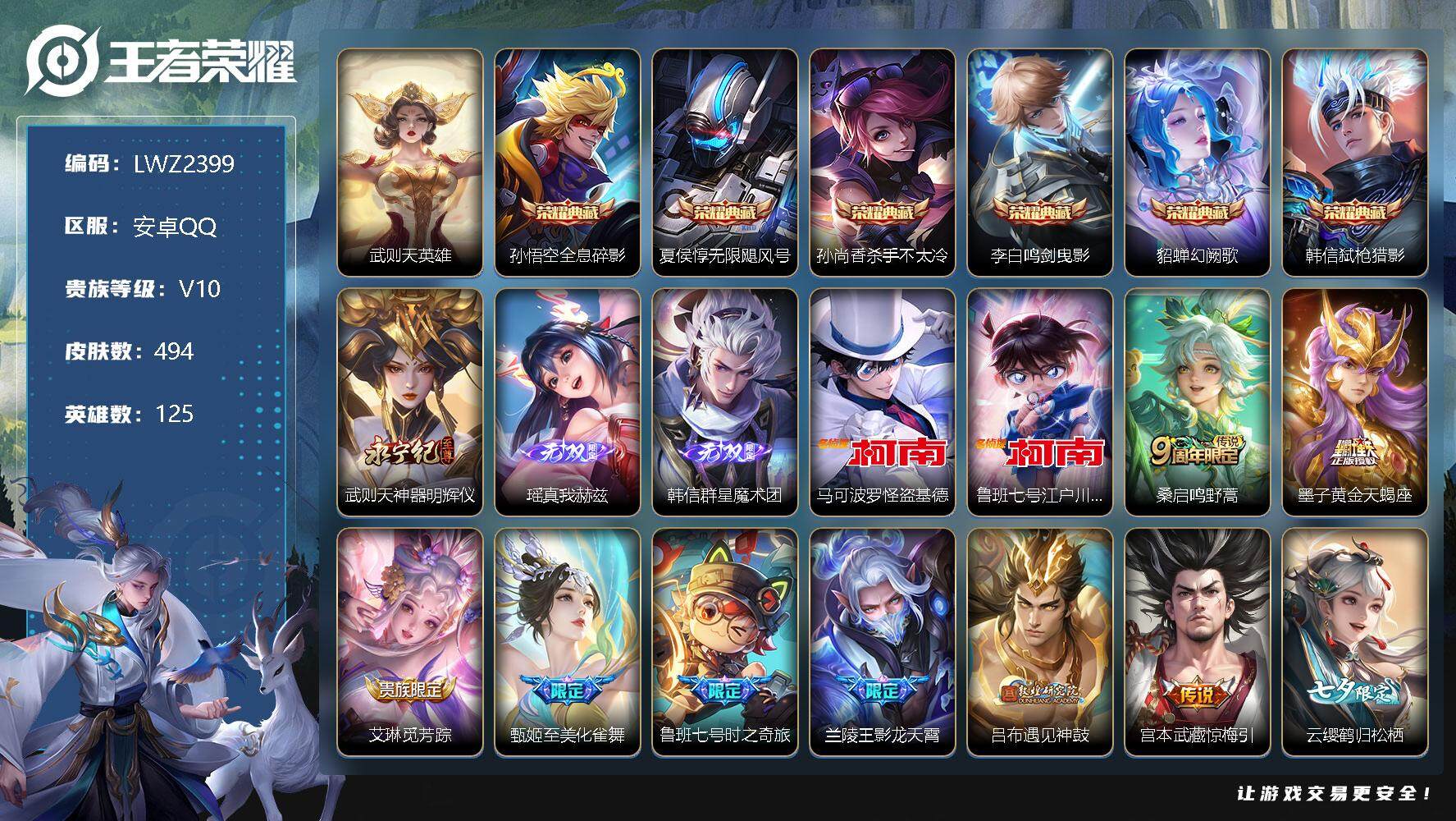 [12101232]中路32段/发育路30段【特价急出/详情看图】:安卓Q-V10-尊贵铂金III段位-125英雄-494皮肤-6典藏-3无双-2珍品传说-56传说-162史诗 【荣耀典藏】:武则天英雄,孙悟空全息碎影,夏侯惇无限飓风号,孙尚香杀手不太冷,李白鸣剑曳影,貂蝉幻阙歌,韩信弑枪猎影 【无双皮肤】:武则天神器明辉仪,瑶真我赫兹,韩信群星魔术团 【珍品传说】:马可波罗怪盗基德,鲁班七号江户川柯南 【传说皮肤】:桑启鸣野蒿,墨子黄金天蝎座,艾琳觅芳踪,甄姬至美化雀舞,鲁班七号时之奇旅,兰陵王影龙天霄,吕布遇见神鼓,宫本武藏惊梅引,云缨鹤归松栖,马可波罗妄想实况,东皇太一灼幽烈阳,诸葛亮鹤羽星尊,孙悟空齐天大圣,小乔山海琳琅生,曜山海苍雷引,李信山海炽霜斩,吕布怒海麟威,李白诗剑行,狄仁杰神器狴犴令,百里守约碎云,孙策挚爱之约,蔡文姬花朝如约,鲁班七号寅虎瑞焰,孙尚香异界灵契,貂蝉遇见胡旋,赵云淬星耀世,王昭君乞巧织情,西施游龙清影,周瑜音你心动,小乔音你心动,李元芳飞鸢探春,诸葛亮时雨天司,铠绛天战甲,镜炽阳神光,虞姬启明星使,孙悟空零号赤焰,曜云鹰飞将,李信一念神魔,刘备时之恋人,伽罗太华,貂蝉猫影幻舞,张良黄金白羊座,干将莫邪久胜战神,虞姬云霓雀翎,达摩黄金狮子座,花木兰冠军飞将,梦奇胖达荣荣,后羿黄金射手座,貂蝉仲夏夜之梦,李白凤求凰,孙尚香末日机甲,宫本武藏地狱之眼,孙悟空地狱火,吕布天魔缭乱,武则天海洋之心,狄仁杰超时空战士 【限定皮肤】:白起狰,大乔绒语心约,李白谪仙醉月,狄仁杰阴阳师,虞姬凯尔特女王,廉颇寅虎御盾,小乔山海琳琅生,赵云皇家上将,赵云引擎之心,赵云龙胆,赵云百木心枪,墨子神迹守卫,嬴政白昼王子,孙尚香蔷薇恋人,孙尚香异界灵契,鲁班七号狮舞东方,鲁班七号乒乒小将,鲁班七号寅虎瑞焰,鲁班七号时之奇旅,庄周蜃楼王,庄周高山流水,高渐离死亡摇滚,高渐离玩趣恶龙,钟无艳王者之锤,钟无艳超时空战士,孙膑妖精王,孙膑天狼运算者,孙膑寅虎展翼,扁鹊炼金王,扁鹊奇幻香踪,白起夜都怪侠,芈月重明,芈月幻夜卜梦,吕布天魔缭乱,吕布猎兽之王,吕布御风骁将,吕布遇见神鼓,周瑜赤莲之焰,元歌云间偶戏,元歌无心,夏侯惇朔风刀,甄姬女儿国国王,甄姬游园惊梦,甄姬落雪兰心,甄姬至美化雀舞,曹操烛龙,典韦穷奇,典韦蓝屏警告,马可波罗逐梦之星,马可波罗暗影游猎,马可波罗山海玄木吟,马可波