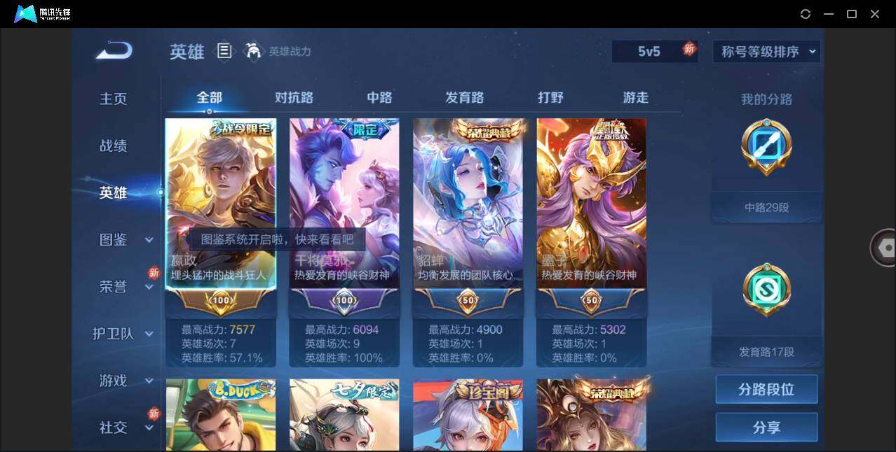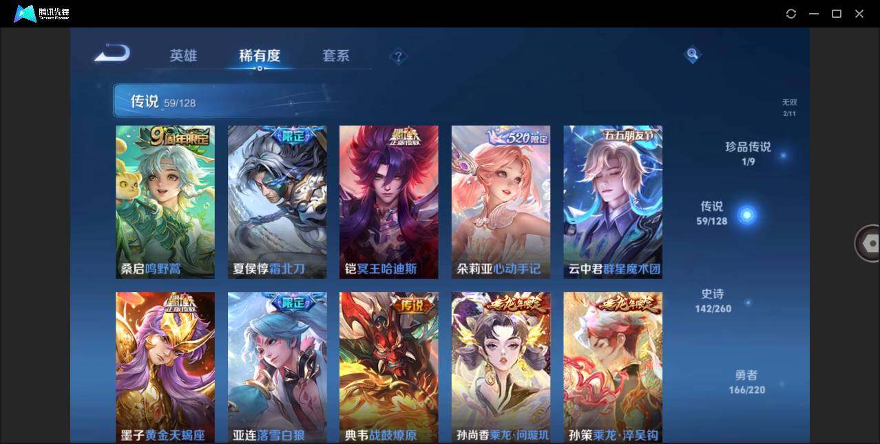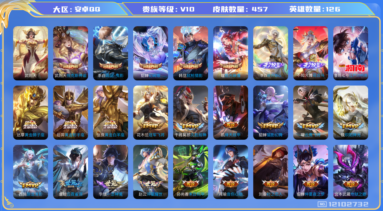 [12102732]【特价急出/详情看图】:安卓Q-V10-至尊星耀II段位-126英雄-454皮肤-5典藏-2无双-1珍品传说-59传说-141史诗
