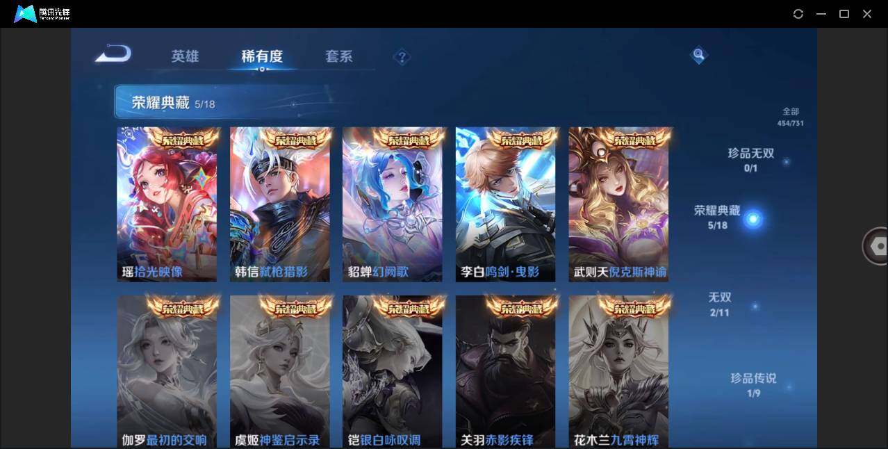 【荣耀典藏】:武则天英雄,武则天倪克斯神谕,李白鸣剑曳影,貂蝉幻阙歌,韩信弑枪猎影,瑶拾光映像