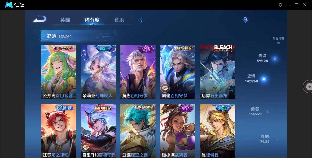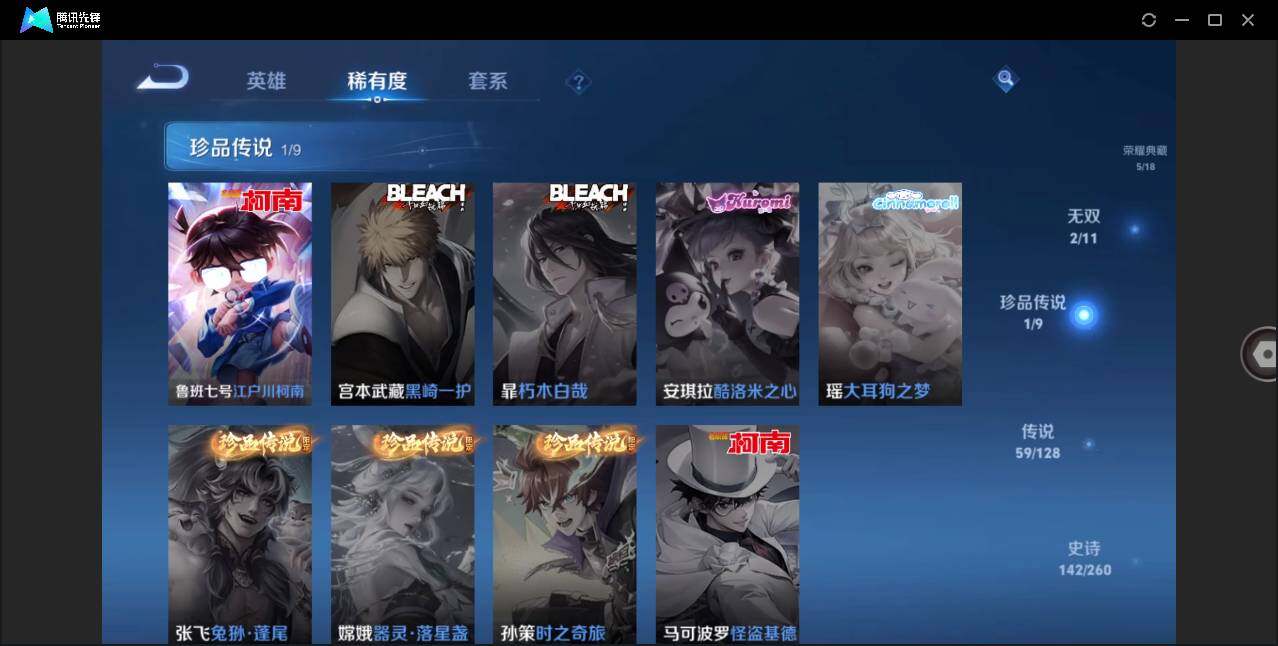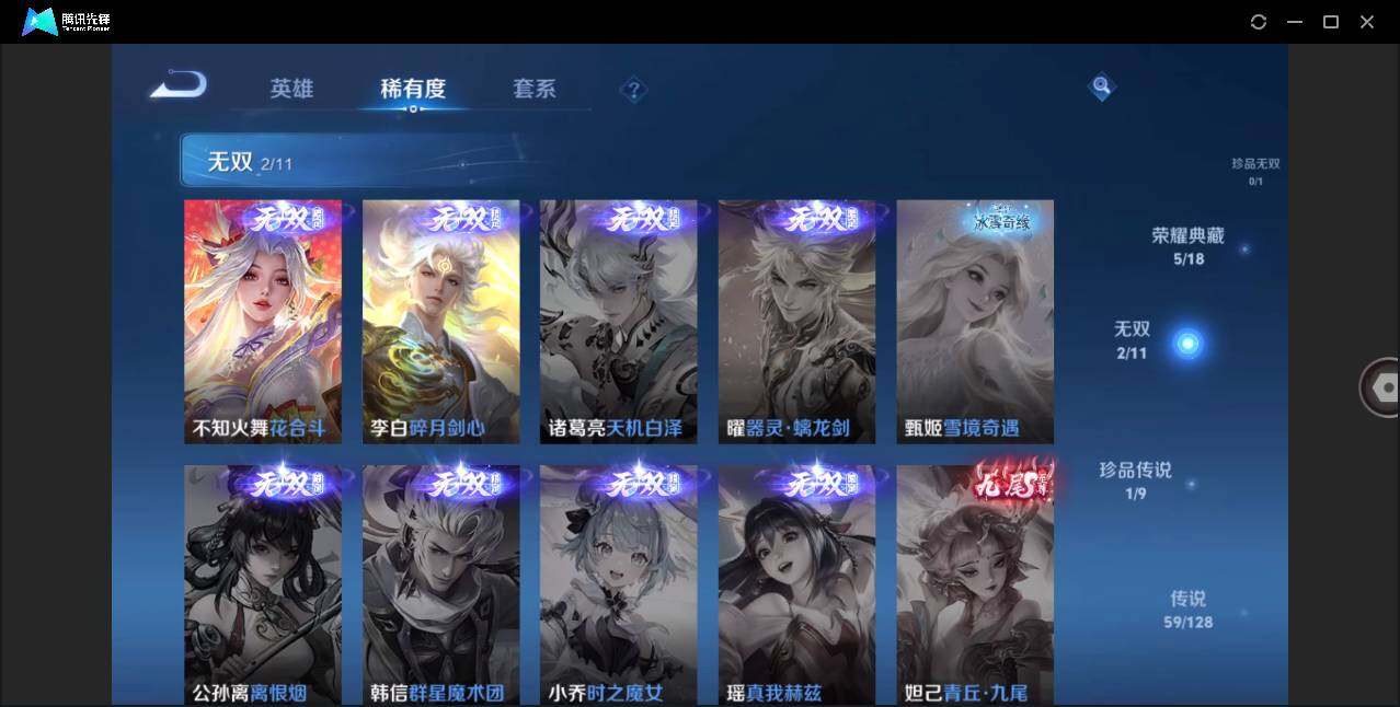 - PX_2097283-51 苹果微信/至尊星耀/109皮肤/108英雄/1典藏/0珍品无双/1无双/0珍品传说/18传说/36史诗/8稀有英雄 【1 典藏皮肤】全息碎影 孙悟空, 【1 无双皮肤】器灵·螭龙剑 曜, 【18 传说皮肤】启明星使 虞姬,逐花归海 澜,云鹰飞将 曜,仲夏夜之梦 貂蝉,惊梅引 宫本武藏,炽阳神光 镜,久胜战神 干将莫邪,末日机甲 孙尚香,末日机甲 孙策,一念神魔 李信,战