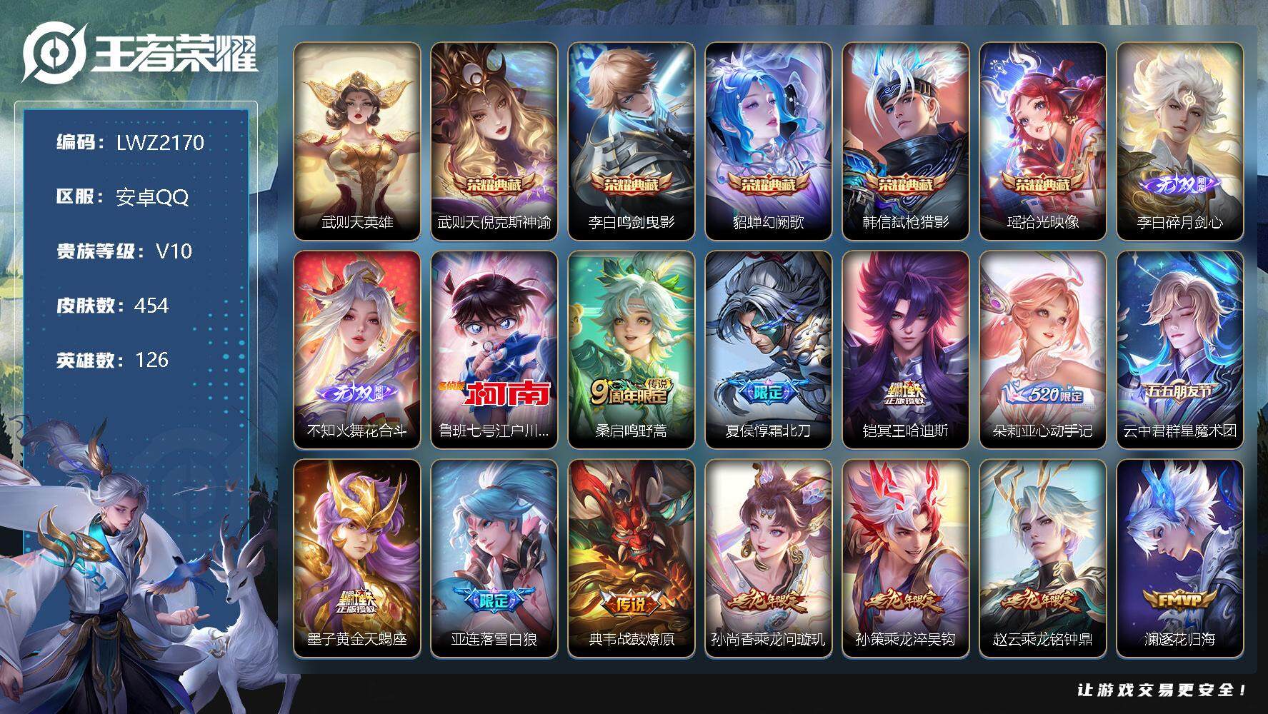 [12102732]【特价急出/详情看图】:安卓Q-V10-至尊星耀II段位-126英雄-454皮肤-5典藏-2无双-1珍品传说-59传说-141史诗 【荣耀典藏】:武则天英雄,武则天倪克斯神谕,李白鸣剑曳影,貂蝉幻阙歌,韩信弑枪猎影,瑶拾光映像 【无双皮肤】:李白碎月剑心,不知火舞花合斗 【珍品传说】:鲁班七号江户川柯南 【传说皮肤】:桑启鸣野蒿,夏侯惇霜北刀,铠冥王哈迪斯,朵莉亚心动手记,云中君群星魔术团,墨子黄金天蝎座,亚连落雪白狼,典韦战鼓燎原,孙尚香乘龙问璇玑,孙策乘龙淬吴钩,赵云乘龙铭钟鼎,澜逐花归海,艾琳觅芳踪,狄仁杰夜礼服假面,王昭君永恒水手月亮,宫本武藏惊梅引,云缨鹤归松栖,马可波罗妄想实况,东皇太一灼幽烈阳,诸葛亮鹤羽星尊,夏洛特浮生妄,干将莫邪画中仙,孙悟空齐天大圣,小乔山海琳琅生,曜山海苍雷引,李信山海炽霜斩,李白诗剑行,百里守约碎云,蔡文姬花朝如约,女娲补天,裴擒虎寅虎赤拳,孙尚香异界灵契,赵云淬星耀世,王昭君乞巧织情,西施游龙清影,周瑜音你心动,李元芳飞鸢探春,公孙离祈雪灵祝,诸葛亮时雨天司,铠绛天战甲,镜炽阳神光,虞姬启明星使,关羽武圣,曜云鹰飞将,李信一念神魔,刘备时之恋人,貂蝉猫影幻舞,张良黄金白羊座,干将莫邪久胜战神,虞姬云霓雀翎,达摩黄金狮子座,百里玄策白虎志,花木兰冠军飞将,梦奇胖达荣荣,后羿黄金射手座,貂蝉仲夏夜之梦,李白凤求凰,孙尚香末日机甲,宫本武藏地狱之眼 【限定皮肤】:夏侯惇霜北刀,铠冥王哈迪斯,暃埋骨钱,蒙犽顽岩魄,蔡文姬夏日便利店,大乔绒语心约,虞姬夏日便利店,姜子牙天穹之誓,狄仁杰阴阳师,小乔山海琳琅生,赵云皇家上将,赵云引擎之心,墨子神迹守卫,嬴政优雅恋人,嬴政白昼王子,孙尚香异界灵契,鲁班七号狮舞东方,高渐离死亡摇滚,扁鹊奇幻香踪,芈月白晶晶,吕布猎兽之王,周瑜赤莲之焰,元歌云间偶戏,元歌无心,夏侯惇朔风刀,甄姬幽恒,甄姬女儿国国王,典韦蓝屏警告,典韦岱宗,马可波罗暗影游猎,马可波罗妄想实况,狄仁杰魔术师,狄仁杰万华元夜,达摩沙漠行僧,项羽海滩派对,老夫子醍醐杖,老夫子航海奇遇记,关羽冰锋战神,关羽武圣,貂蝉逐梦之音,程咬金演武夺筹,兰陵王驯魔猎人,花木兰青春决赛季,花木兰瑞麟志,亚瑟潮玩骑士王,孙悟空美猴王,孙悟空至尊宝,孙悟空大圣娶亲,孙悟空孙行者,孙悟空齐天大圣,牛魔御旌,李元芳云中旅人,虞姬启明星使,钟馗神迹守卫,钟