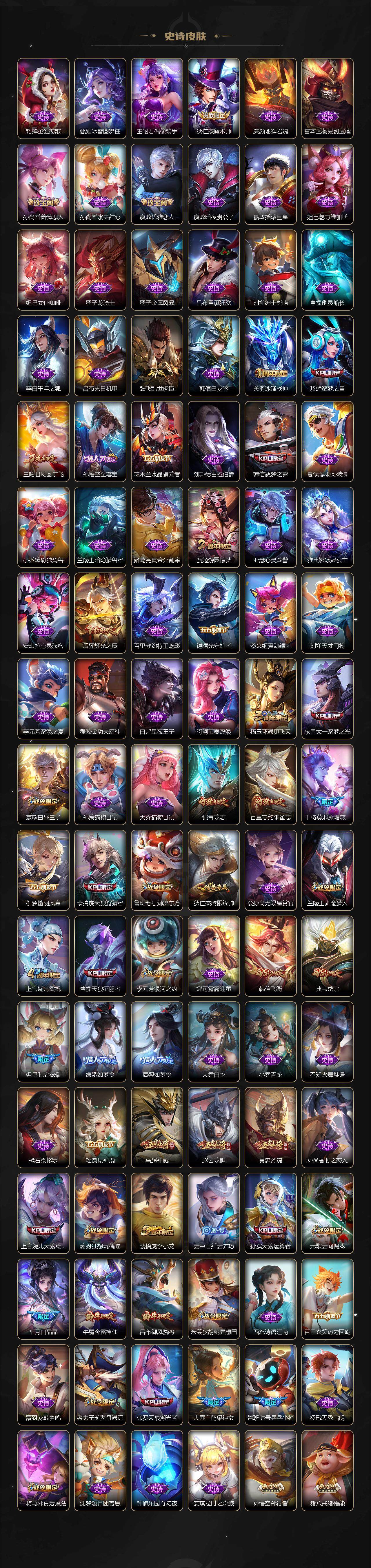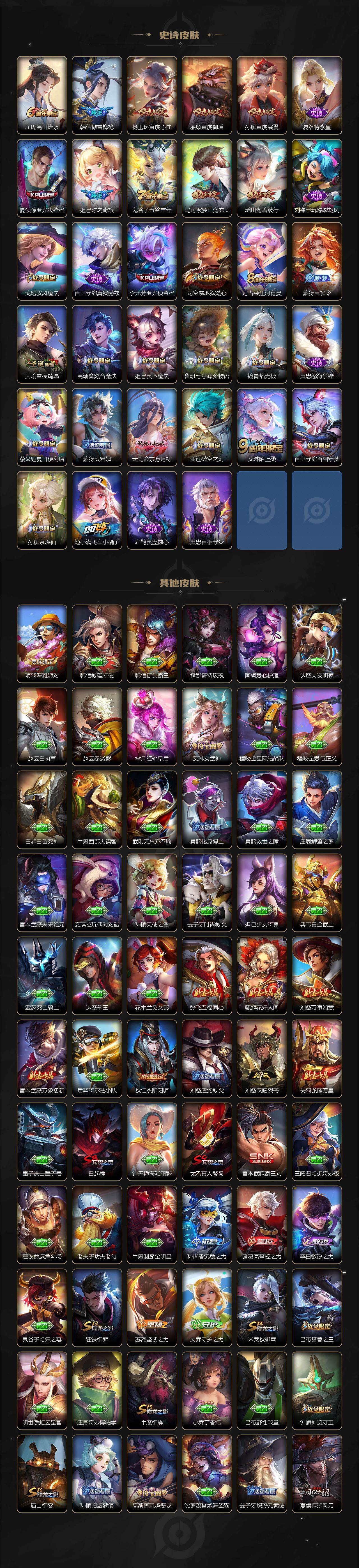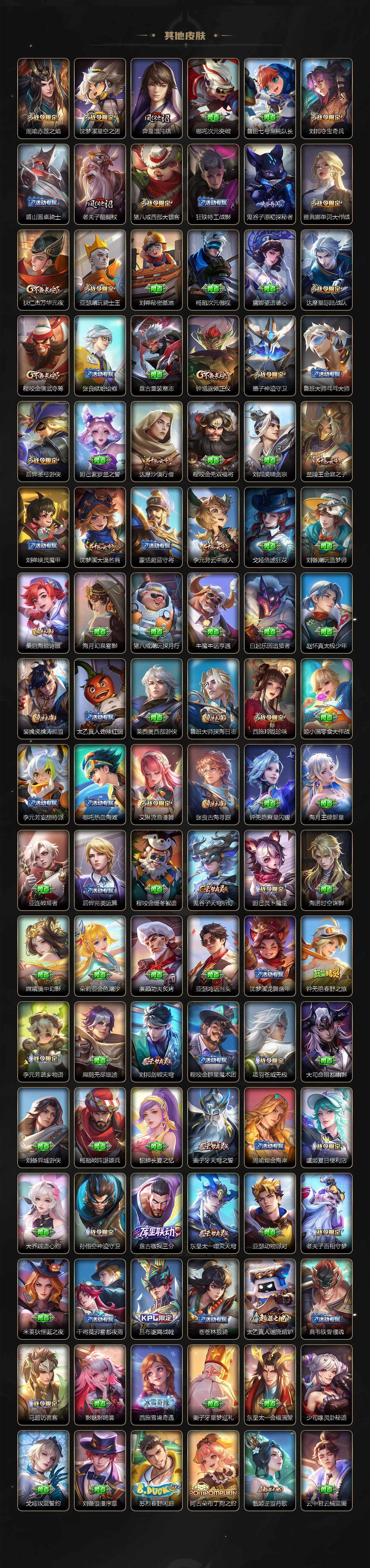 关羽冰锋战神,裴擒虎李小龙,上官婉儿梁祝,牛魔奔雷神使,貂蝉逐梦之音,公孙离祈雪灵祝,吕布御风骁将,诸葛亮时雨天司,赵云龙胆,关羽武圣,黄忠烈魂,马超神威,后羿辉光之辰,典韦岱宗,韩信飞衡,伽罗太华,曹操天狼征服者,裴擒虎天狼狩猎者,孙膑天狼运算者,上官婉儿天狼绘梦者,伽罗天狼溯光者,韩信逐梦之影,东皇太一逐梦之光,铠青龙志,百里守约朱雀志,王昭君凤凰于飞,后羿如梦令,嫦娥如梦令,孙悟空至尊宝,干将莫邪冰霜恋舞曲,妲己时之彼端,芈月白晶晶,鲁班七号乒乒小将,大乔白鹤梁神女,猪八戒猪悟能,廉颇寅虎·御盾,孙尚香异界灵契,孙悟空孙行者,韩信傲雪梅枪,鲁班七号寅虎·瑞焰,孙膑寅虎·展翼,杨玉环寅虎·心曲,裴擒虎寅虎·赤拳,露娜启示之音,夏侯惇匿光决锋者,后羿无尽星芒,马可波罗深海之息,妲己时之奇旅,马可波罗山海·玄木吟,瑶山海·碧波行,桑启鸣野蒿,艾琳陌上桑