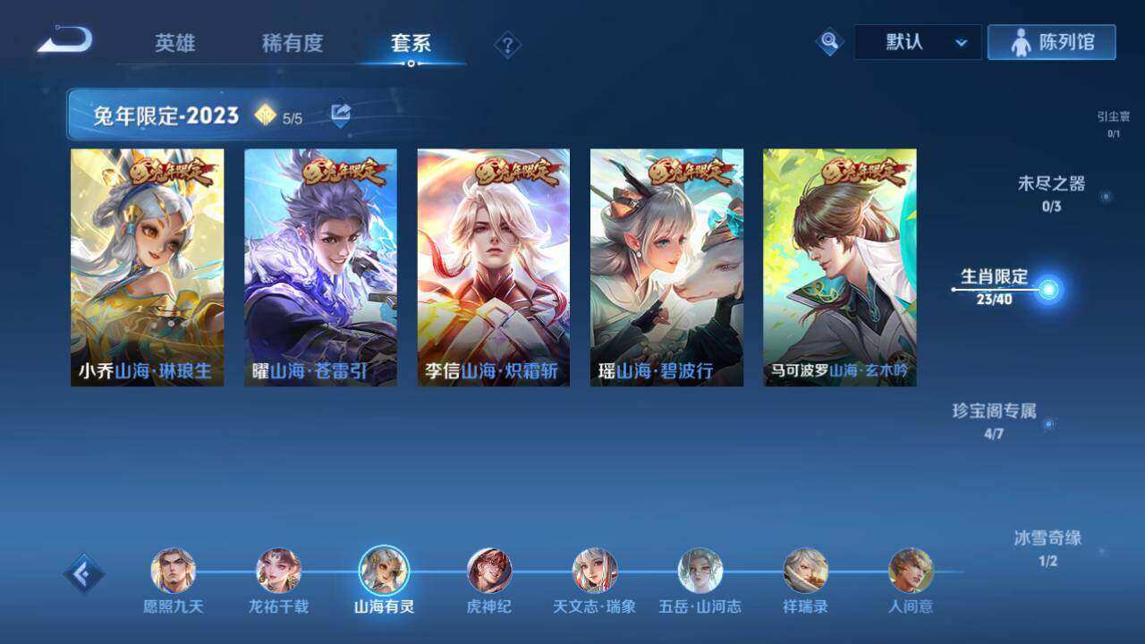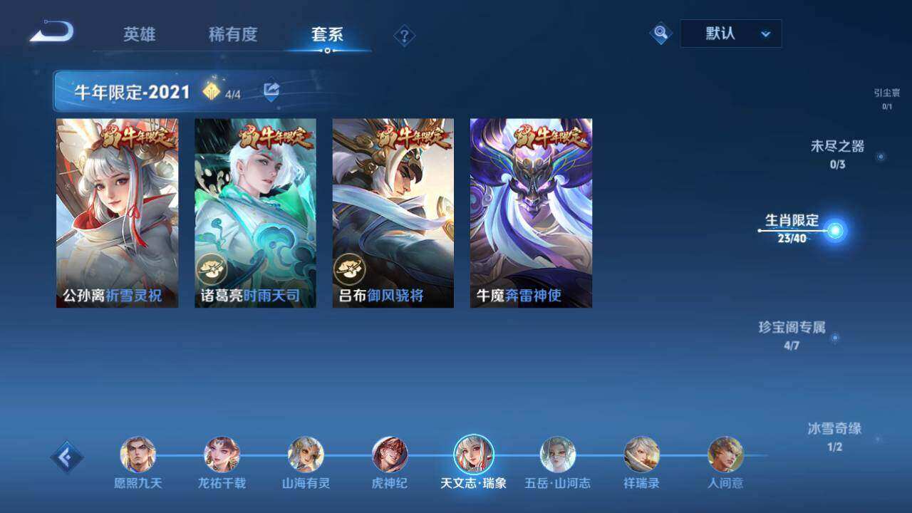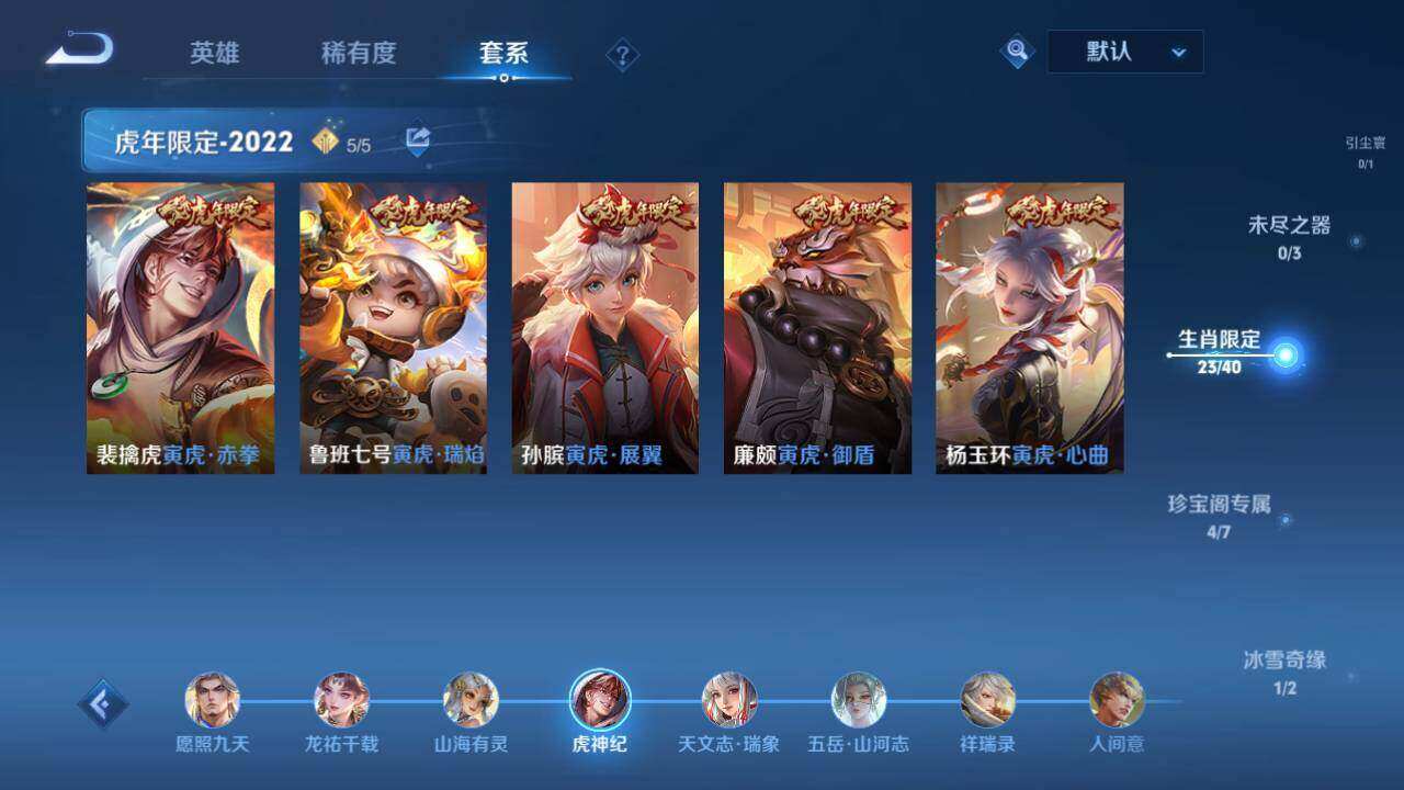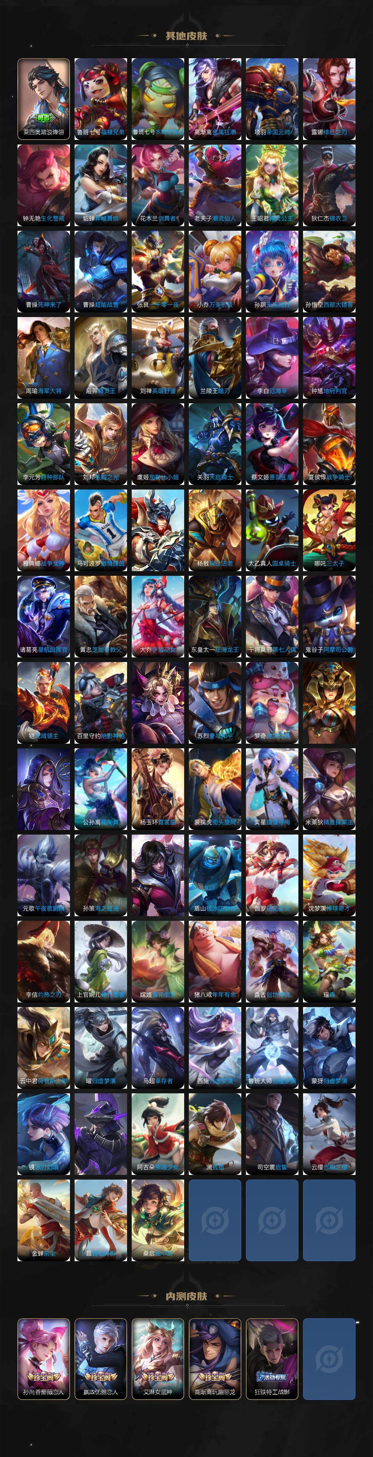关羽冰锋战神,裴擒虎李小龙,上官婉儿梁祝,牛魔奔雷神使,貂蝉逐梦之音,公孙离祈雪灵祝,吕布御风骁将,诸葛亮时雨天司,赵云龙胆,关羽武圣,黄忠烈魂,马超神威,后羿辉光之辰,典韦岱宗,韩信飞衡,伽罗太华,曹操天狼征服者,裴擒虎天狼狩猎者,孙膑天狼运算者,上官婉儿天狼绘梦者,伽罗天狼溯光者,韩信逐梦之影,东皇太一逐梦之光,铠青龙志,百里守约朱雀志,王昭君凤凰于飞,后羿如梦令,嫦娥如梦令,孙悟空至尊宝,干将莫邪冰霜恋舞曲,妲己时之彼端,芈月白晶晶,鲁班七号乒乒小将,大乔白鹤梁神女,猪八戒猪悟能,廉颇寅虎·御盾,孙尚香异界灵契,孙悟空孙行者,韩信傲雪梅枪,鲁班七号寅虎·瑞焰,孙膑寅虎·展翼,杨玉环寅虎·心曲,裴擒虎寅虎·赤拳,露娜启示之音,夏侯惇匿光决锋者,后羿无尽星芒,马可波罗深海之息,妲己时之奇旅,马可波罗山海·玄木吟,瑶山海·碧波行,桑启鸣野蒿,艾琳陌上桑