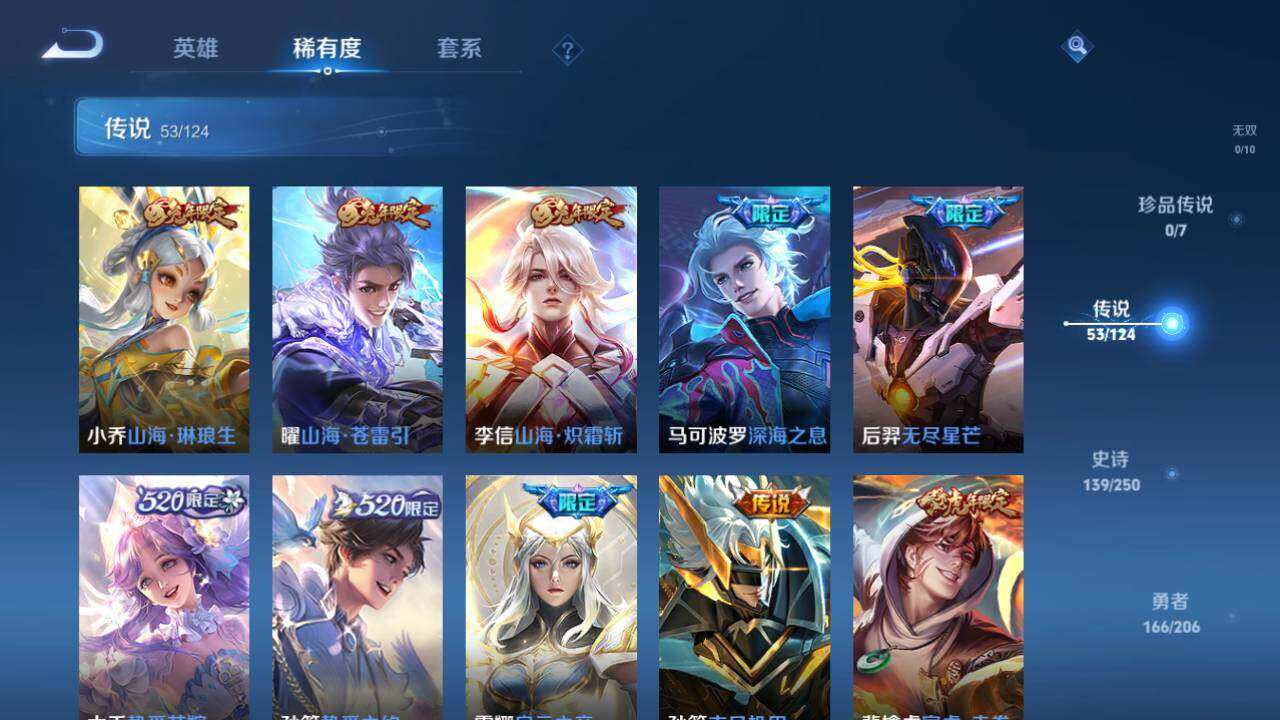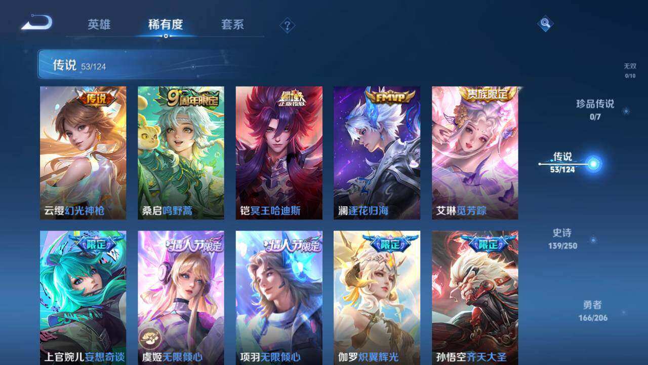 【传说皮肤】:云缨幻光神枪,桑启鸣野蒿,铠冥王哈迪斯,澜逐花归海,艾琳觅芳踪,上官婉儿妄想奇谈,虞姬无限倾心,项羽无限倾心,伽罗炽翼辉光,孙悟空齐天大圣,小乔山海琳琅生,曜山海苍雷引,李信山海炽霜斩,马可波罗深海之息,后羿无尽星芒,大乔挚爱花嫁,孙策挚爱之约,露娜启示之音,孙策末日机甲,裴擒虎寅虎赤拳,鲁班七号寅虎瑞焰,孙尚香异界灵契,赵云淬星耀世,王昭君乞巧织情,曜李逍遥 ,李元芳飞鸢探春,公孙离祈雪灵祝,诸葛亮时雨天司,铠绛天战甲,镜炽阳神光,虞姬启明星使,孙悟空零号赤焰,关羽武圣,曜云鹰飞将,李信一念神魔,刘备时之恋人,伽罗太华,貂蝉猫影幻舞,张良黄金白羊座,干将莫邪久胜战神,虞姬云霓雀翎,达摩黄金狮子座,花木兰冠军飞将,梦奇胖达荣荣,后羿黄金射手座,杨戬永曜之星,貂蝉仲夏夜之梦,李白凤求凰,孙尚香末日机甲,宫本武藏地狱之眼,孙悟空地狱火,武则天海洋之心,狄仁杰超时空战士