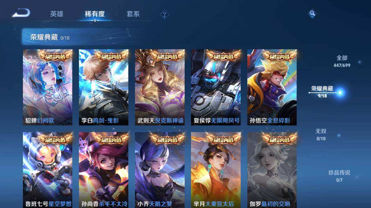 【荣耀典藏】:武则天英雄,孙悟空全息碎影,武则天倪克斯神谕,夏侯惇无限飓风号,小乔天鹅之梦,孙尚香杀手不太冷,鲁班七号星空梦想,芈月大秦宣太后,李白鸣剑曳影,貂蝉幻阙歌