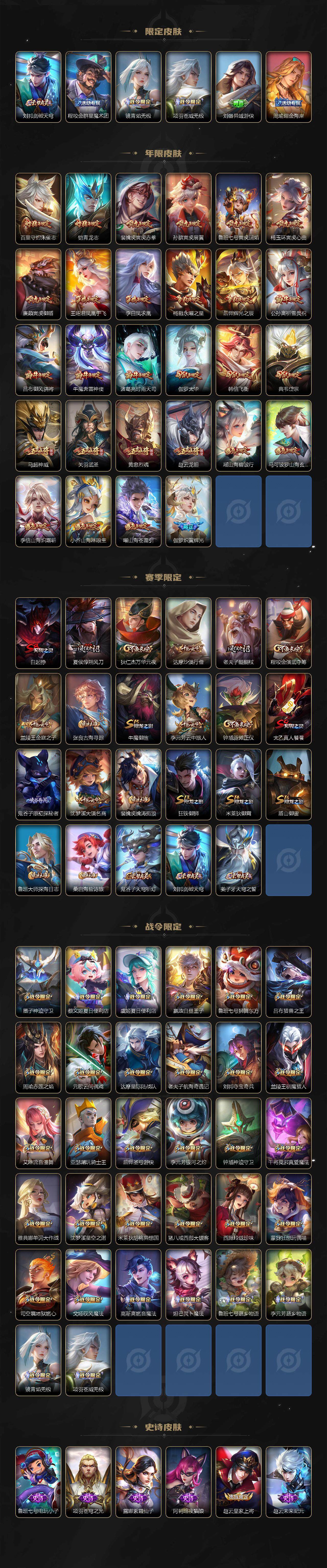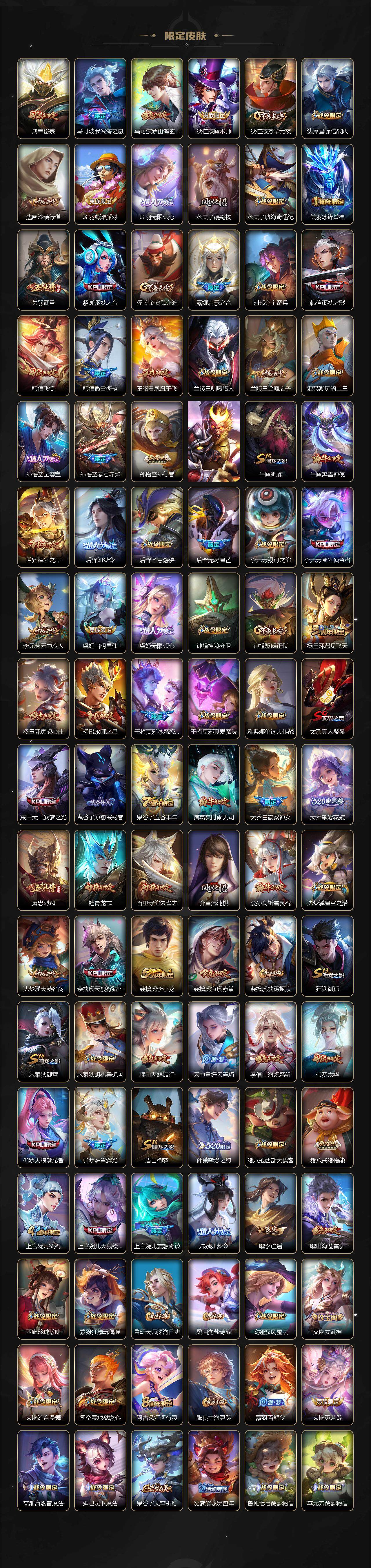【限定皮肤】:白起狰,铠冥王哈迪斯,蒙犽顽岩魄,蔡文姬夏日便利店,大乔绒语心约,虞姬夏日便利店,姜子牙天穹之誓,杨戬破阵退雄兵,狄仁杰阴阳师,廉颇寅虎御盾,小乔山海琳琅生,赵云皇家上将,赵云龙胆,墨子神迹守卫,妲己时之彼端,妲己时之奇旅,嬴政优雅恋人,嬴政白昼王子,孙尚香蔷薇恋人,孙尚香异界灵契,鲁班七号狮舞东方,鲁班七号乒乒小将,鲁班七号寅虎瑞焰,庄周高山流水,高渐离玩趣恶龙,孙膑天狼运算者,孙膑寅虎展翼,芈月白晶晶,吕布猎兽之王,吕布御风骁将,周瑜赤莲之焰,元歌云间偶戏,夏侯惇朔风刀,夏侯惇匿光决锋者,甄姬游园惊梦,曹操天狼征服者,典韦岱宗,马可波罗深海之息,马可波罗山海玄木吟,狄仁杰魔术师,狄仁杰万华元夜,达摩星际陆战队,达摩沙漠行僧,项羽海滩派对,项羽无限倾心,老夫子醍醐杖,老夫子航海奇遇记,关羽冰锋战神,关羽武圣,貂蝉逐梦之音,程咬金演武夺筹,露娜启示之音,刘邦夺宝奇兵,韩信逐梦之影,韩信飞衡,韩信傲雪梅枪,王昭君凤凰于飞,兰陵王驯魔猎人,兰陵王金庭之子,亚瑟潮玩骑士王,孙