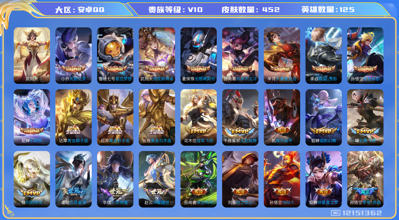 [12151362]【商品标题】:MQ626-安卓Q-V10-最强王者段位-126英雄-452皮肤-9典藏-0珍品无双-0无双-0珍品传说-53传说-141史诗