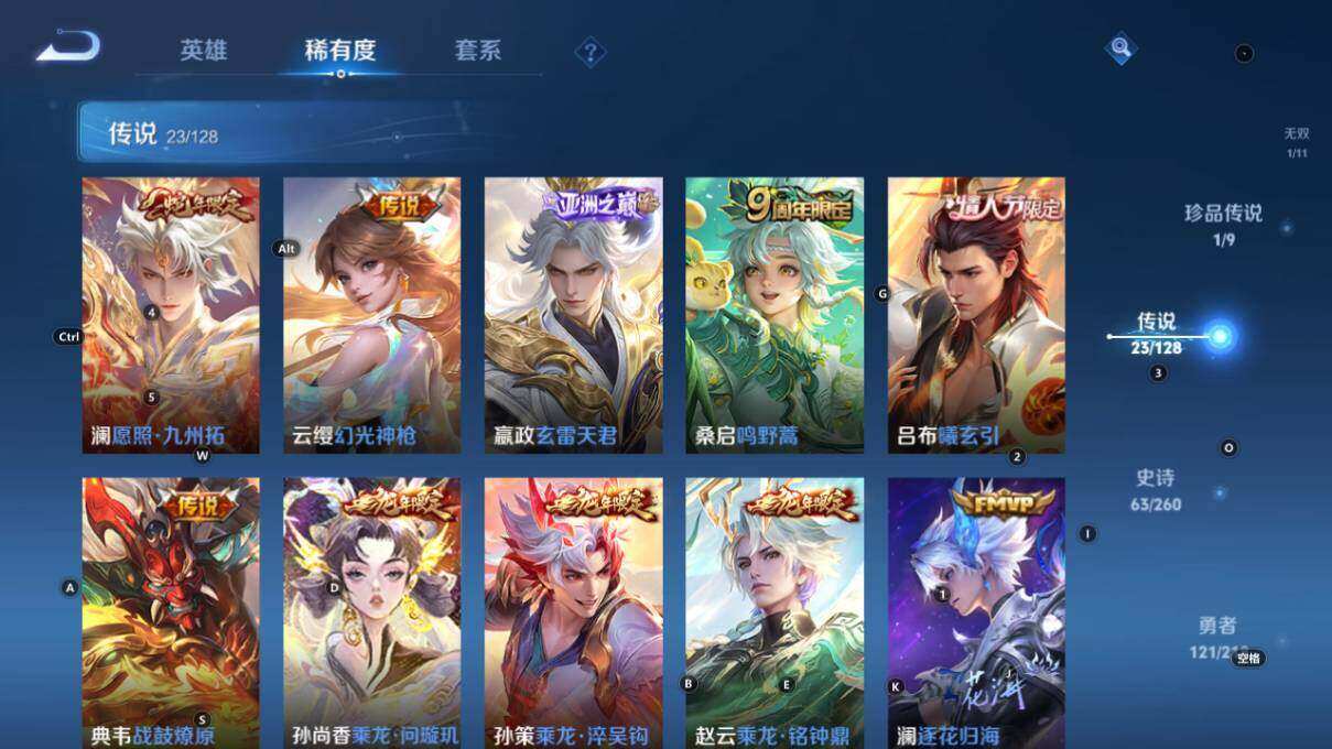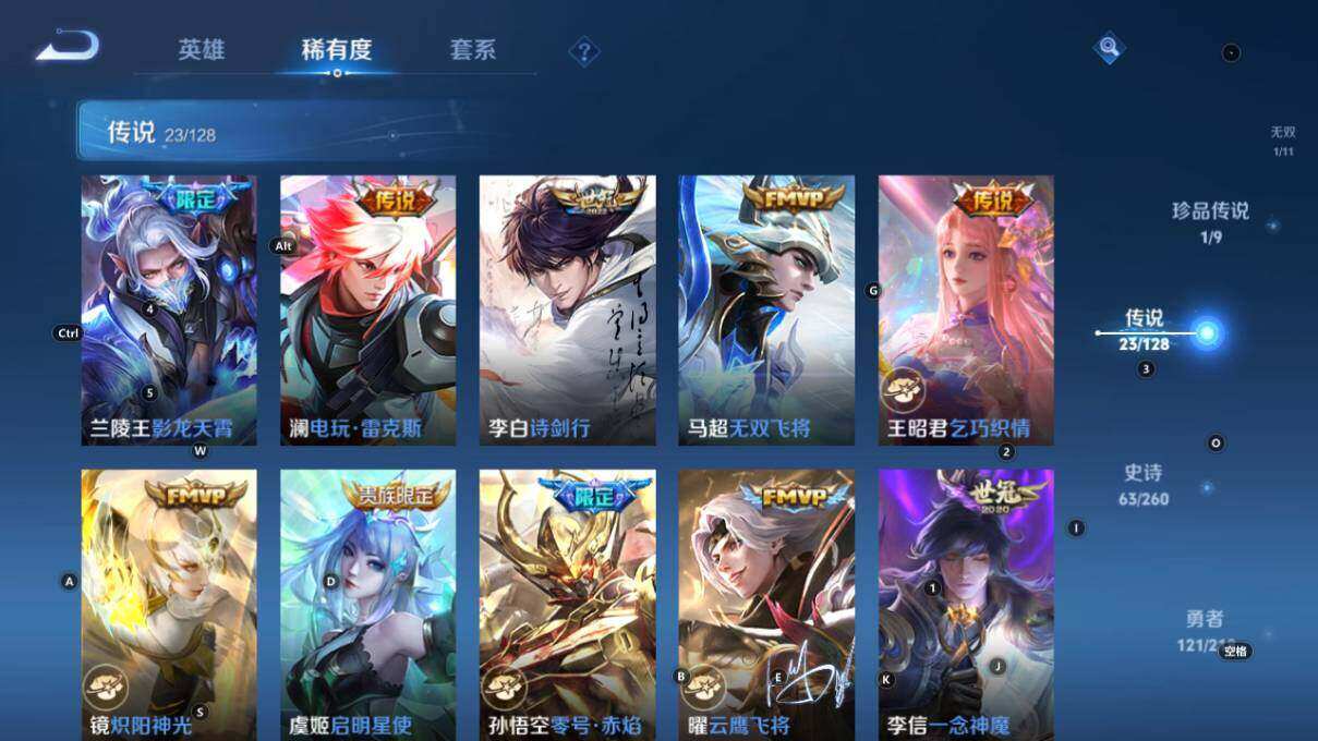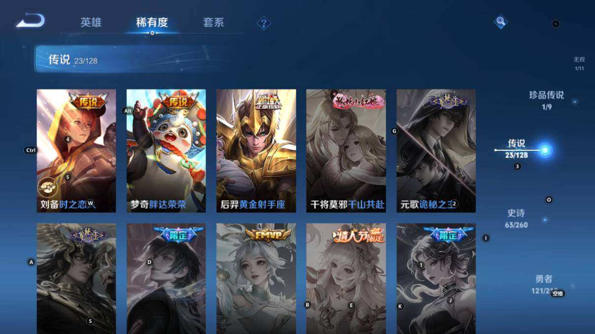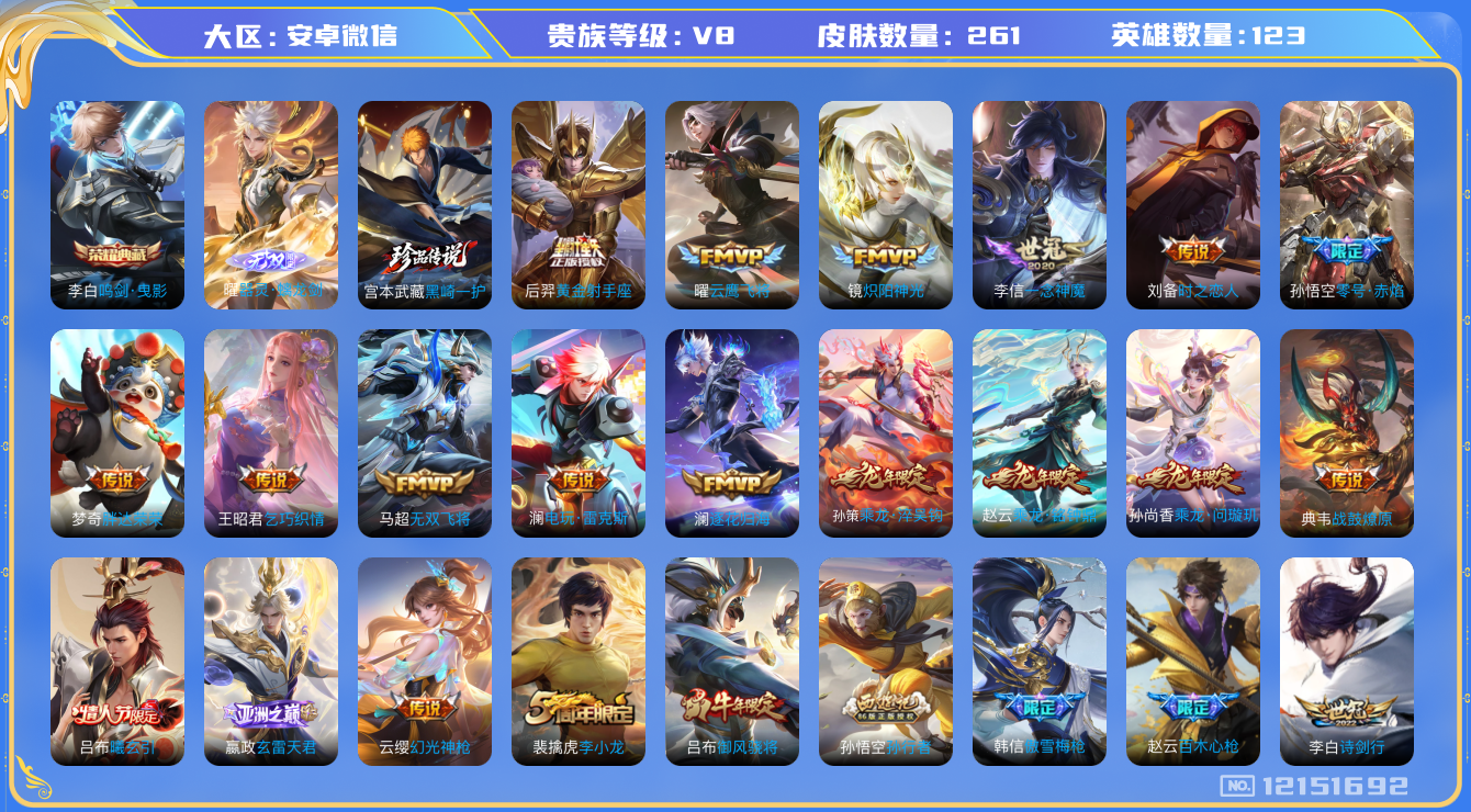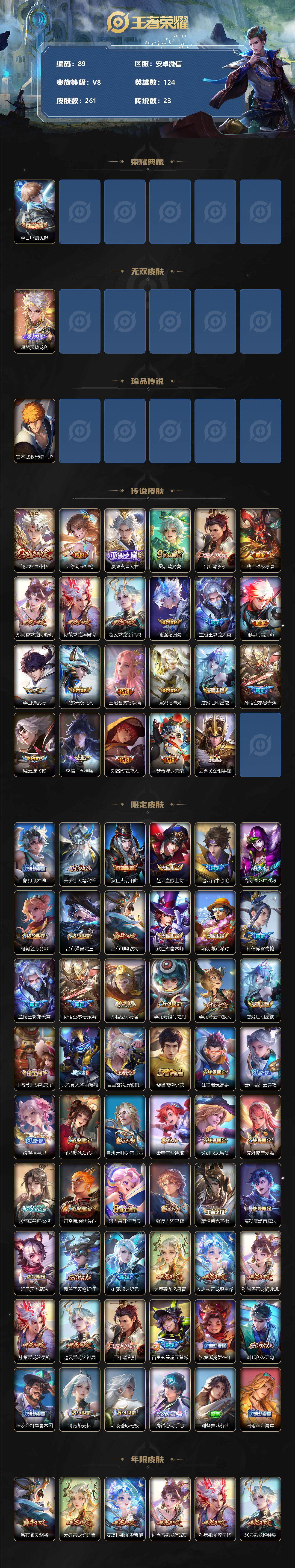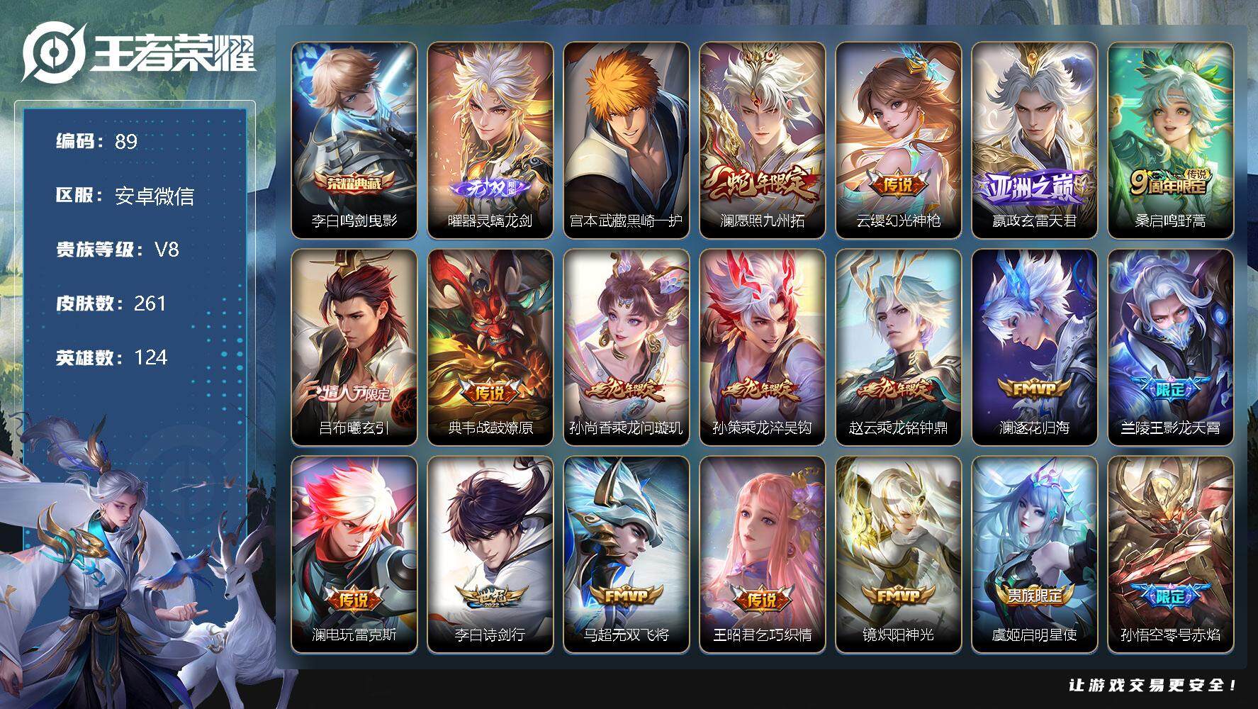 [12151692]【商品标题】:安卓WX-V8-最强王者段位-124英雄-261皮肤-1典藏-0珍品无双-1无双-1珍品传说-23传说-64史诗