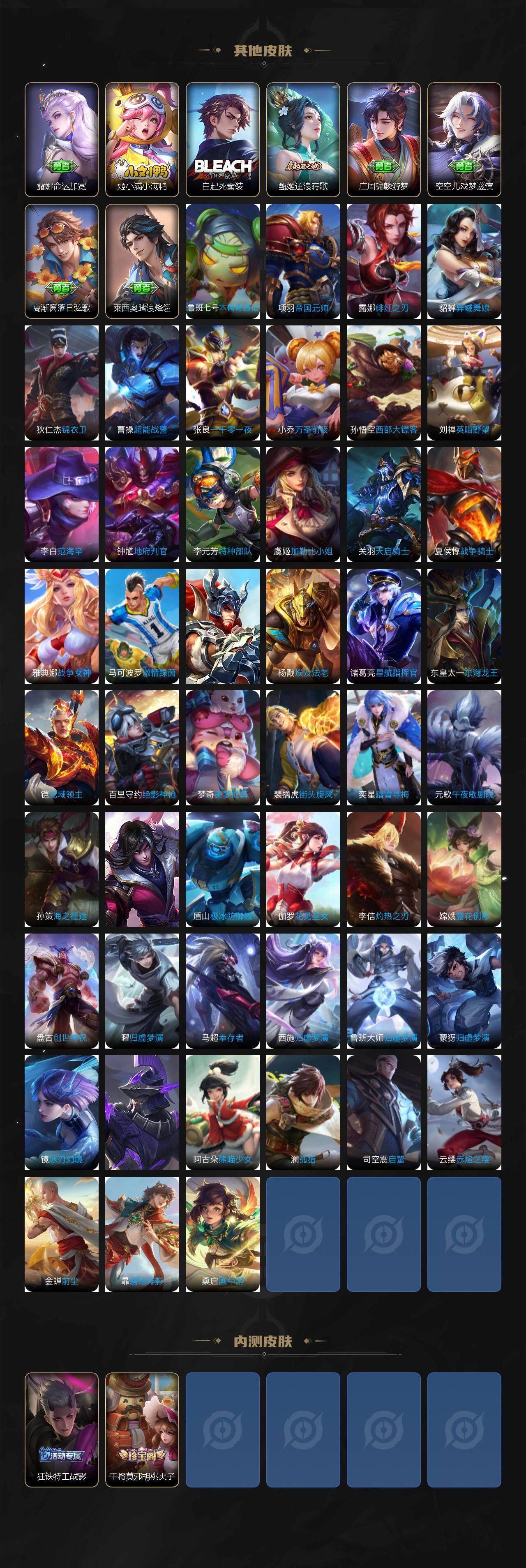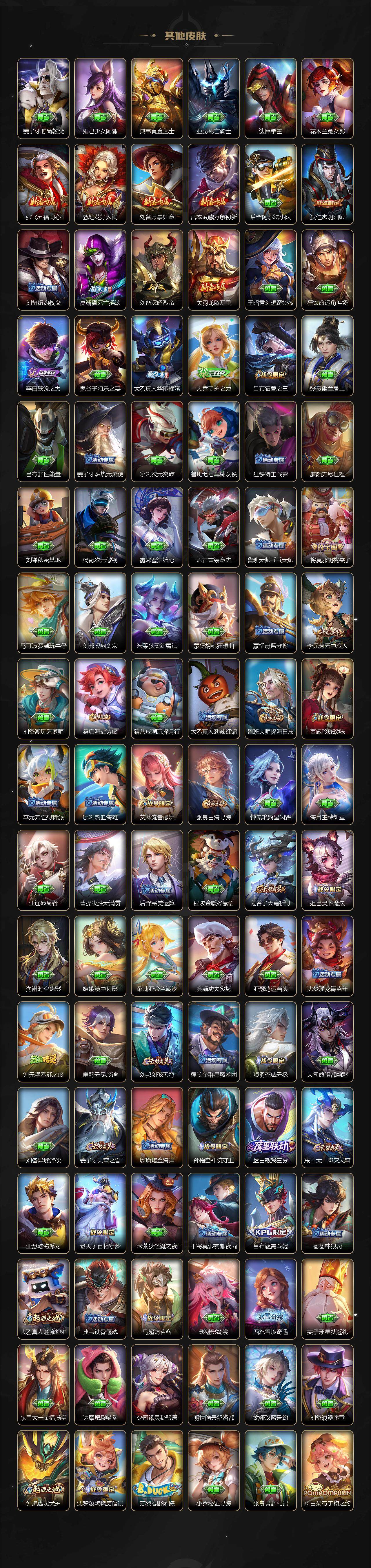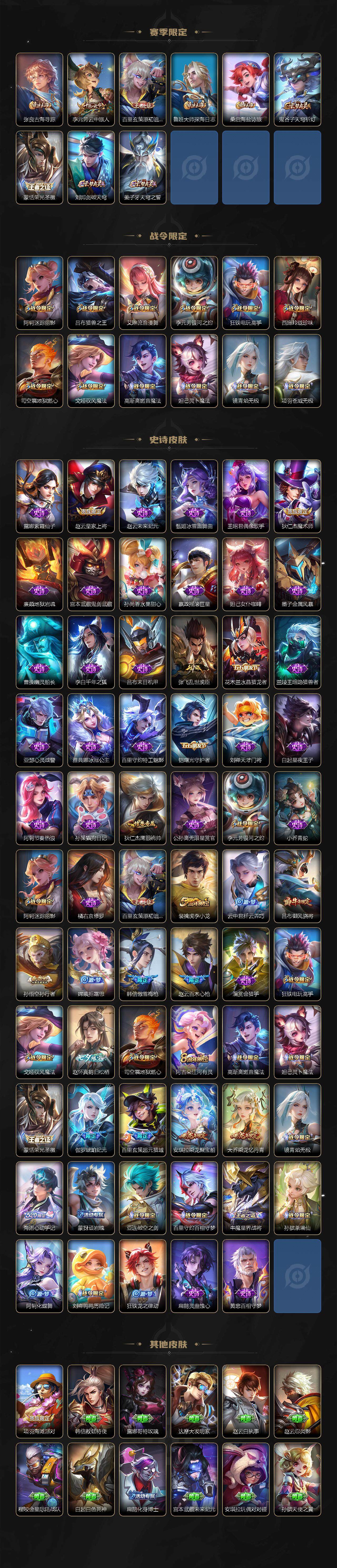 【限定皮肤】:蒙犽顽岩魄,姜子牙天穹之誓,狄仁杰阴阳师,赵云皇家上将,赵云百木心枪,高渐离死亡摇滚,阿轲迷踪丽影,吕布猎兽之王,吕布御风骁将,狄仁杰魔术师,项羽海滩派对,韩信傲雪梅枪,兰陵王影龙天霄,孙悟空零号赤焰,孙悟空孙行者,李元芳银河之约,李元芳云中旅人,虞姬启明星使,干将莫邪胡桃夹子,太乙真人华丽摇滚,百里玄策原初追逐者,裴擒虎李小龙,狂铁电玩高手,云中君纤云弄巧,嫦娥拒霜思,西施玲珑珍味,鲁班大师探海日志,桑启海盐诗旅,戈娅驭风魔法,艾琳流音漫舞,赵怀真鹤归松栖,司空震地狱燃心,阿古朵江河有灵,张良古海寻踪,蒙恬荣光圣徽,高渐离燃音魔法,妲己灵卜魔法,鬼谷子天穹祈灯,伽罗琥珀纪元,大乔乘龙忆丹青,安琪拉乘龙聚宝船,孙尚香乘龙问璇玑,孙策乘龙淬吴钩,赵云乘龙铭钟鼎,吕布曦玄引,百里玄策超元猎域,沈梦溪龙舞盛年,刘邦剑破天穹,程咬金群星魔术团,镜青焰无极,项羽苍威无极,海诺心动手记,刘备异域游侠,周瑜熔金海岸