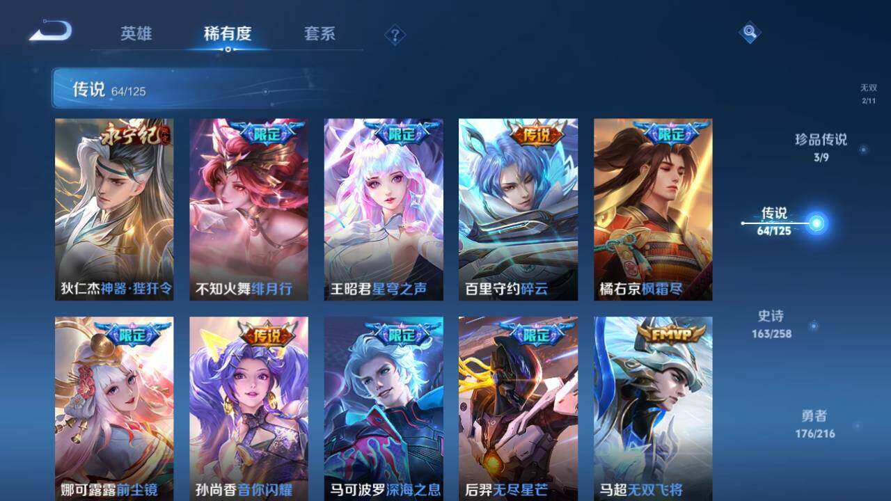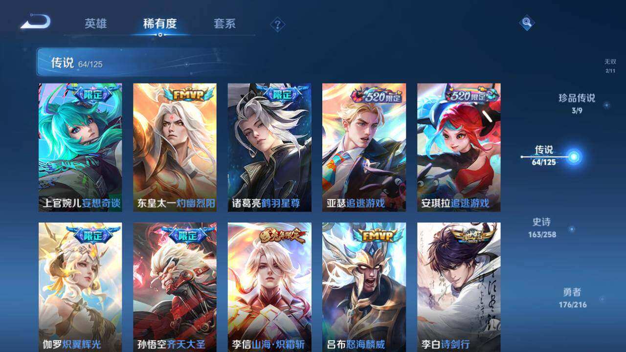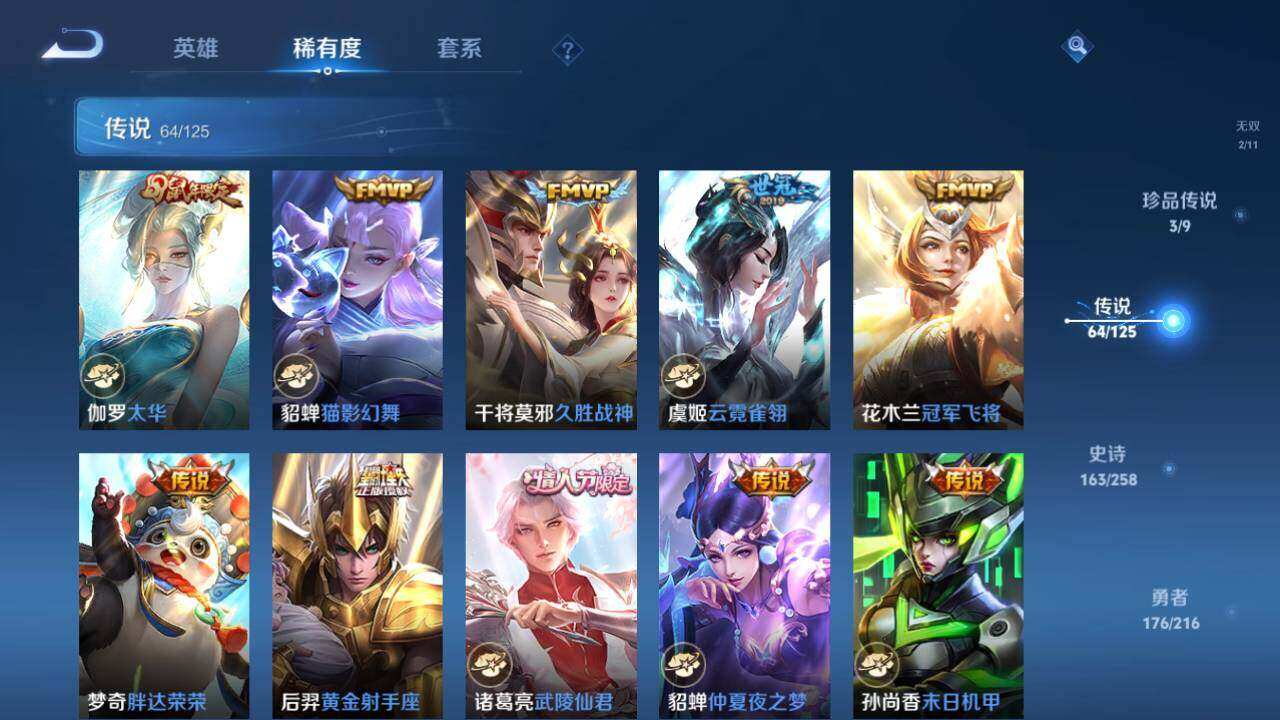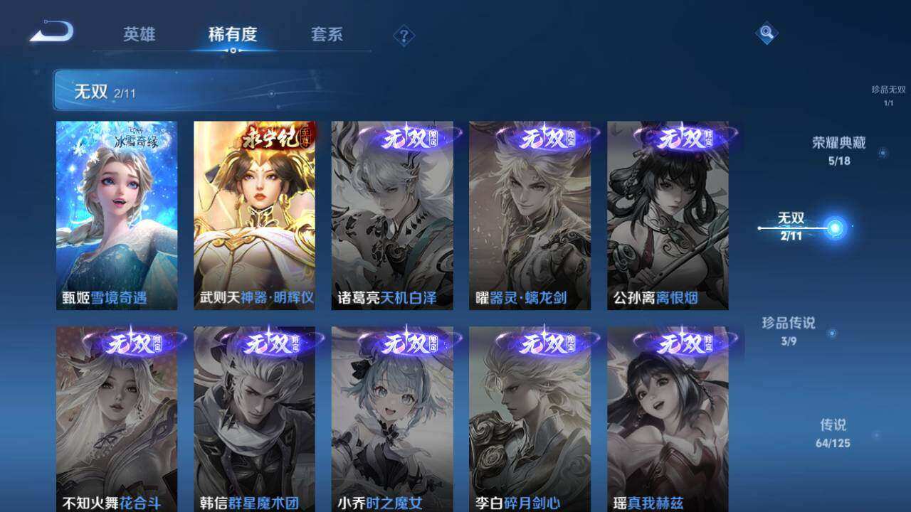 - PX_2096228-87 安卓QQ/无双王者/367皮肤/125英雄/3典藏/0珍品无双/2无双/2珍品传说/30传说/111史诗/9稀有英雄 【2 珍品传说】朽木白哉 暃,时之奇旅 孙策, 【3 典藏皮肤】鸣剑·曳影 李白,弑枪猎影 韩信,九霄神辉 花木兰, 【2 无双皮肤】群星魔术团 韩信,器灵·螭龙剑 曜, 【30 传说皮肤】启明星使 虞姬,逐花归海 澜,无双飞将 马超,李逍遥 曜,云鹰