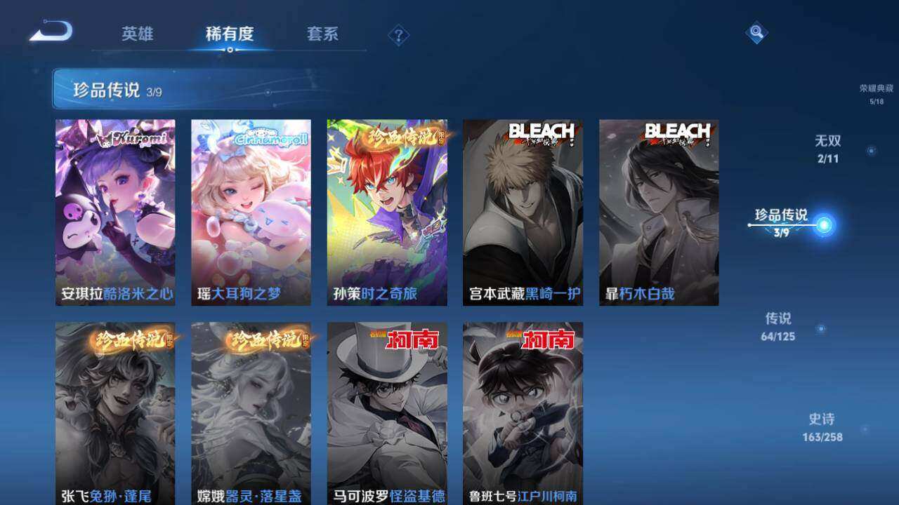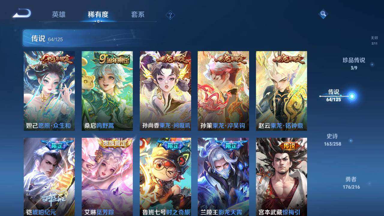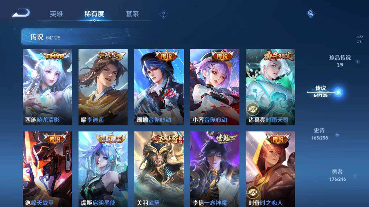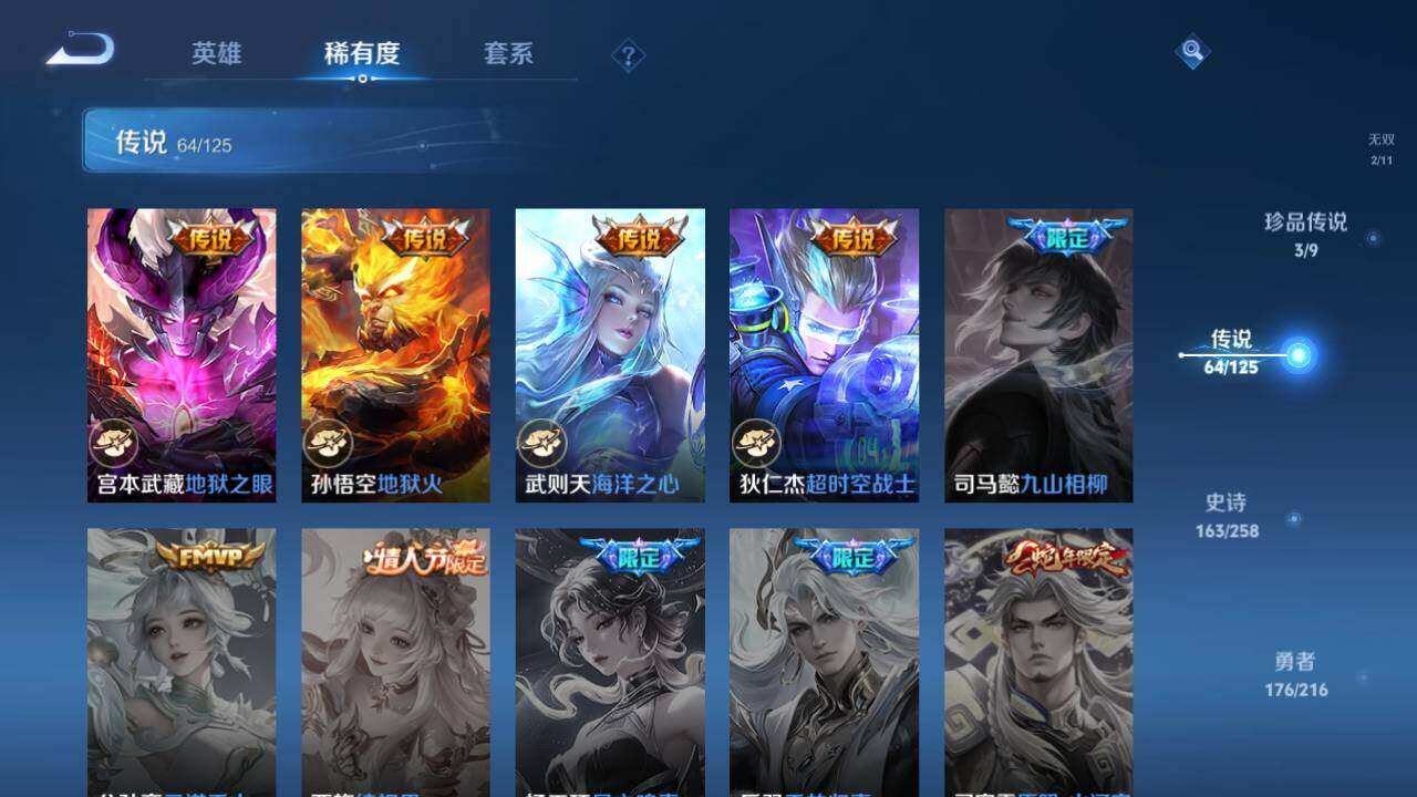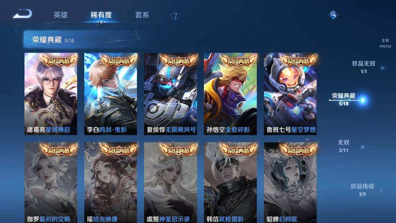 - PX_2096228-87 安卓QQ/无双王者/367皮肤/125英雄/3典藏/0珍品无双/2无双/2珍品传说/30传说/111史诗/9稀有英雄 【2 珍品传说】朽木白哉 暃,时之奇旅 孙策, 【3 典藏皮肤】鸣剑·曳影 李白,弑枪猎影 韩信,九霄神辉 花木兰, 【2 无双皮肤】群星魔术团 韩信,器灵·螭龙剑 曜, 【30 传说皮肤】启明星使 虞姬,逐花归海 澜,无双飞将 马超,李逍遥 曜,云鹰