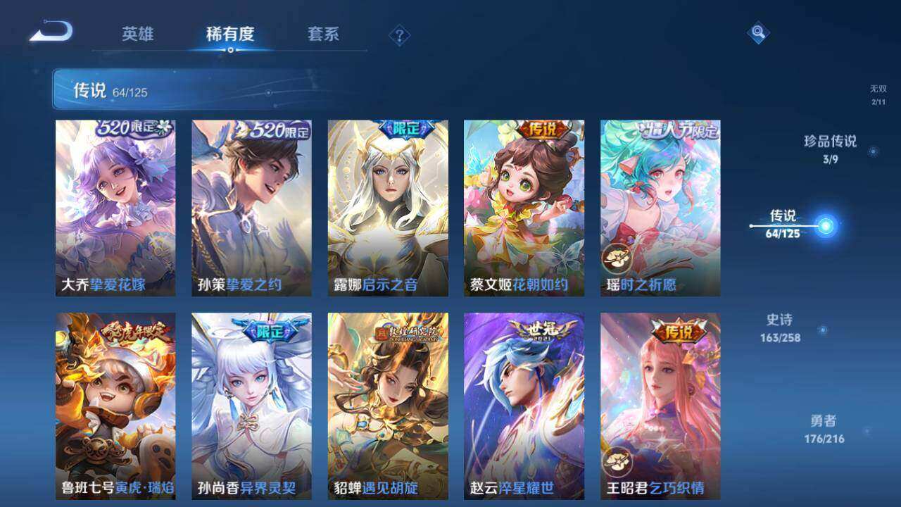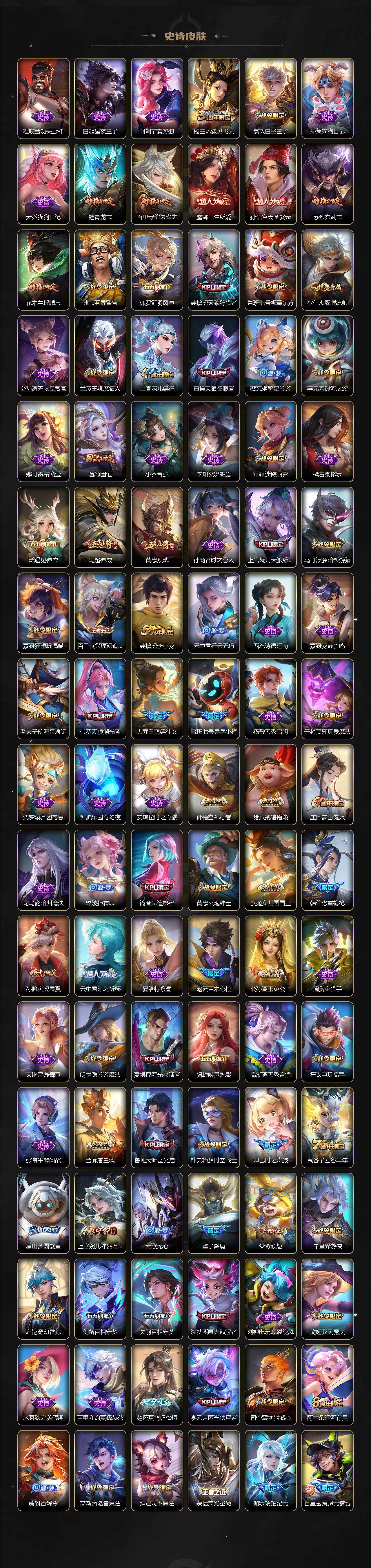 【传说皮肤】:妲己愿照众生和,桑启鸣野蒿,孙尚香乘龙问璇玑,孙策乘龙淬吴钩,赵云乘龙铭钟鼎,铠琥珀纪元,艾琳觅芳踪,鲁班七号时之奇旅,兰陵王影龙天霄,宫本武藏惊梅引,上官婉儿妄想奇谈,东皇太一灼幽烈阳,诸葛亮鹤羽星尊,亚瑟追逃游戏,安琪拉追逃游戏,伽罗炽翼辉光,孙悟空齐天大圣,李信山海炽霜斩,吕布怒海麟威,李白诗剑行,狄仁杰神器狴犴令,不知火舞绯月行,王昭君星穹之声,百里守约碎云,橘右京枫霜尽,娜可露露前尘镜,孙尚香音你闪耀,马可波罗深海之息,后羿无尽星芒,马超无双飞将,大乔挚爱花嫁,孙策挚爱之约,露娜启示之音,蔡文姬花朝如约,瑶时之祈愿,鲁班七号寅虎瑞焰,孙尚香异界灵契,貂蝉遇见胡旋,赵云淬星耀世,王昭君乞巧织情,西施游龙清影,曜李逍遥 ,周瑜音你心动,小乔音你心动,诸葛亮时雨天司,铠绛天战甲,虞姬启明星使,关羽武圣,李信一念神魔,刘备时之恋人,伽罗太华,貂蝉猫影幻舞,干将莫邪久胜战神,虞姬云霓雀翎,花木兰冠军飞将,梦奇胖达荣荣,后羿黄金射手座,诸葛亮武陵仙君,貂蝉仲夏夜之梦,孙尚香末日机甲,宫本武藏地狱之眼,孙悟空地狱火,武则天海洋之心,狄仁杰超时空战士