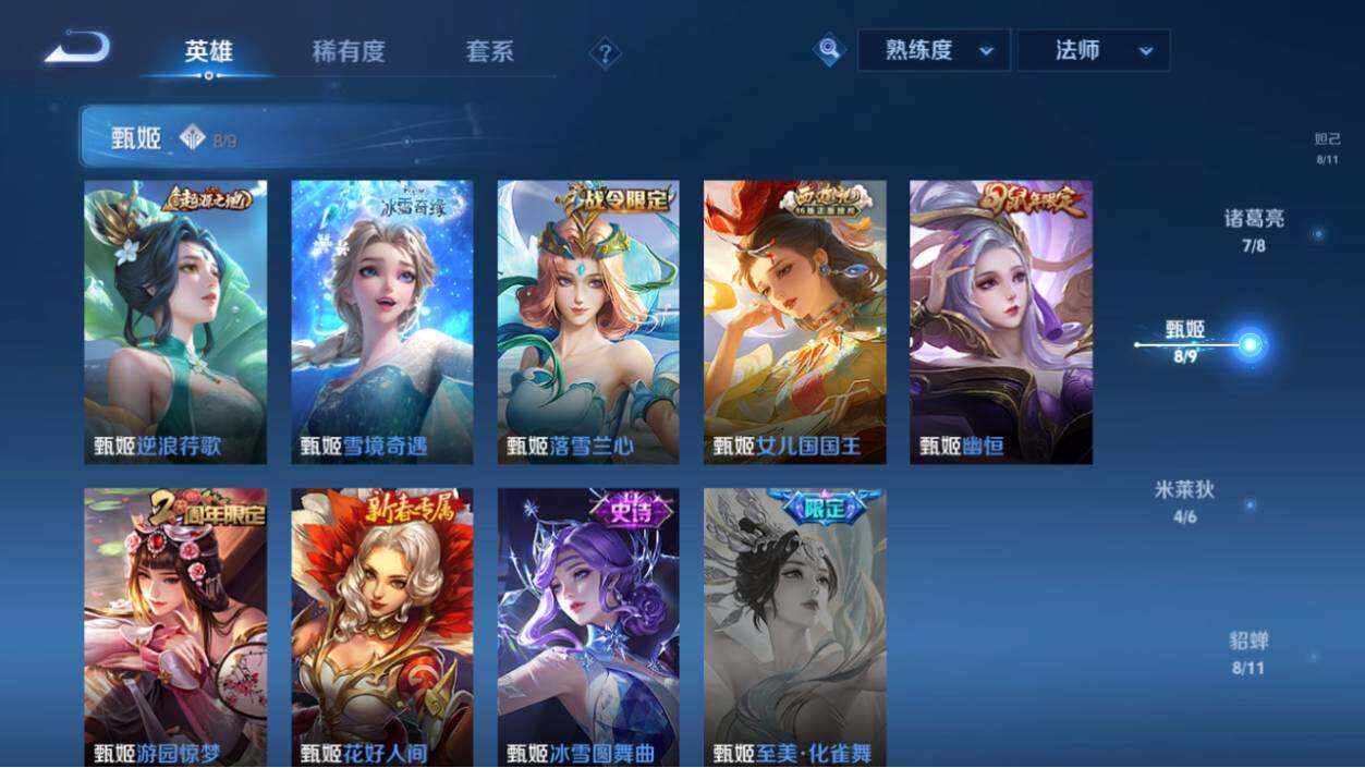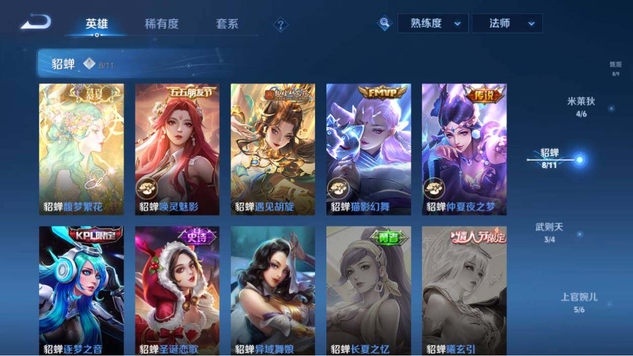 小乔青蛇,瑶遇见神鹿,娜可露露晚萤,伽罗箭羽风息,李元芳逐浪之夏,不知火舞魅语,公孙离无限星赏官,大乔猫狗日记,孙策猫狗日记,阿轲节奏热浪,露娜紫霞仙子,诸葛亮黄金分割率,王昭君偶像歌手,韩信白龙吟,项羽苍穹之光,孙尚香时之恋人,阿轲暗夜猫娘,雅典娜冰冠公主,吕布末日机甲,鲁班七号电玩小子,蒙犽龙鼓争鸣,橘右京修罗,墨子龙骑士,嬴政摇滚巨星,刘禅绅士熊喵,刘禅天才门将,白起星夜王子,安琪拉心灵骇客,安琪拉时之奇旅,程咬金功夫厨神,刘邦德古拉伯爵,兰陵王暗隐猎兽者,曹操幽灵船长,宫本武藏鬼剑武藏,司马懿暗渊魔法,亚瑟心灵战警,钟馗乐园奇幻夜,杨戬天秀·启明,蔡文姬舞动绿茵,廉颇地狱岩魂,西施诗语江南,小乔缤纷独角兽,夏侯惇乘风破浪,花木兰水晶猎龙者,铠曙光守护者,墨子金属风暴,百里玄策原初追逐者,吕布圣诞狂欢,貂蝉圣诞恋歌,百里守约特工魅影,嬴政暗夜贵公子,嫦娥拒霜思,李白千年之狐,夏洛特永昼,澜赏金猎手,艾琳奇遇舞章,貂蝉唤灵魅影,高渐离天秀·音浪,张良千筹问战,刘备百相守梦,关羽百相守梦,沈梦溪匿光破解者,刘禅电玩·爆裂旋风,百里守约真我赫兹,赵怀真鹤归松栖,李元芳匿光侦查者,蒙犽百解令,高渐离燃音魔法,伽罗琥珀纪元,大乔乘龙·忆丹青,安琪拉乘龙·聚宝船,关羽决胜骁骑,赵怀真器灵·浮梦炉