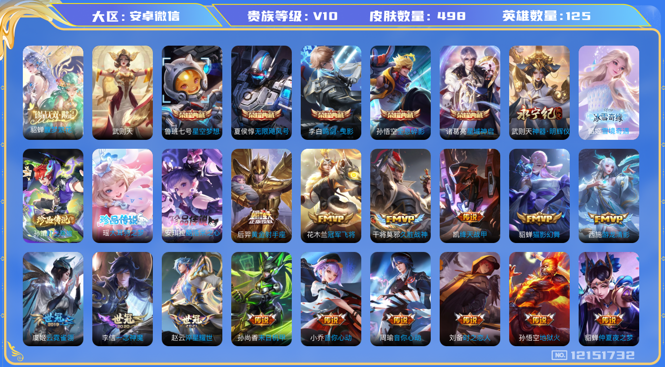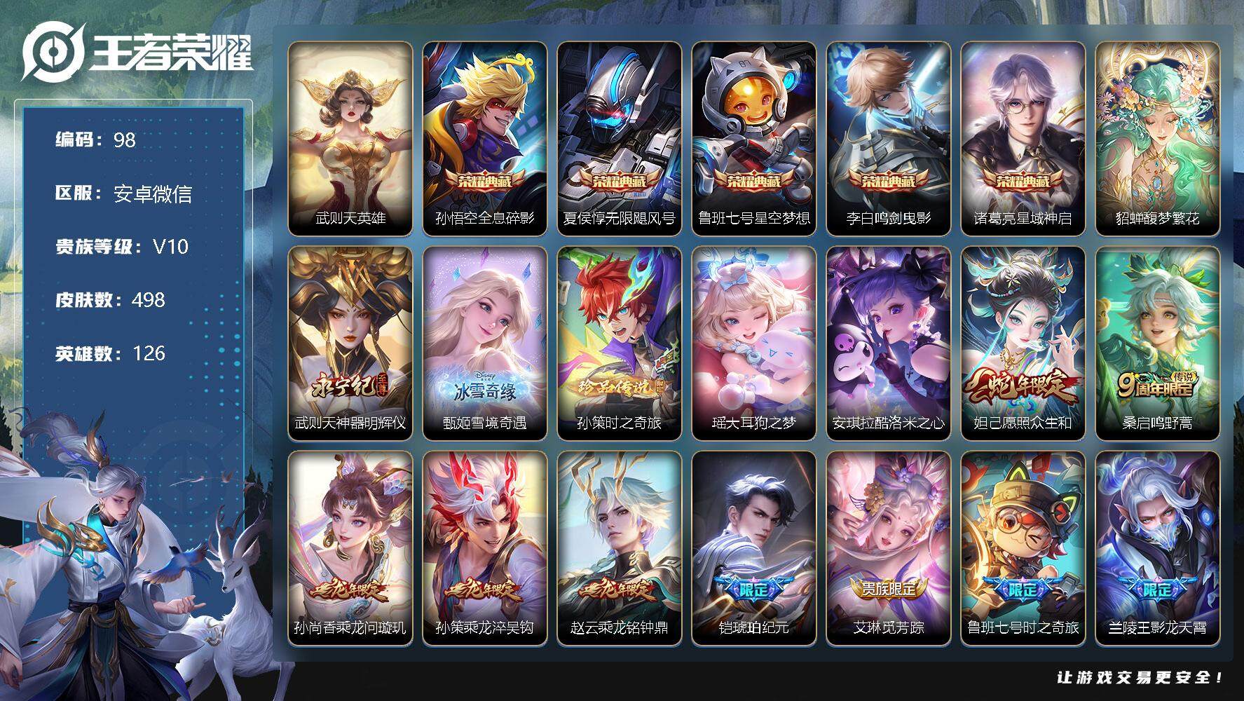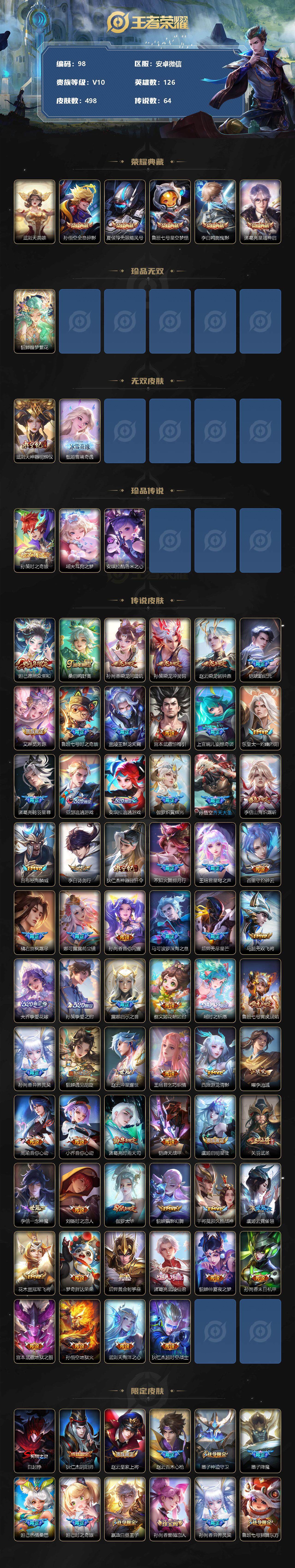 [12151732]【商品标题】:安卓WX-V10-最强王者段位-法师号!满安琪拉!-126英雄-498皮肤-5典藏-1珍品无双-2无双-3珍品传说-64传说-162史诗