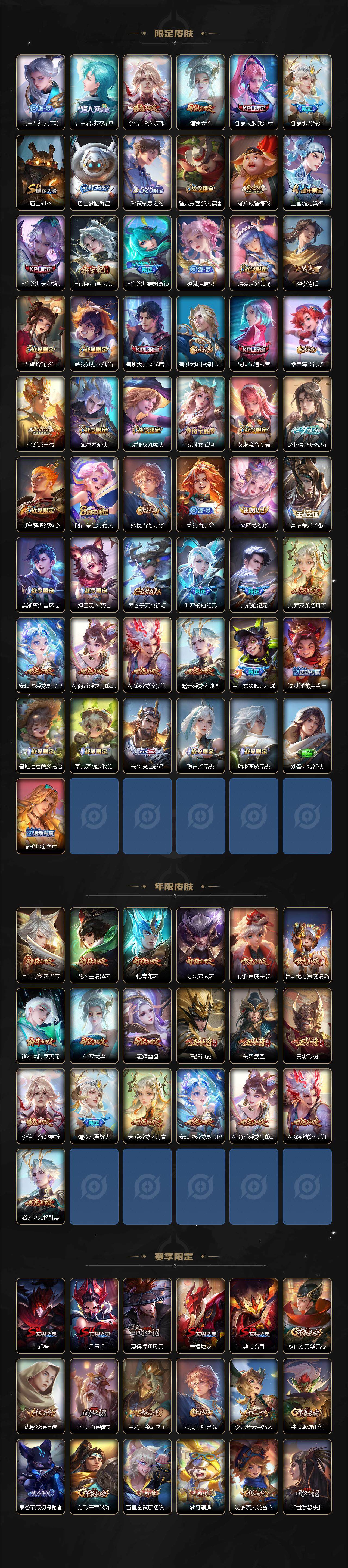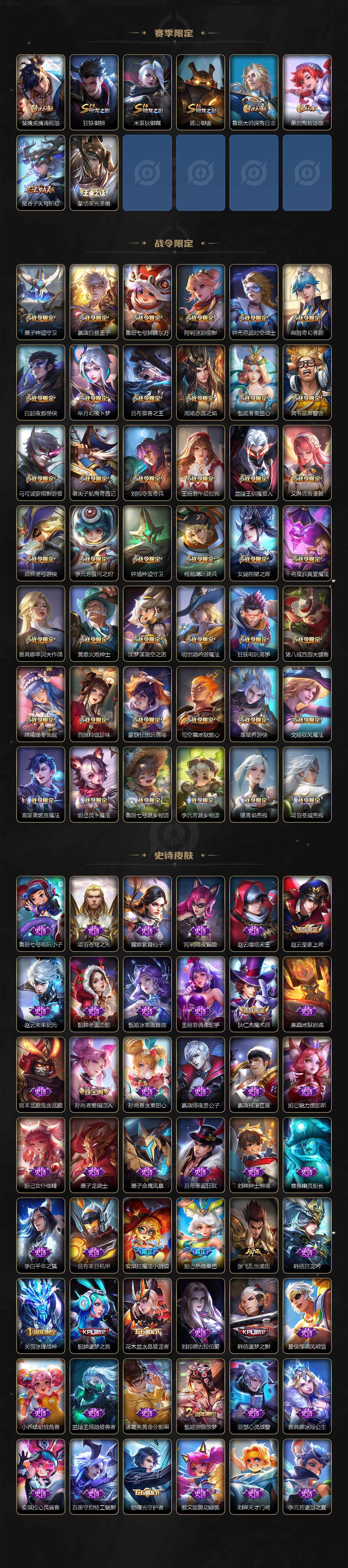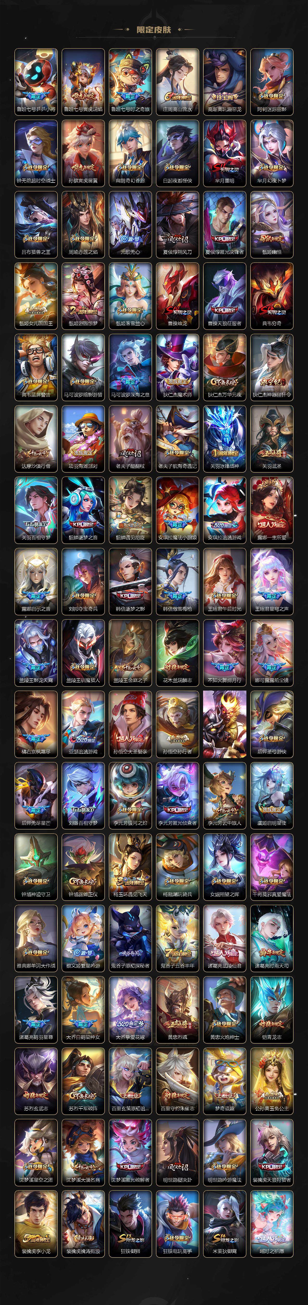 【限定皮肤】:白起狰,狄仁杰阴阳师,赵云皇家上将,赵云百木心枪,墨子神迹守卫,墨子降魔,妲己热情桑巴,妲己时之奇旅,嬴政白昼王子,孙尚香蔷薇恋人,孙尚香异界灵契,鲁班七号狮舞东方,鲁班七号乒乒小将,鲁班七号寅虎瑞焰,鲁班七号时之奇旅,庄周高山流水,高渐离玩趣恶龙,阿轲迷踪丽影,钟无艳超时空战士,孙膑寅虎展翼,扁鹊奇幻香踪,白起夜都怪侠,芈月重明,芈月幻夜卜梦,吕布猎兽之王,周瑜赤莲之焰,元歌无心,夏侯惇朔风刀,夏侯惇匿光决锋者,甄姬幽恒,甄姬女儿国国王,甄姬游园惊梦,甄姬落雪兰心,曹操烛龙,曹操天狼征服者,典韦穷奇,典韦蓝屏警告,马可波罗暗影游猎,马可波罗深海之息,狄仁杰魔术师,狄仁杰万华元夜,狄仁杰神器狴犴令,达摩沙漠行