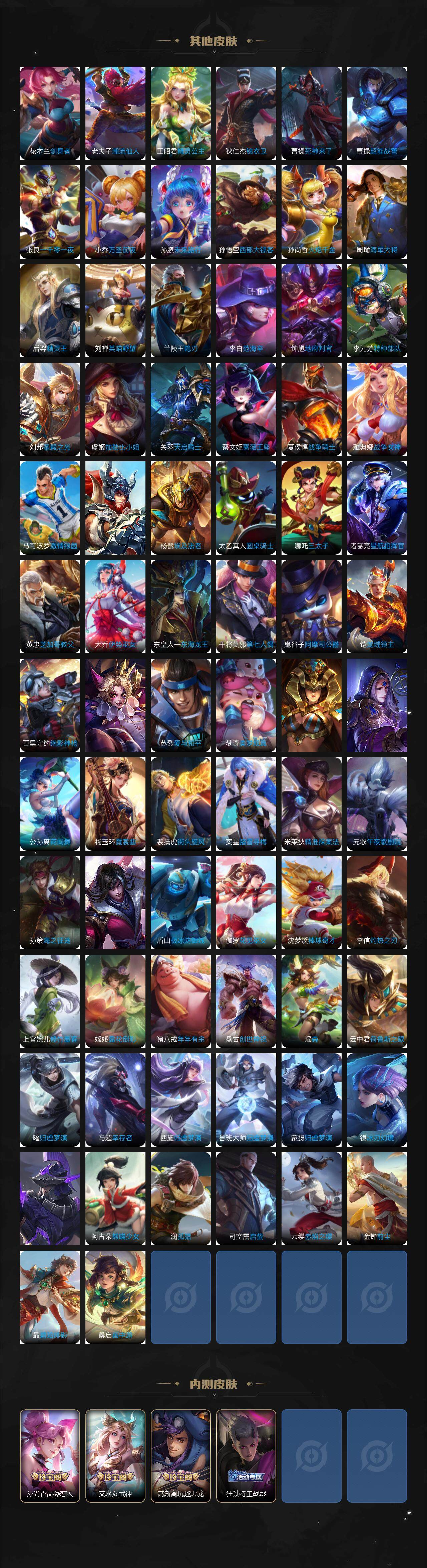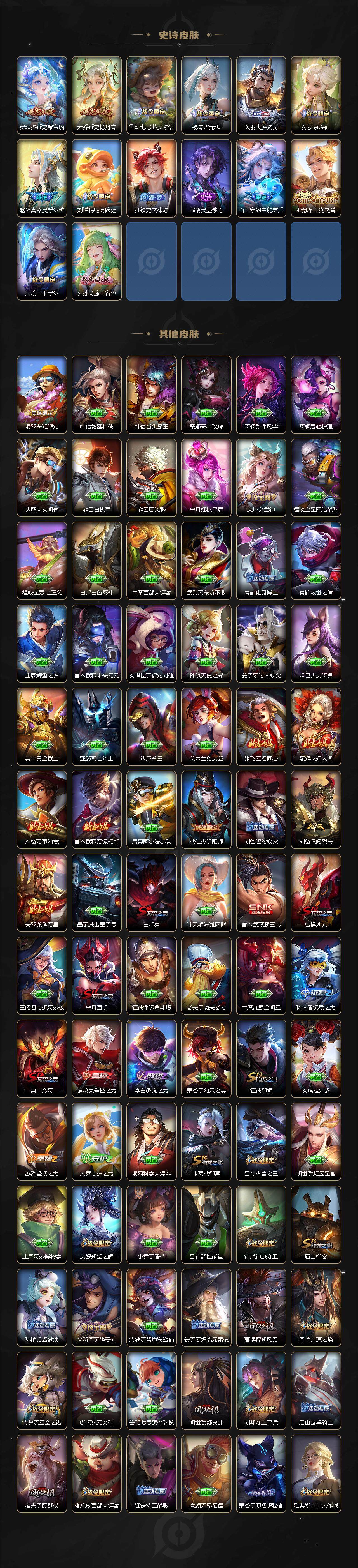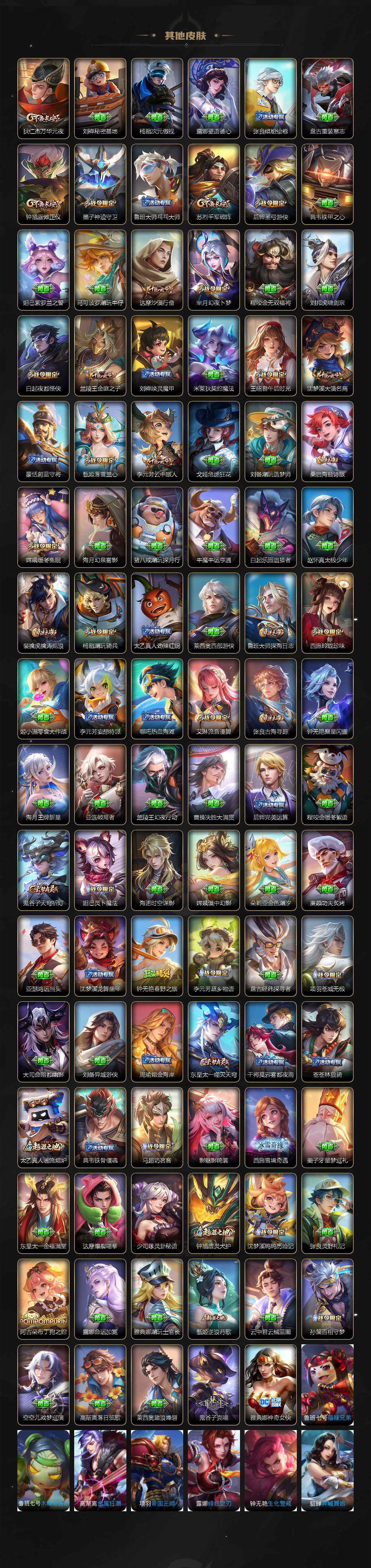 关羽冰锋战神,裴擒虎李小龙,上官婉儿梁祝,貂蝉逐梦之音,诸葛亮时雨天司,关羽武圣,黄忠烈魂,马超神威,甄姬幽恒,伽罗太华,曹操天狼征服者,裴擒虎天狼狩猎者,上官婉儿天狼绘梦者,伽罗天狼溯光者,韩信逐梦之影,铠青龙志,花木兰瑞麟志,苏烈玄武志,百里守约朱雀志,孙悟空大圣娶亲,露娜一生所爱,雅典娜神奇女侠,妲己热情桑巴,安琪拉魔法小厨娘,鲁班七号乒乒小将,大乔白鹤梁神女,猪八戒猪悟能,孙尚香异界灵契,孙悟空孙行者,甄姬女儿国国王,镜匿光追影者,韩信傲雪梅枪,鲁班七号寅虎·瑞焰,孙膑寅虎·展翼,云中君时之祈愿,瑶时之祈愿,赵云百木心枪,公孙离玉兔公主,露娜启示之音,夏侯惇匿光决锋者,后羿无尽星芒,马可波罗深海之息,金蝉唐三藏,娜可露露前尘镜,橘右京枫霜尽,鲁班大师匿光启智者,妲己时之奇旅,王昭君星穹之声,不知火舞绯月行,上官婉儿神器·万象笔,墨子降魔,李白诗剑行,兰陵王影龙天霄,桑启鸣野蒿,妲己愿照·众生和