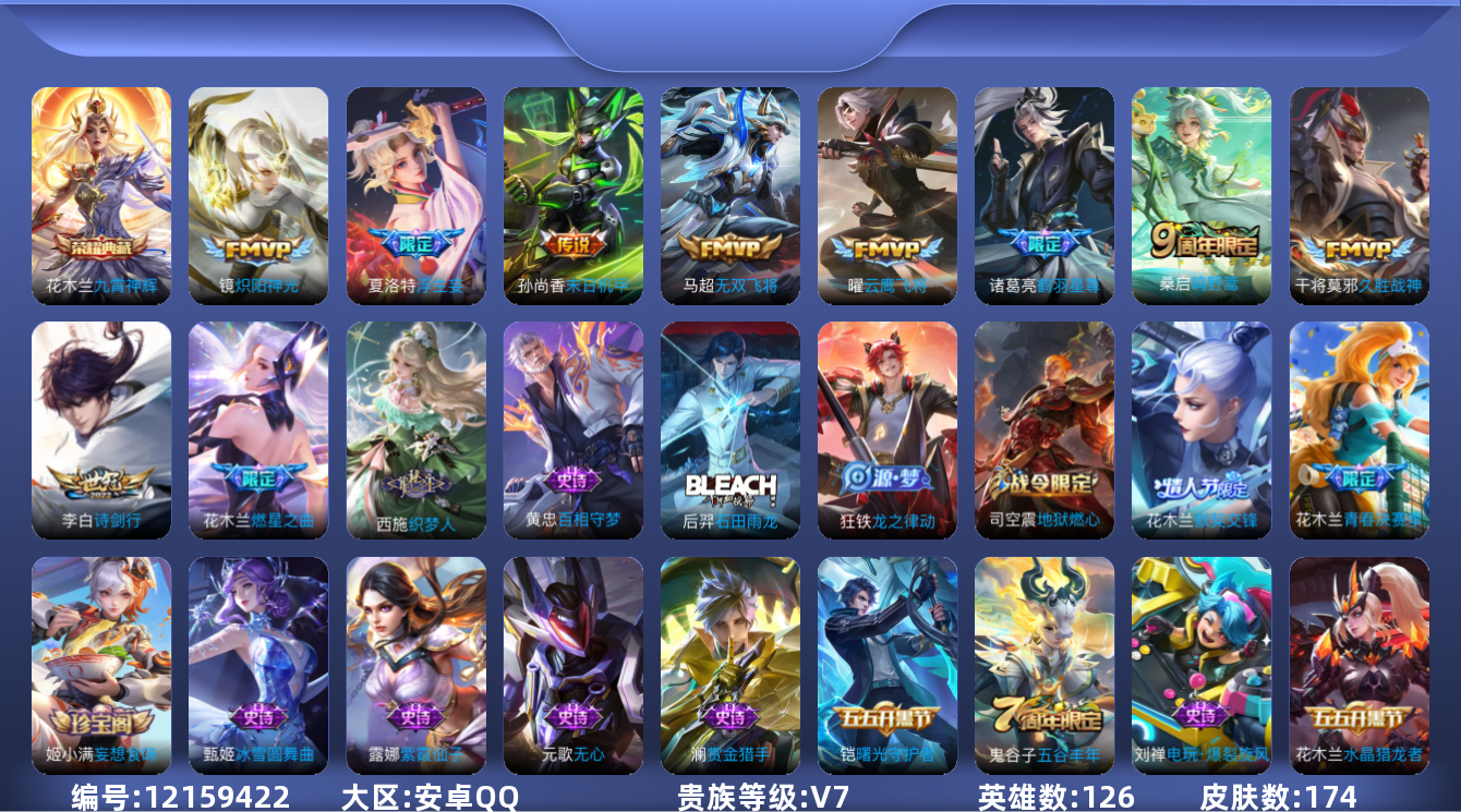 [12159422]【特价急出/详情看图】:安卓Q-V7-至尊星耀V段位-126英雄-174皮肤-1典藏-0珍品传说-10传说-57史诗