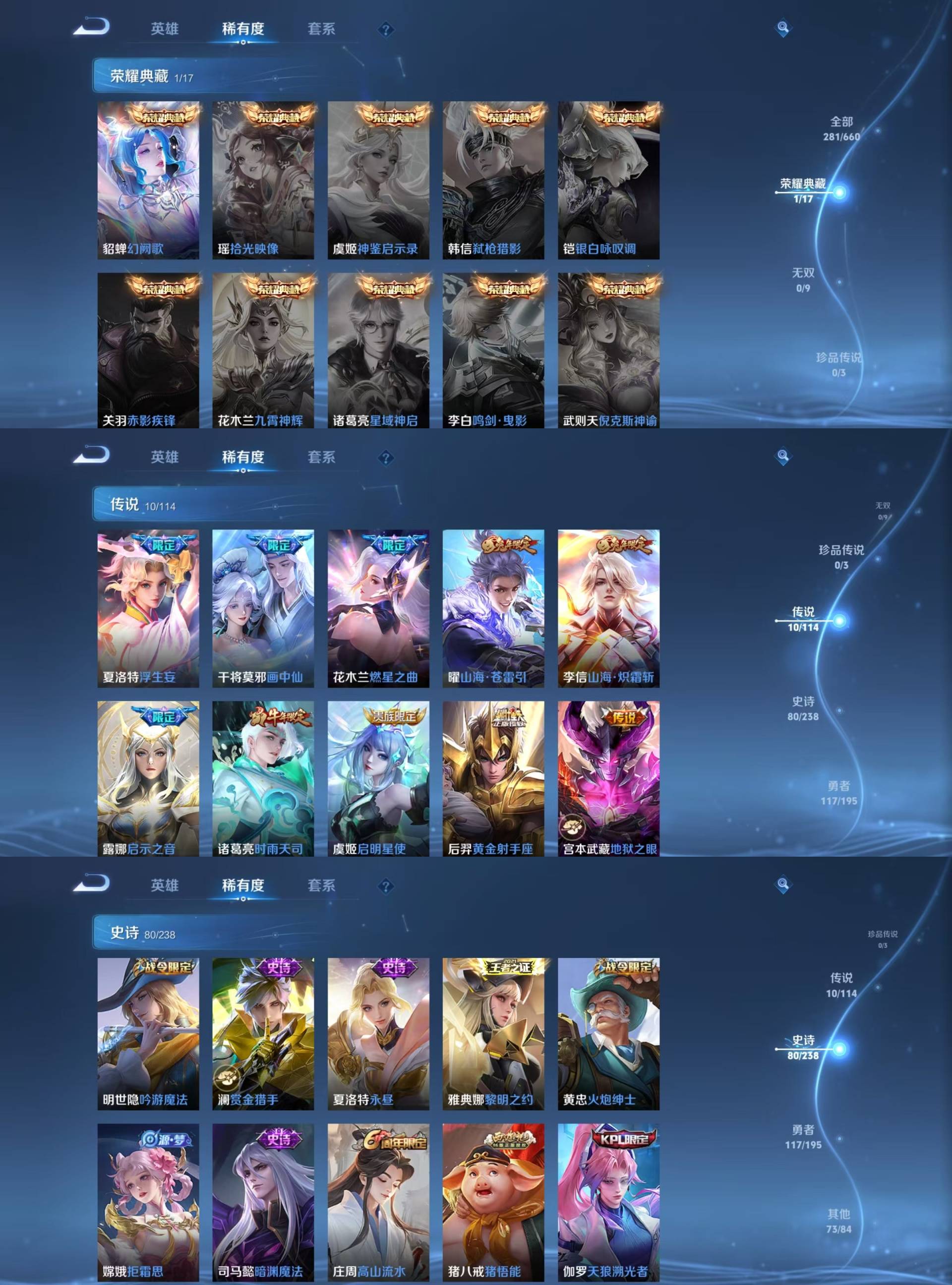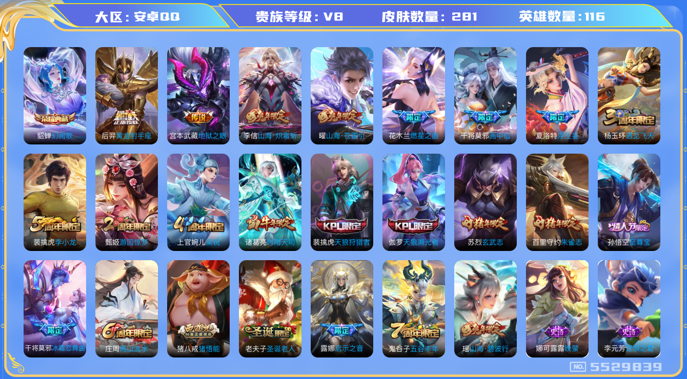 - [11863960]V7 1典藏 9传说 125英雄 272皮肤 可修改实名 优质装备:弑枪猎影(韩信典藏),黄金狮子座,黄金射手座,末日机甲-孙尚香(绿蚂蚱),零号·赤焰,超时空战士-狄仁杰,涂山容容 珍宝阁皮:妄想食味,蔷薇恋人 限定皮:愿照·岁时盈(虞姬年限),愿照·山河定(司空震年限),鸣野蒿,至尊宝,白晶晶,高山流水,五谷丰年,游园惊梦,梁祝,岱宗(典韦年限),李小龙,天魔缭乱,冰霜恋舞曲 史诗皮:鸭鸭历险记-刘禅,器灵·浮梦炉,狼魂孤将,星界战将,龙之律动,石田雨龙,怒海争锋,蔬乡物语(鲁班七号),百相守梦-百里守约,百相守梦-黄忠,苍穹之光,电玩小子(小书包),白龙吟,黄金分割率,特工魅影,永昼,末日机甲-莱西奥,魅语,高渐离燃音魔法,无限星赏官,偶像歌手,晚萤,猫狗日记-孙策,乱世虎臣,节奏热浪,女仆咖啡,摇滚巨星,水果甜心,绅士熊喵,星夜王子,心灵骇客,功夫厨神,德古拉伯爵,暗隐猎兽者,幽灵船长,鬼剑武藏,暗渊魔法,乐园奇幻夜,天秀·启明,地狱岩魂,纤云弄巧,繁星吟游(呼啦呼啦),拒霜思,缤纷独角兽,乘风破浪,逐浪之夏,水晶猎龙者,曙光守护者,箭羽风息,金属风暴,原初追逐者,圣诞狂欢,圣诞恋歌,鹰眼统帅,魅力维加斯,黎明之约,赏金猎手,奇遇舞章,未来纪元-赵云