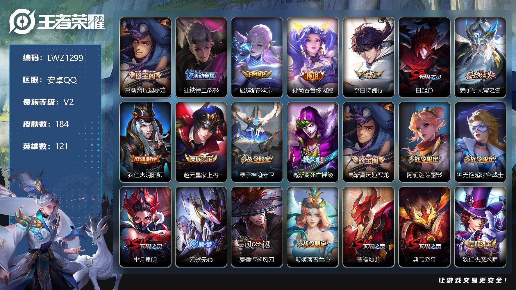[12037220]【暑期末清货/特价急出/永久包赔/商品详情看图】:安卓Q-V6-至尊星耀IV段位-121英雄-184皮肤-3传说-34史诗【传说皮肤】:孙尚香音你闪耀,李白诗剑行,貂蝉猫影幻舞【战令限定】:墨子神迹守卫,阿轲迷踪丽影,钟无艳超时空战士,甄姬落雪兰心,老夫子航海奇遇记,刘邦夺宝奇兵,后羿圣弓游侠,杨戬潮玩骑兵,干将莫邪真爱魔法,雅典娜单词大作战,蒙犽狂想玩偶喵
