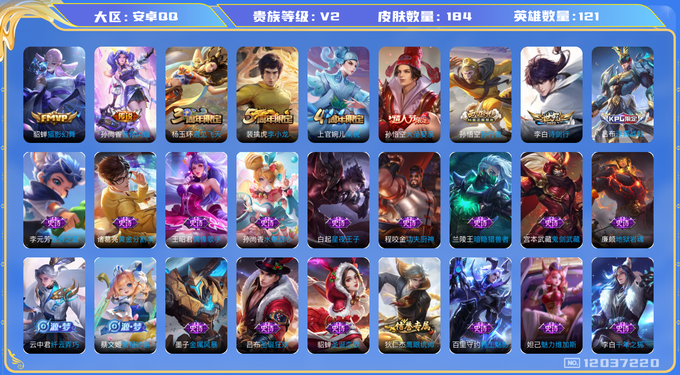- PX_2074615-37 安卓QQ/永恒钻石/251皮肤/124英雄/1典藏/0珍品无双/0无双/3珍品传说/23传说/66史诗/9稀有英雄 【3 珍品传说】怪盗基德 马可波罗,器灵·落星盏 嫦娥,江户川柯南 鲁班七号, 【1 典藏皮肤】拾光映像 瑶, 【23 传说皮肤】胖达荣荣 梦奇,启明星使 虞姬,夜礼服假面 狄仁杰,神器·狴犴令 狄仁杰,游龙清影 西施,祈雪灵祝 公孙离,一念神魔 李信,山