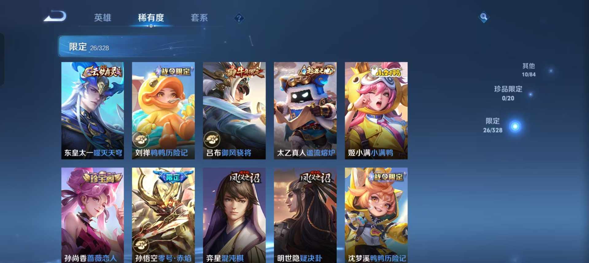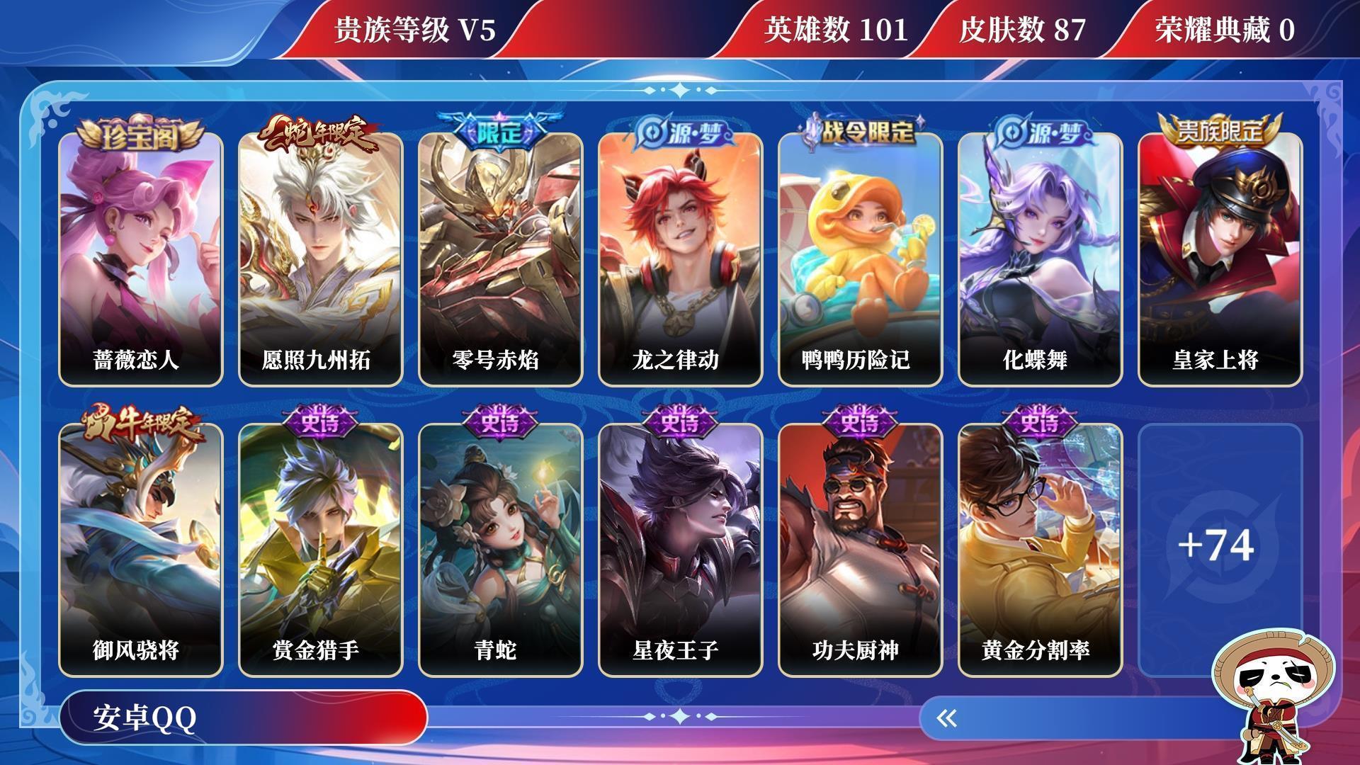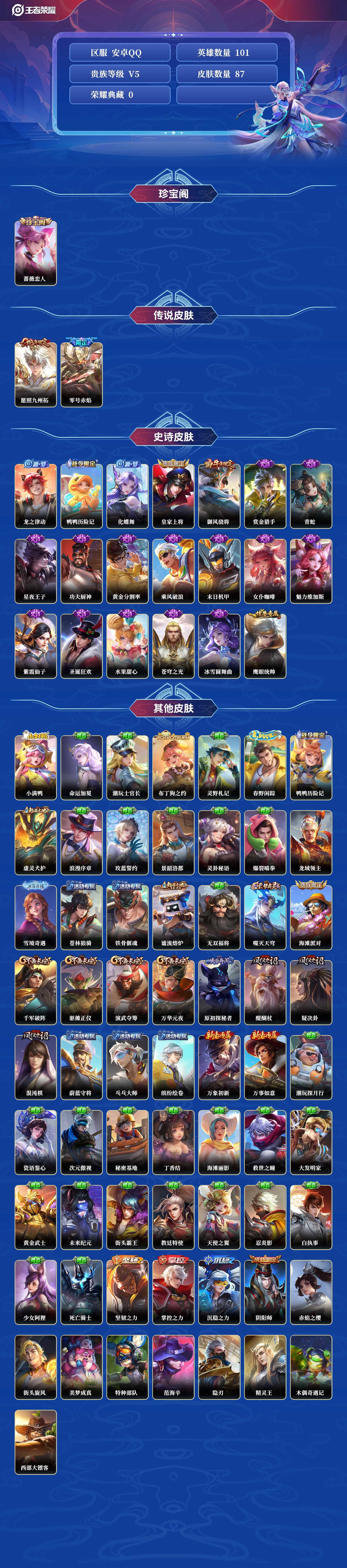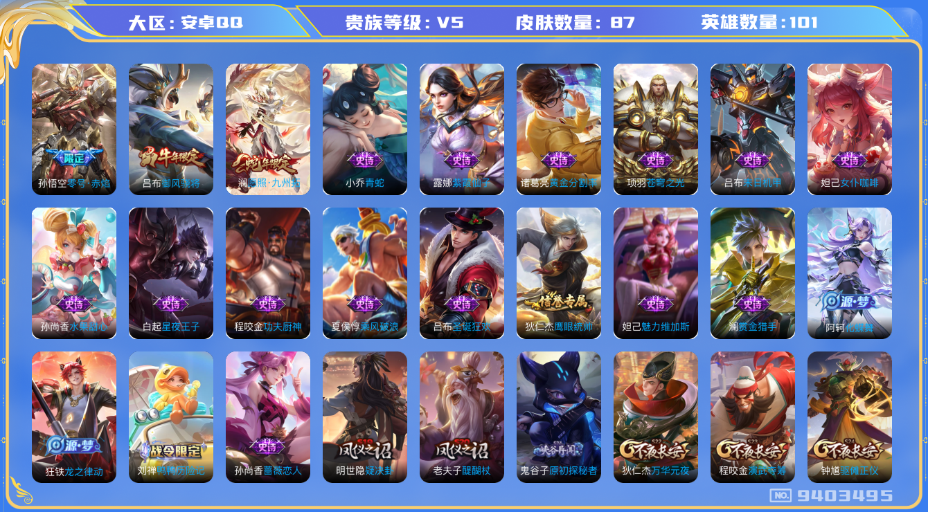 [9403495]贵族V5 传说皮肤2 史诗皮肤21 皮肤数量87 皮肤价值:55748 英雄101 非凡王者